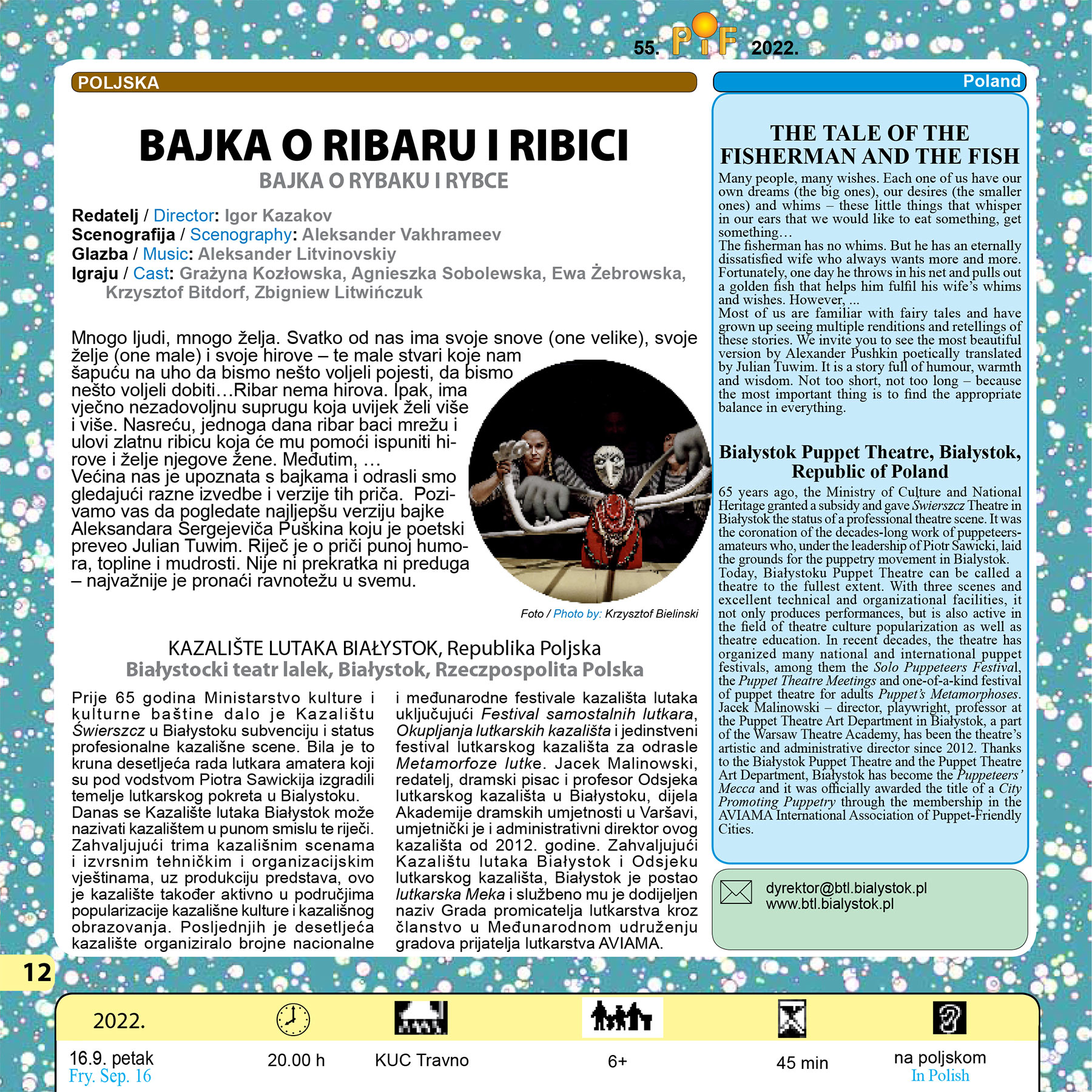 Białostocki Teatr Lalek weźmie udział w 55. Międzynarodowym Festiwalu Teatrów Lalek PIF w Zagrzebiu (Chorwacja) ze spektaklem Bajka o rybaku i rybce w reż. Igora Kazakova.