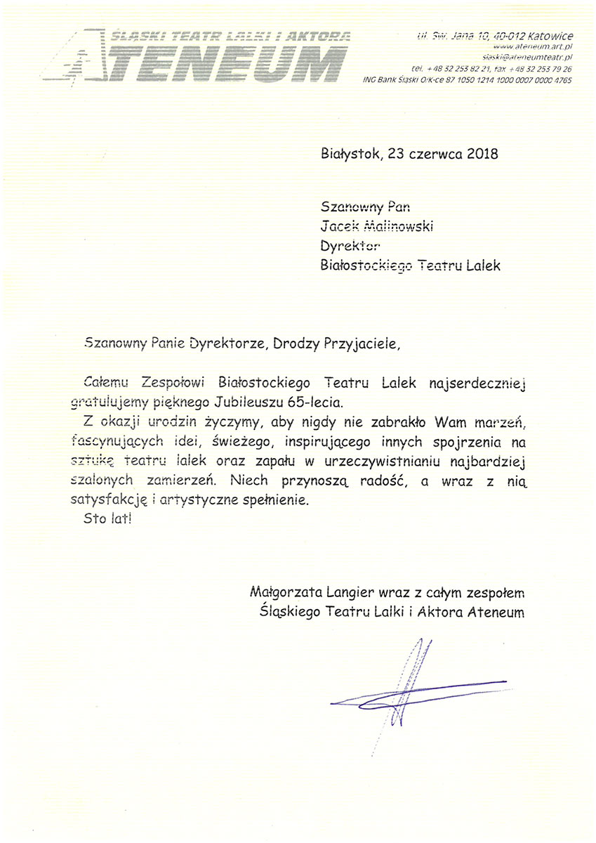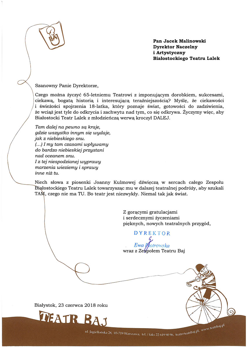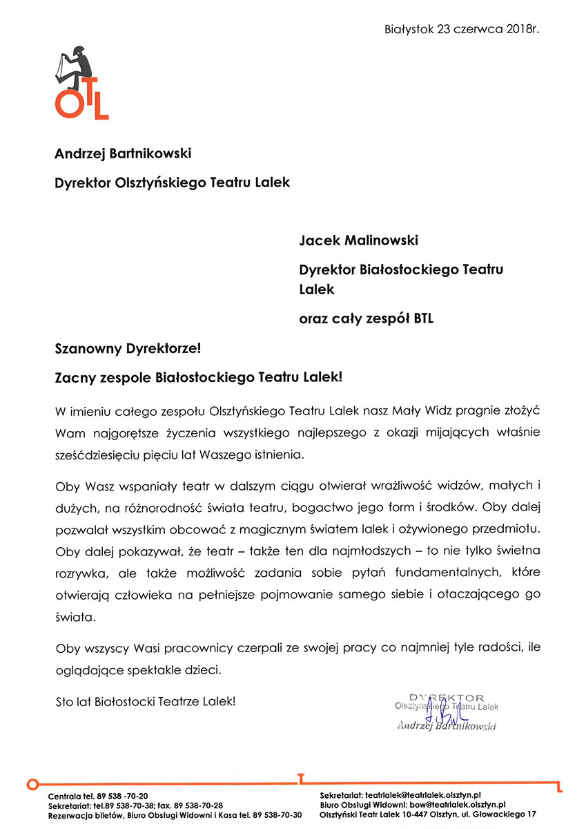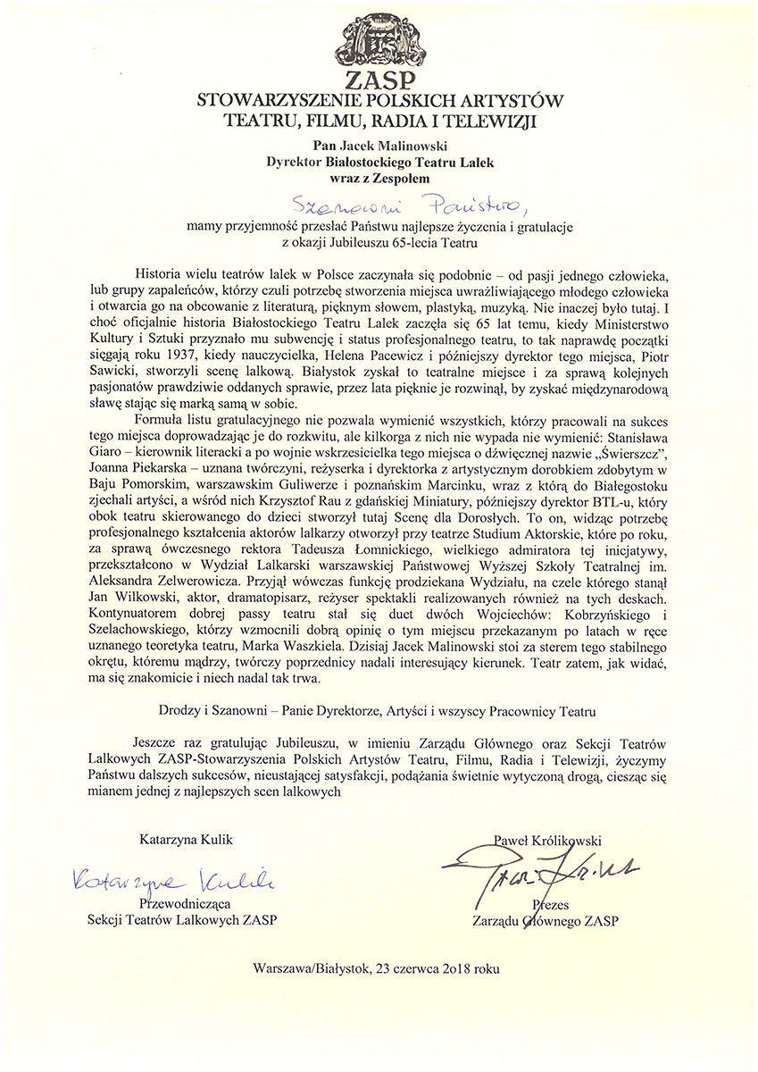 W ramach jubileuszowych wystąpień głos zabrali: Tadeusz Truskolaski - Prezydent Miasta Białegostoku, Waldemar Wolański - Prezydent Polskiej Sekcji Teatrów Lalkowych POLUNIMA, Maria Wilma - reprezentantka Związku Artystów Scen Polskich ZASP oraz Konrad Szczebiot z AICT Sekcji polskiej Międzynarodowego Stowarzyszenia Krytyków Teatralnych. Gratulacje oraz życzenia wielu wspaniałych pomysłów artystycznych złożyli Ewa Piotrowska - Dyrektorka warszawskiego Baja, Andrzej Bartnikowski - Dyrektor Olsztyńskiego Teatru Lalek, Zbigniew Prażmowski - Dyrektor Teatru Lalki i Aktora w Wałbrzychu, Janusz Jasiński - Dyrektor Wrocławskiego Teatru Lalek oraz Renata Chudecka - kierownik literacki Śląskiego Teatru Lalki i Aktora Ateneum w Katowicach.