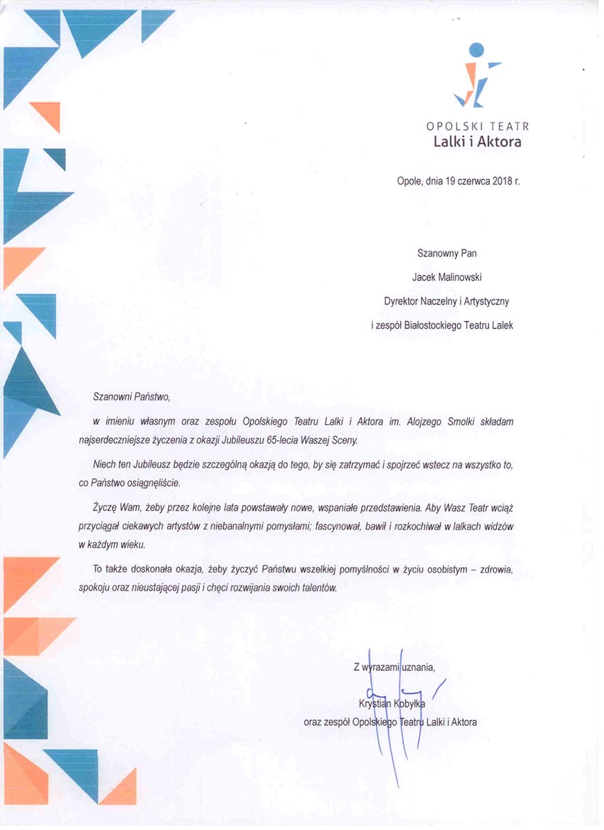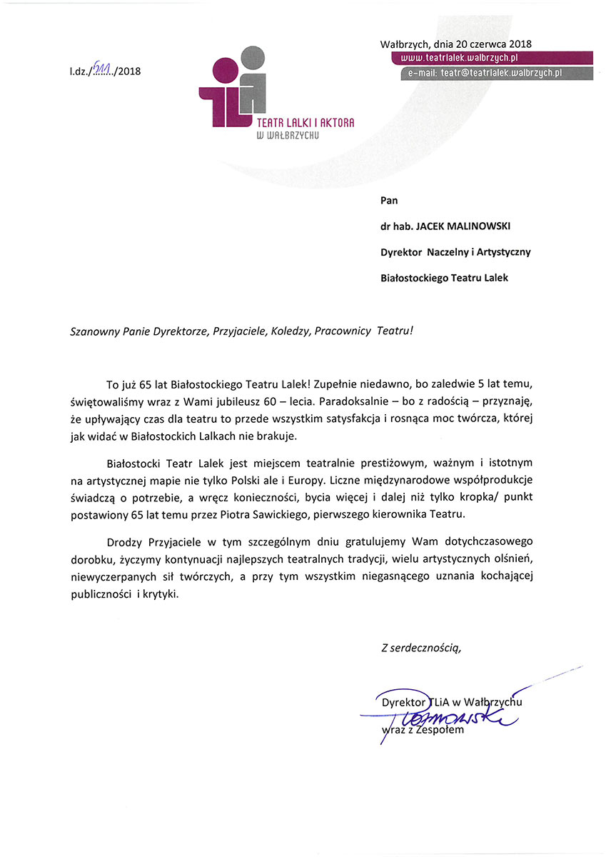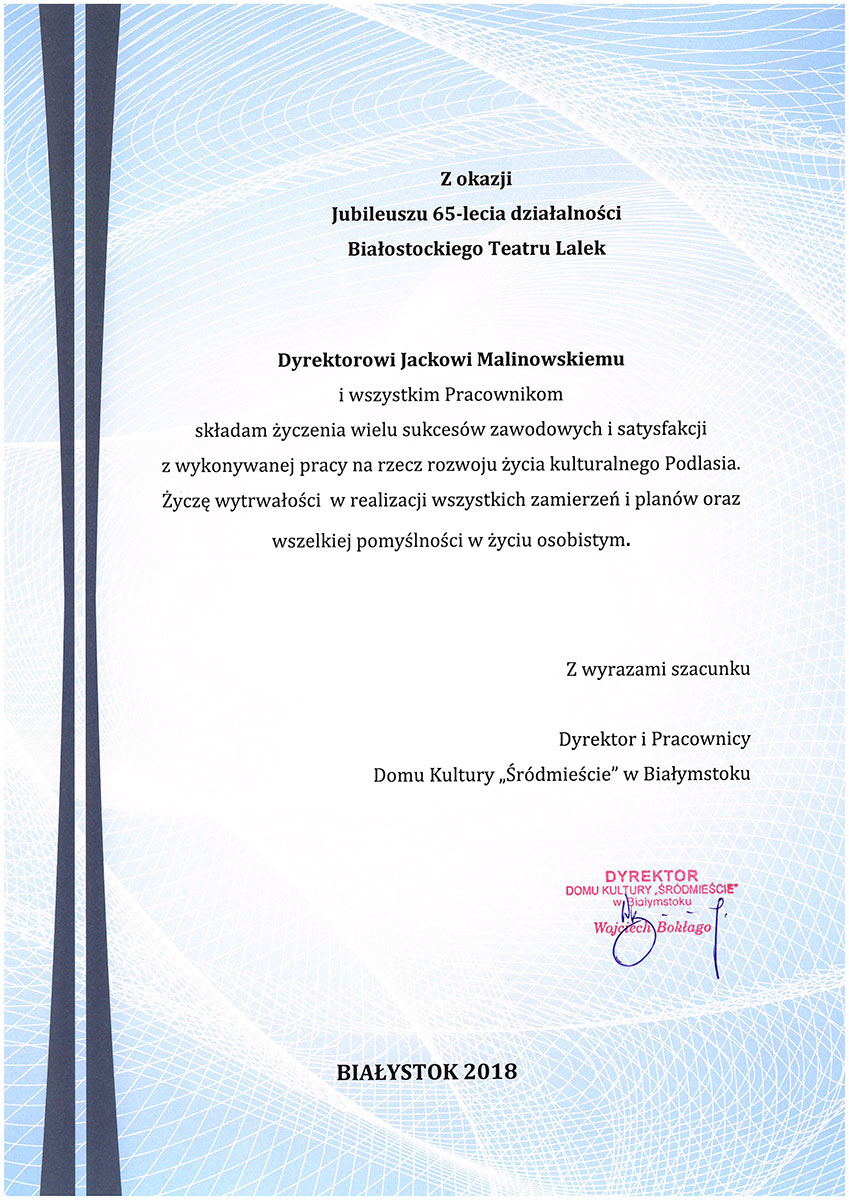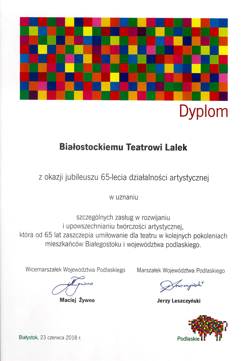 Jeden z najlepszych i najbardziej cenionych teatrów lalkowych w Polsce - Białostocki Teatr Lalek - świętuje w tym roku 65 urodziny. Uroczystości jubileuszowe odbyły się w minioną sobotę w siedzibie Teatru przy ul. Kalinowskiego, na zakończenie 9. Międzynarodowego Festiwalu Szkół Lalkarskich LALKANIELALKA. Podczas uroczystości wręczono m.in. medale "Zasłużony Kulturze Gloria Artis" przyznawane przez Ministra Kultury i Dziedzictwa Narodowego oraz Odznaki Honorowe Województwa Podlaskiego.