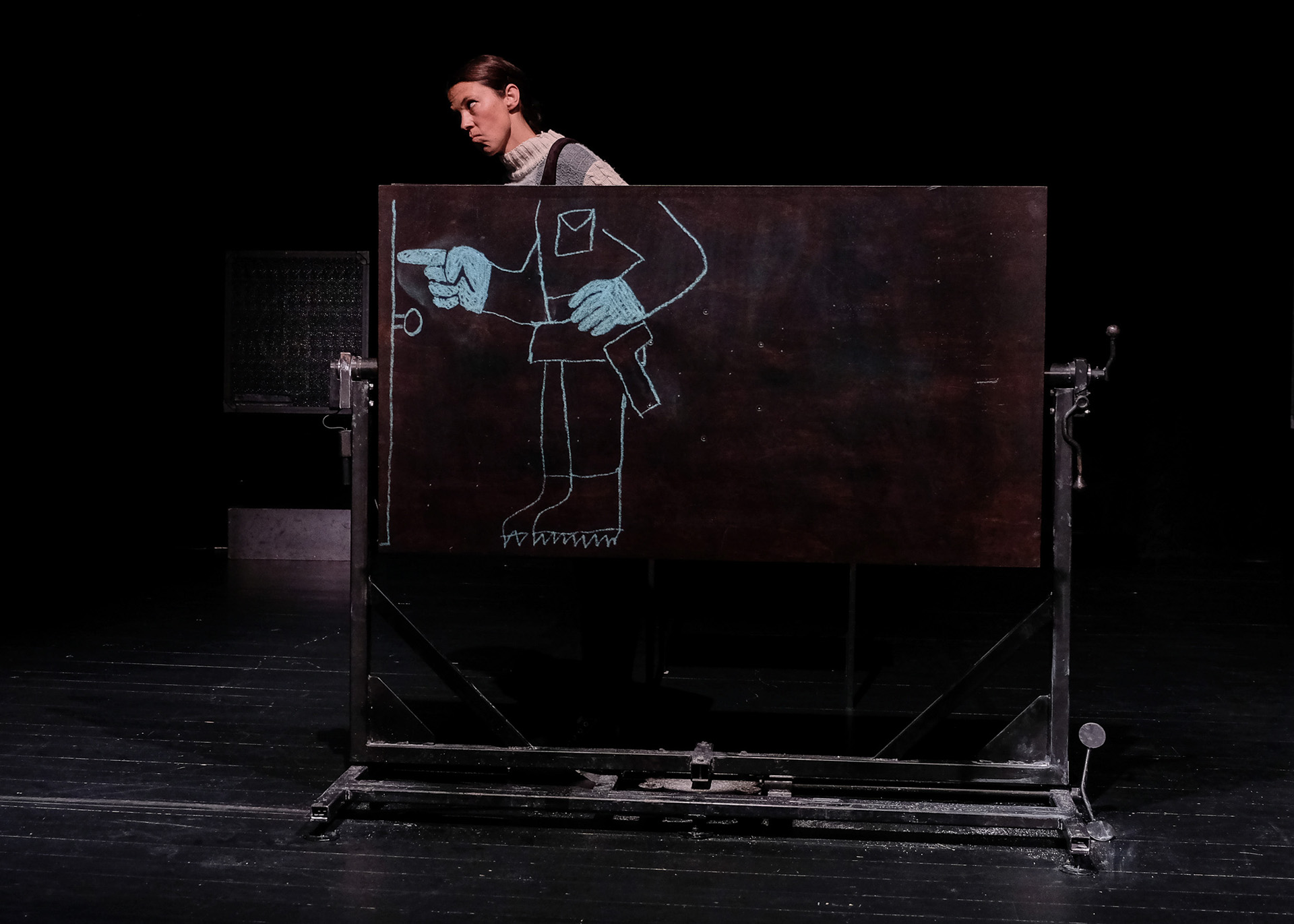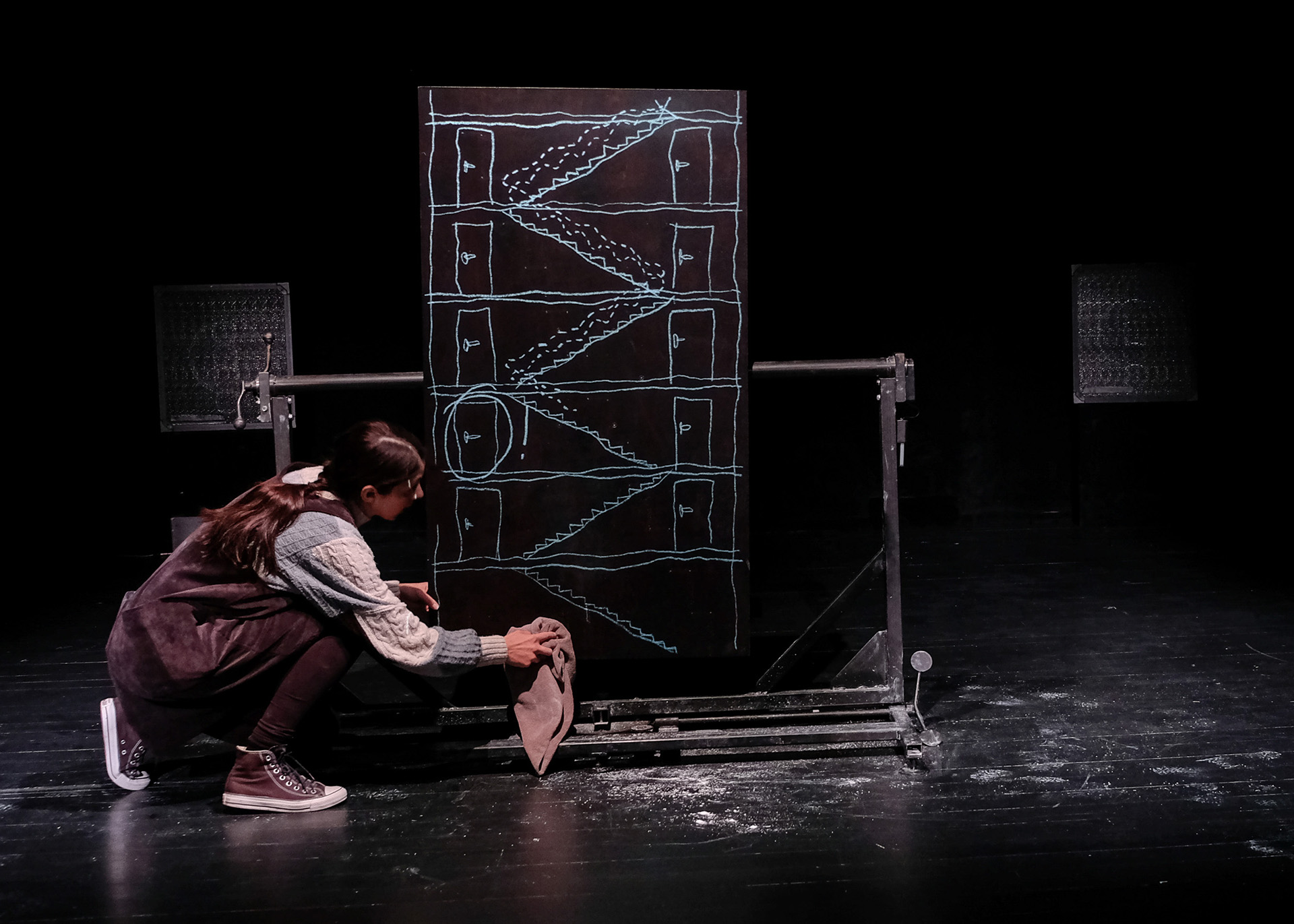 Na scenie jedna aktorka, stół, gąbka z wodą, kreda, szczypta mąki. I światło. Stół zmienia się w tablicę, na której prostą kreską, kilkoma ruchami można namalować pieska i dziewczynkę. I nie byłoby w tym nic nadzwyczajnego, gdyby nie to, że tych dwoje nagle ożywa. Dziewczynka wyrywa się spod kredy, raz jest rysunkiem, za chwilę dziewczynką jest aktorka, która opowiada tę historię, w następnym momencie mamy lalkę rozdwojoną (jedną część stanowi "żyjący" rysunek żołnierzy walących do drzwi, drugą - górna część ciała aktorki).