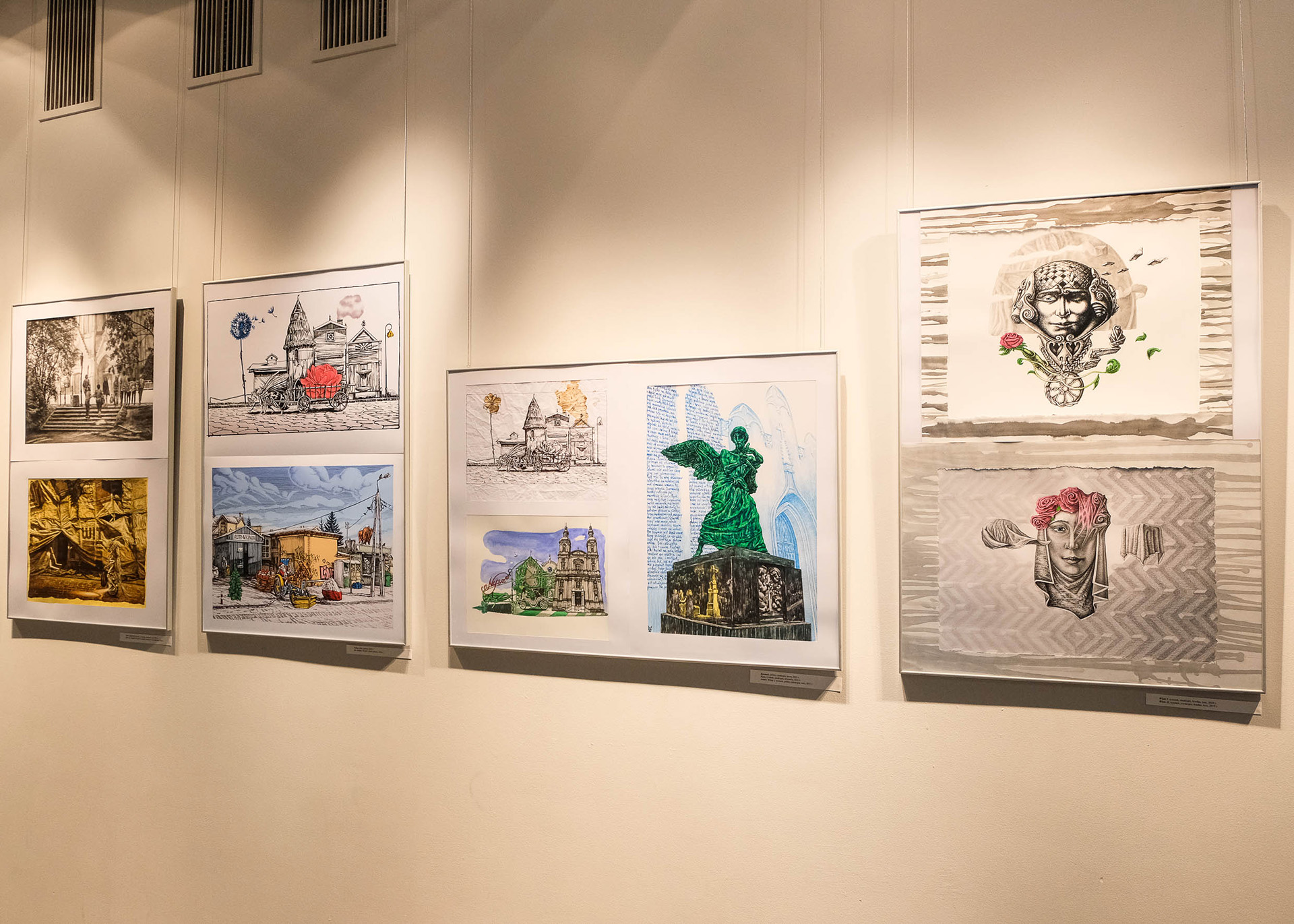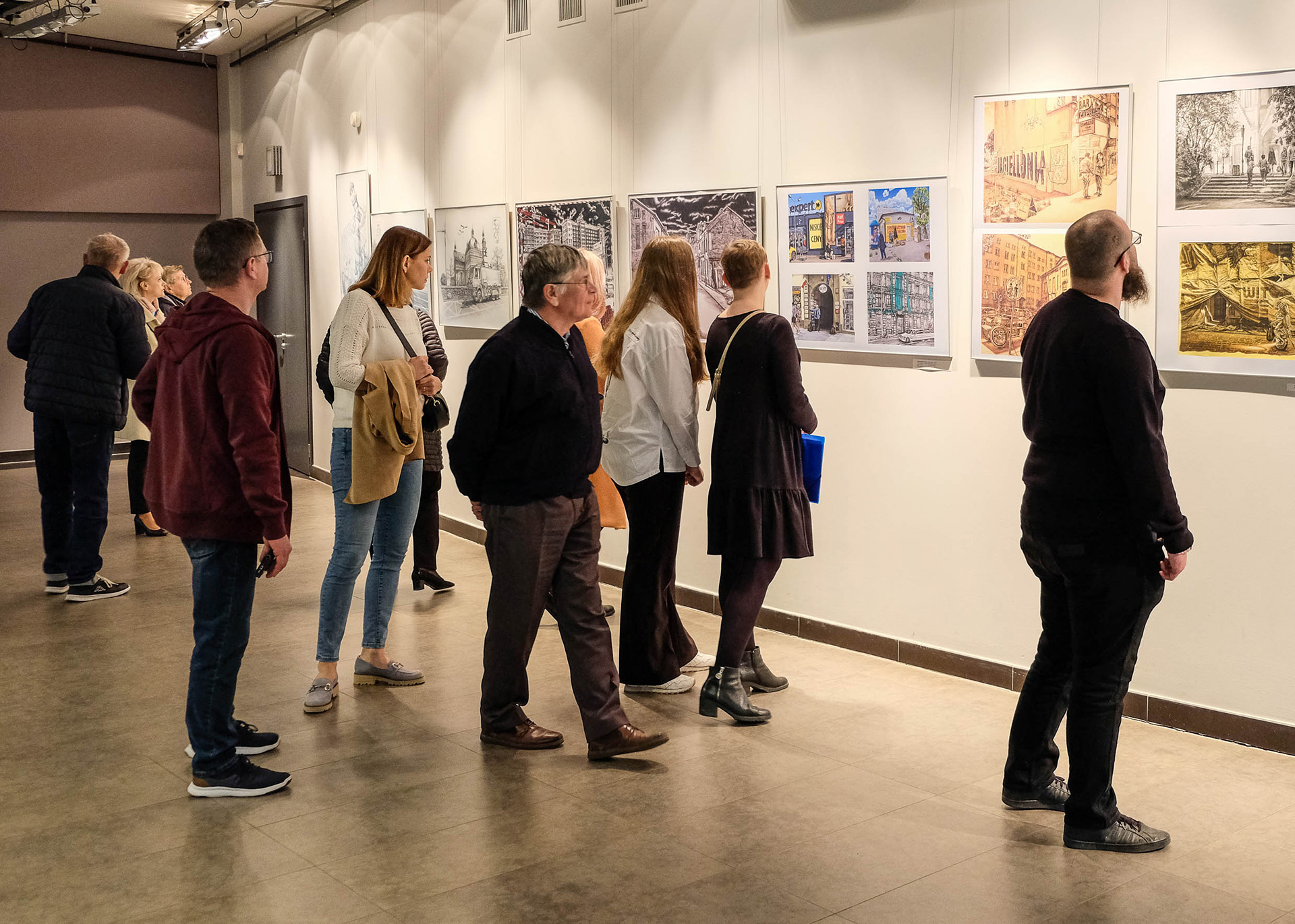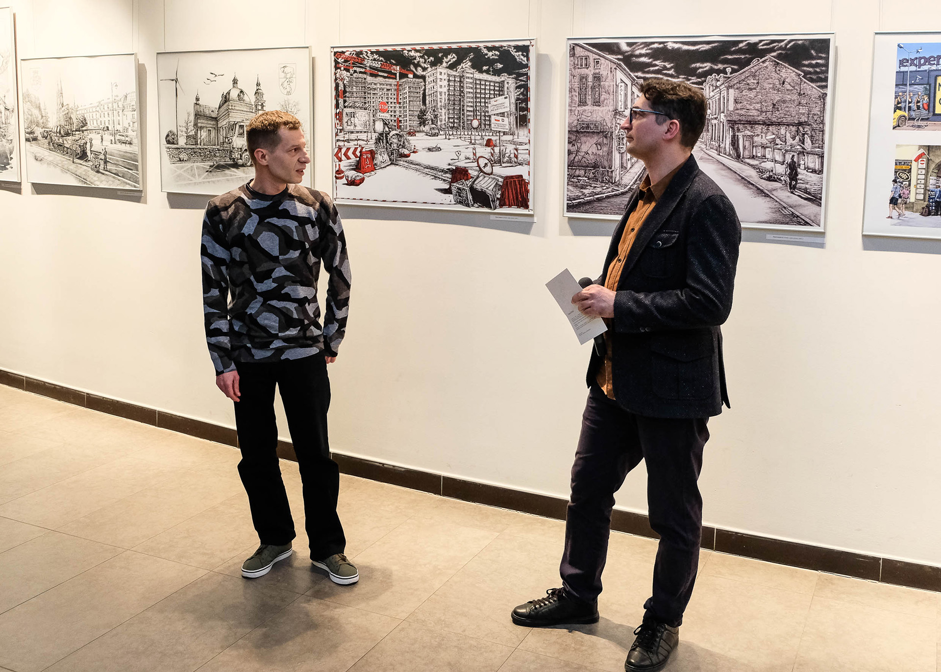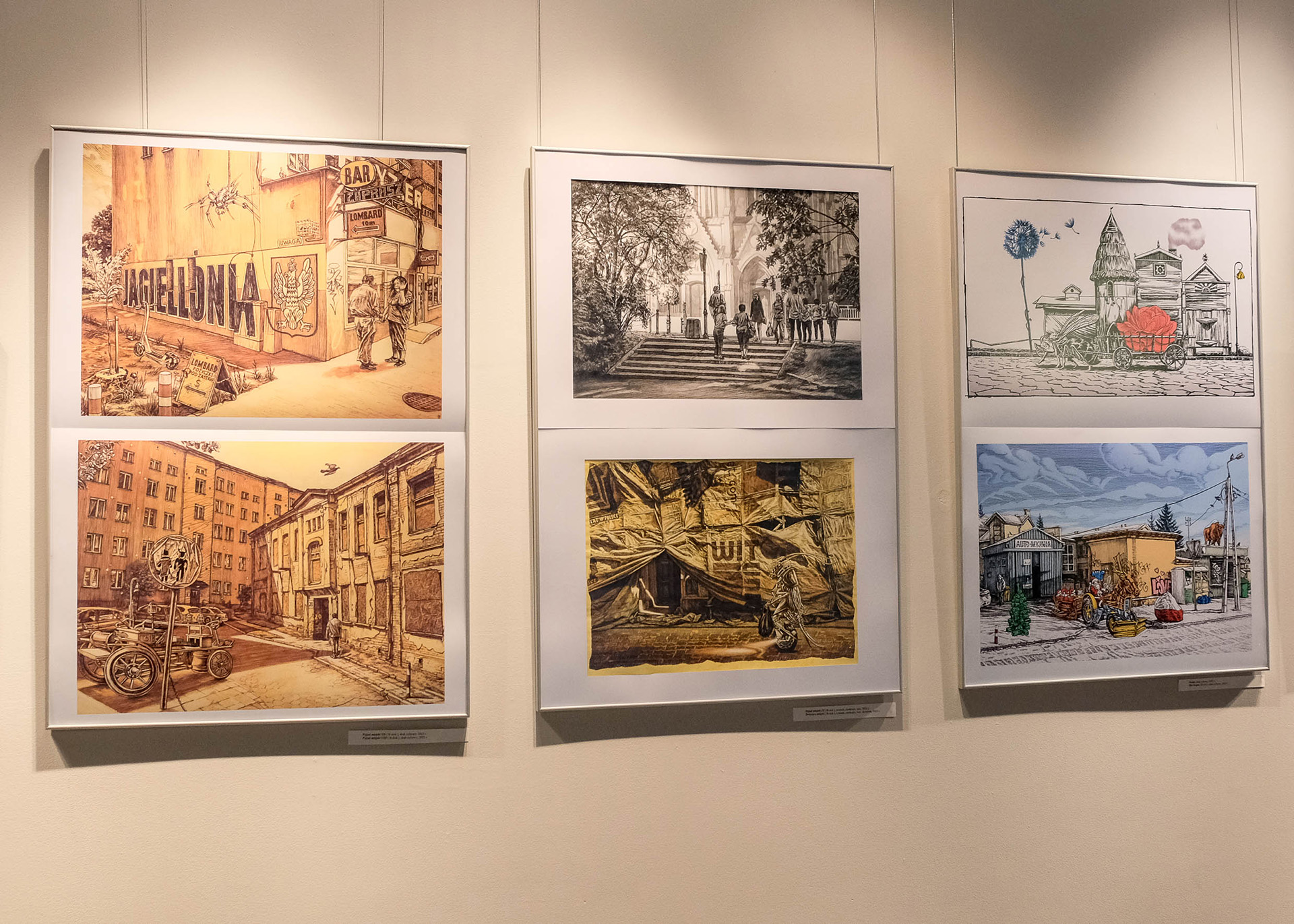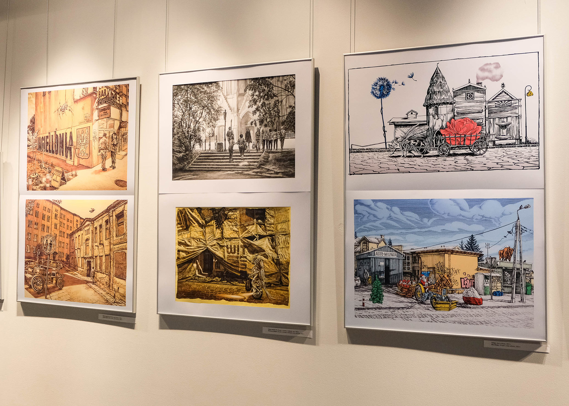 Wiodącym tematem wystawy jest pejzaż miejski inspirowany realnymi miejscami.
