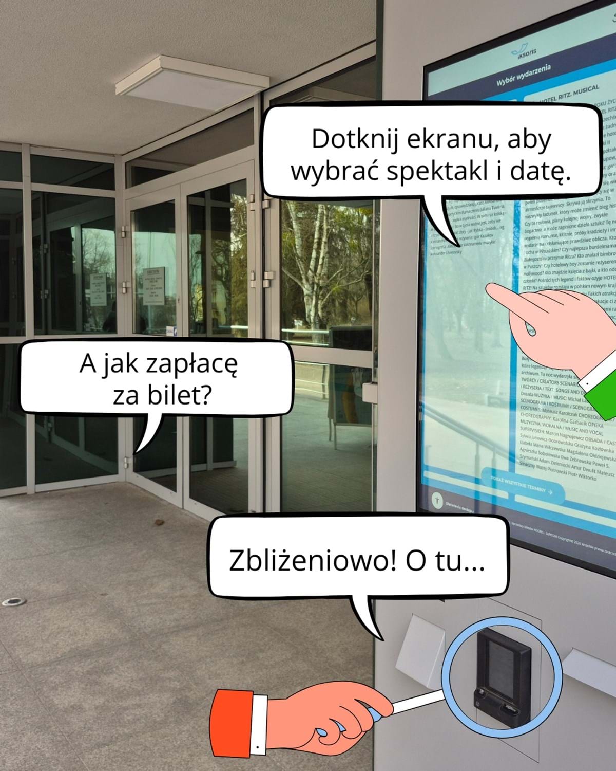 Polecamy Wam korzystanie z biletomatu w szczególności, gdy kasa teatru jest nieczynna albo przed okienkiem tłoczy się kolejka. Śmiało możecie kupić bilety, także o 5:00 rano, kiedy wracacie ze spaceru z psem.