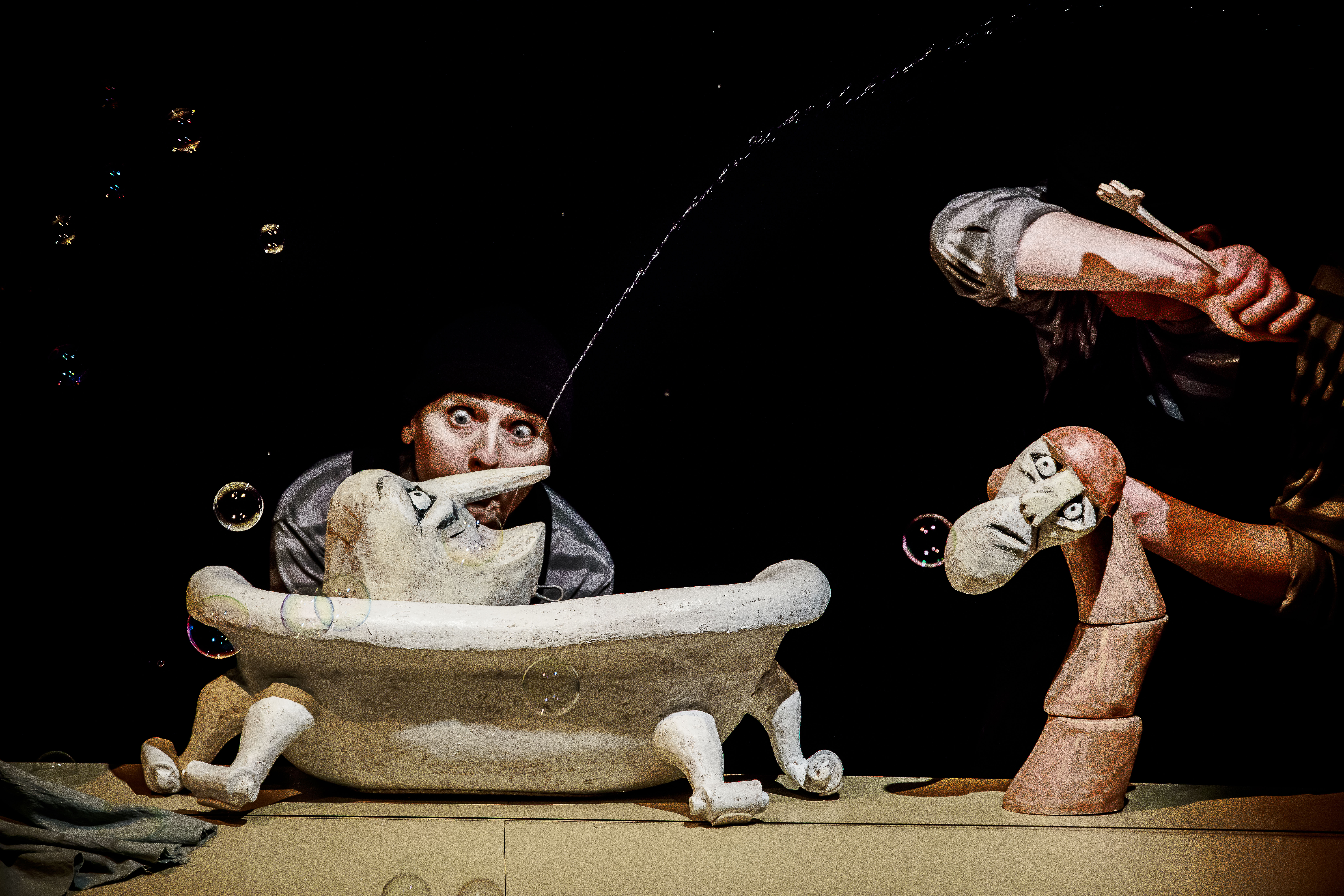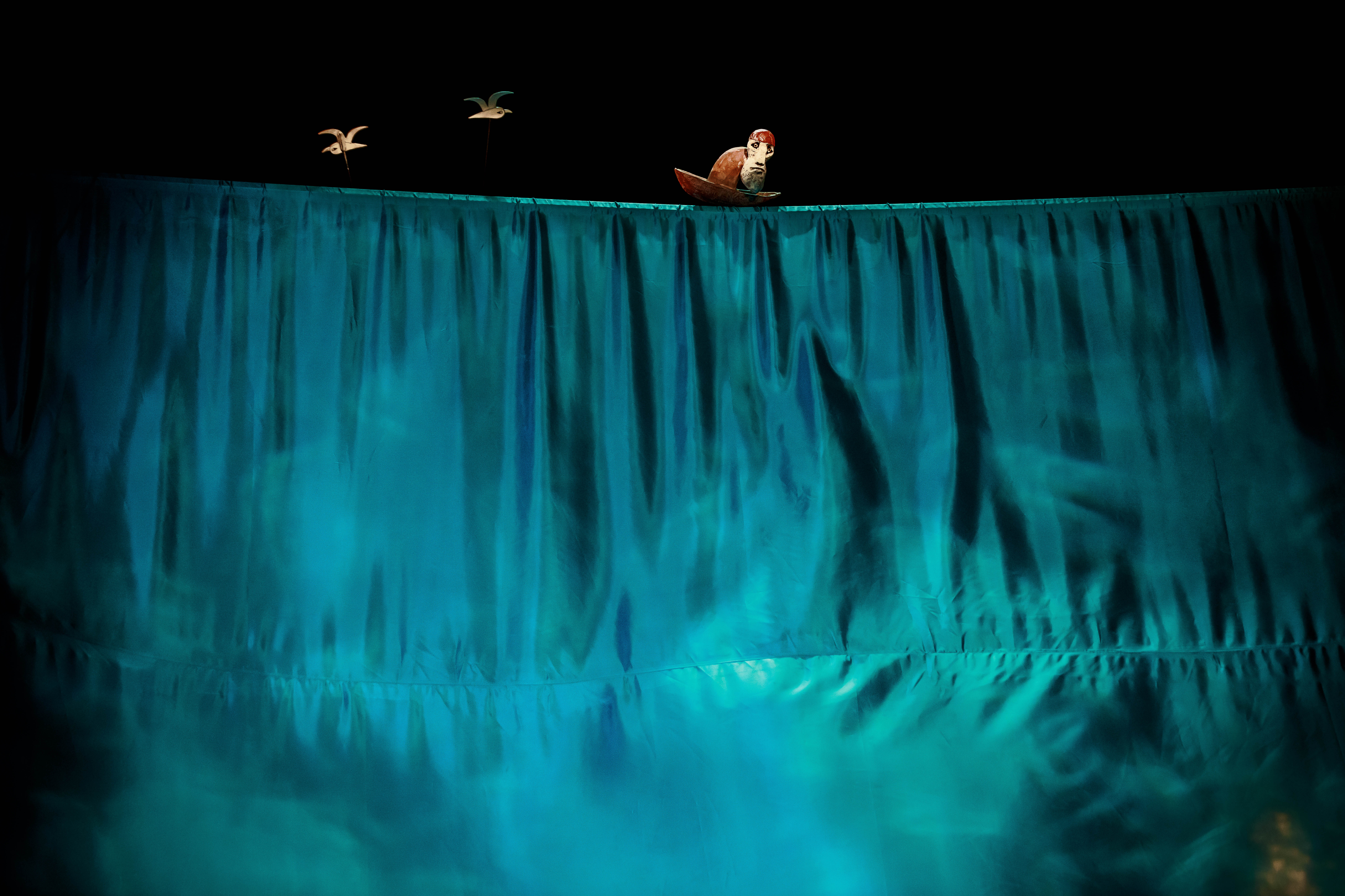 Wiele w tej adaptacji humoru – choćby wstęp do spektaklu. Aktorzy zwykle animują lalki, trzymając je przed sobą (co też jest atrakcją: obserwowanie min animatorów to prawdziwe przedstawienie). Ale czasem grają też w żywym planie – jak właśnie w początkowej scenie. Przybywa jeden wędkarz, zarzuca przynętę. Za chwilę drugi, trzeci, czwarty, piąty. Każdy ma swoje miejsce w szeregu, każdy zna swoją hierarchię, a z tej wynika też rozmiar wędki. Chwilę po scenie w żywym planie – całkowita miniaturyzacja – teraz rybak zmniejsza się do rozmiarów palca. Za moment – zwiększa się dwukrotnie. I tak na przemian, tu bowiem niespodzianka goni niespodziankę.