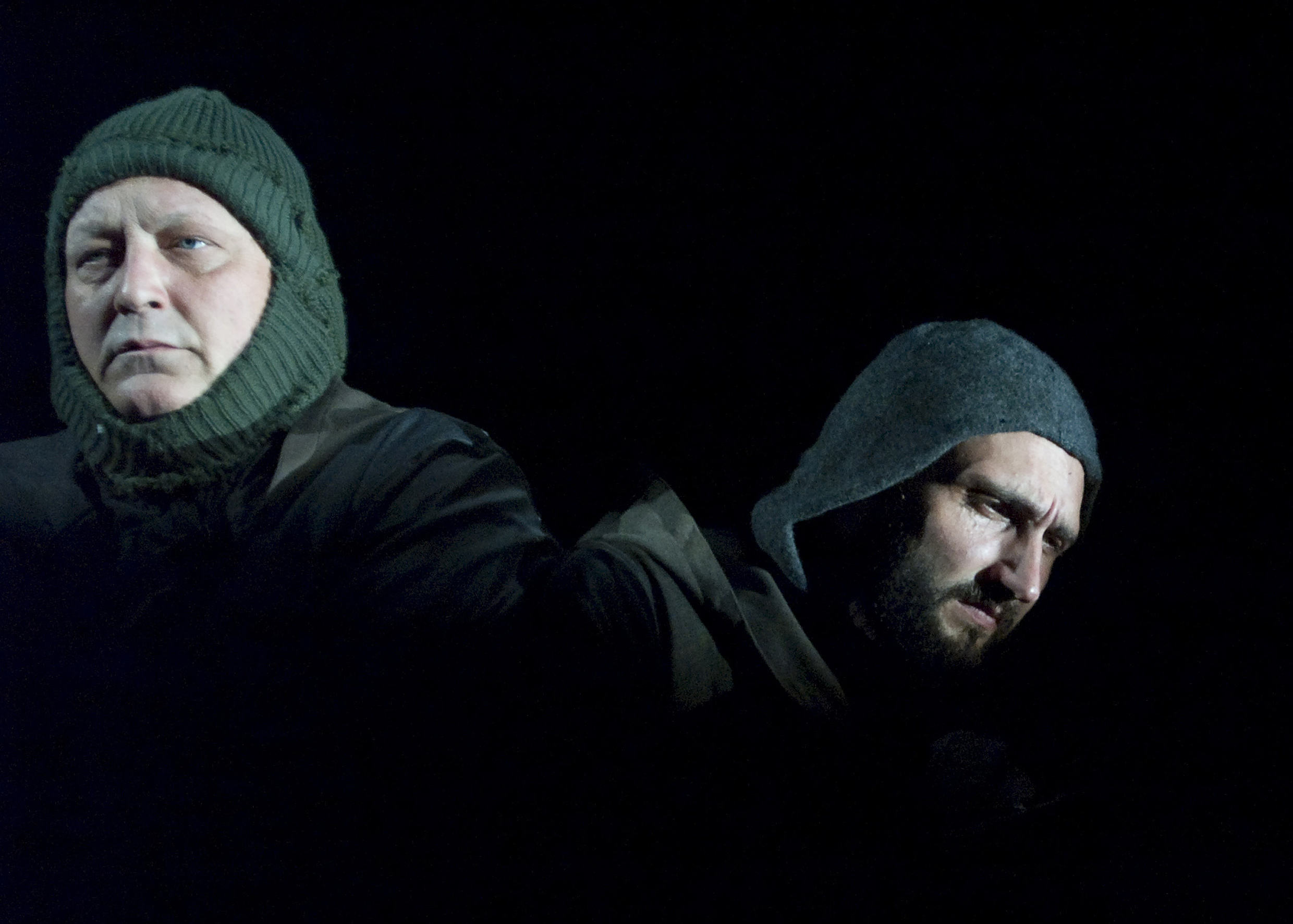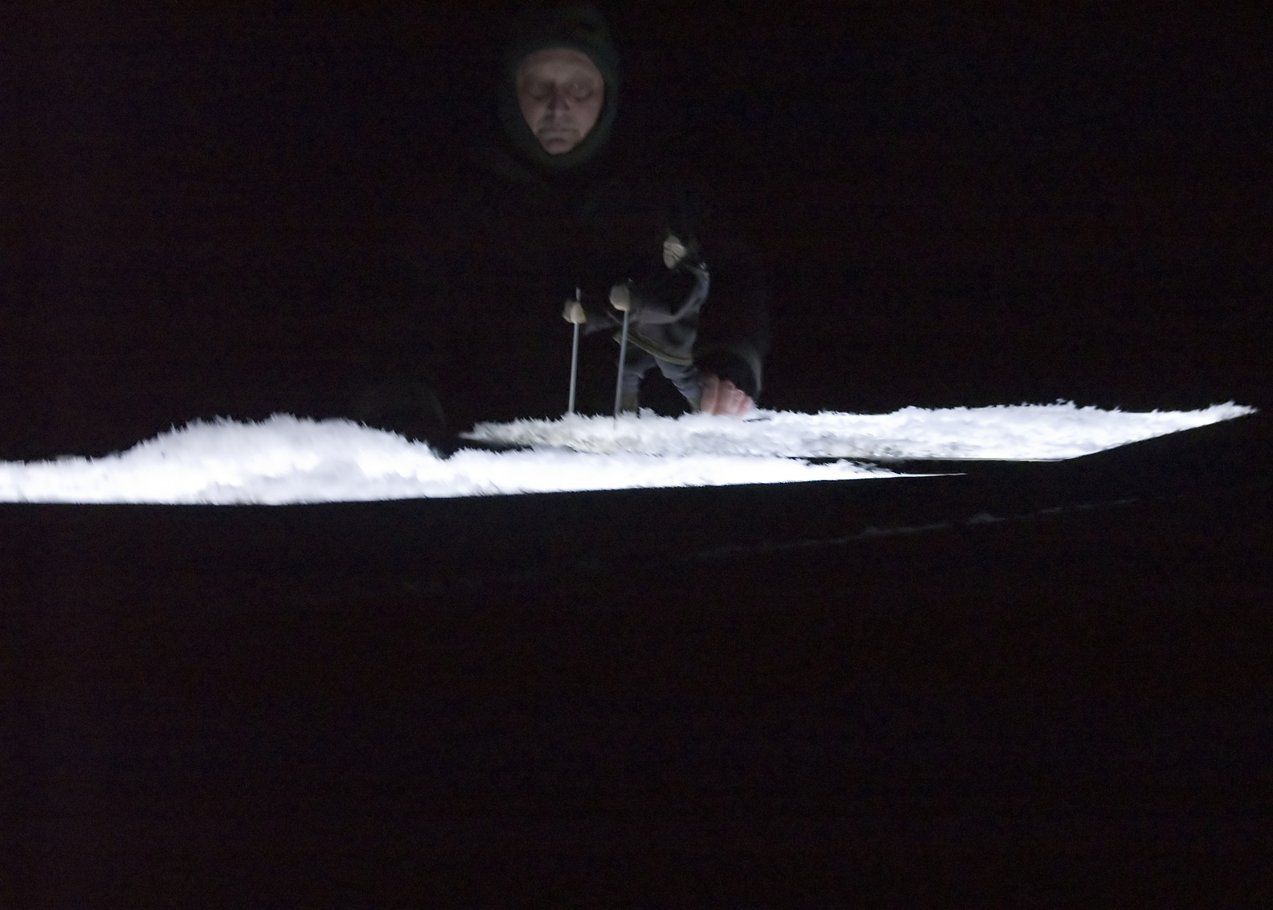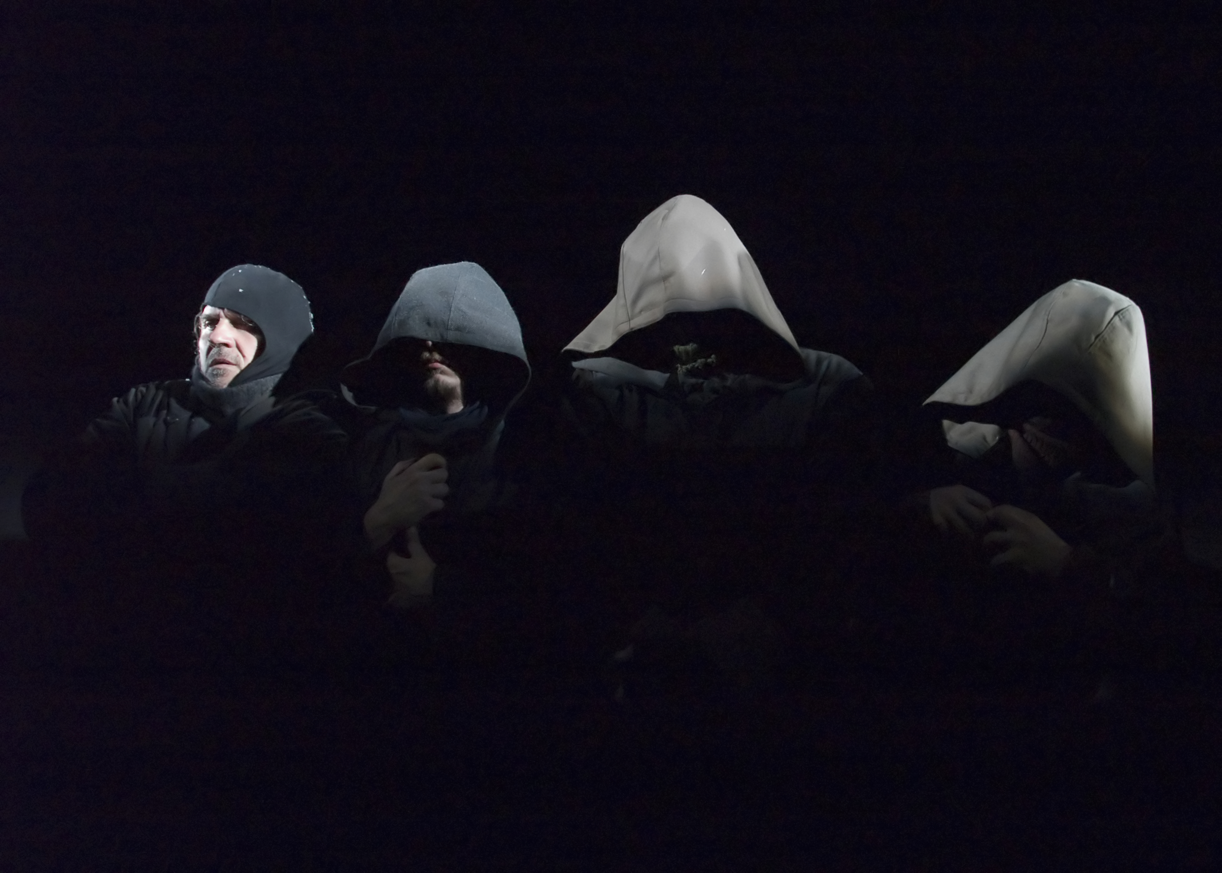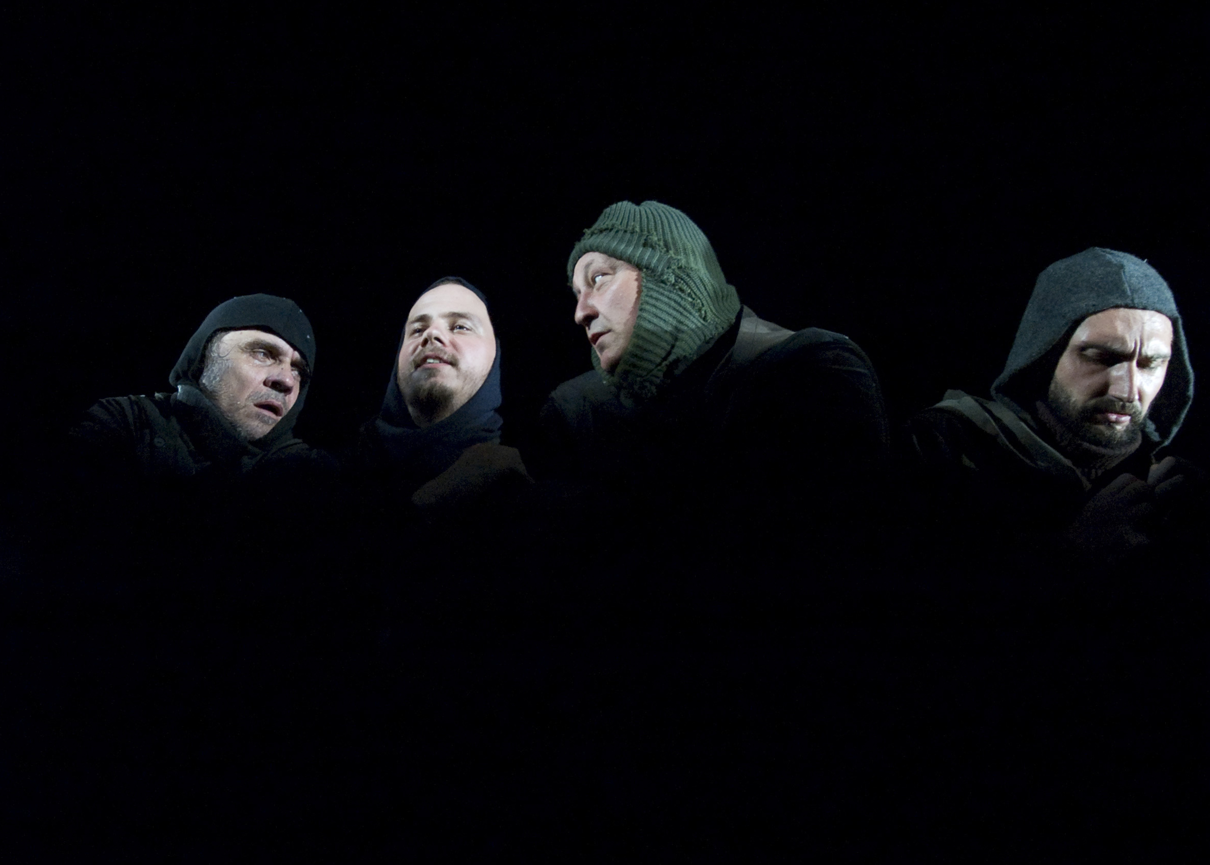 Spod czarnej kurtyny wyłania się obraz śnieżnego bezmiaru. Projekcja video (autorstwa Dziugasa Katinasa) przedstawia białe zaspy i przedzierających się przez nie czterech mężczyzn. To pierwszy z trzech planów spektaklu. Wyświetlane obrazy tworzą główny kontekst opowieści - znaczą miejsce, jego klimat i geografię, określają przebieg wyprawy. Są spoiwem historii i dwóch kolejnych, współistniejących przestrzeni gry: żywego planu aktorskiego oraz animacji lalek.