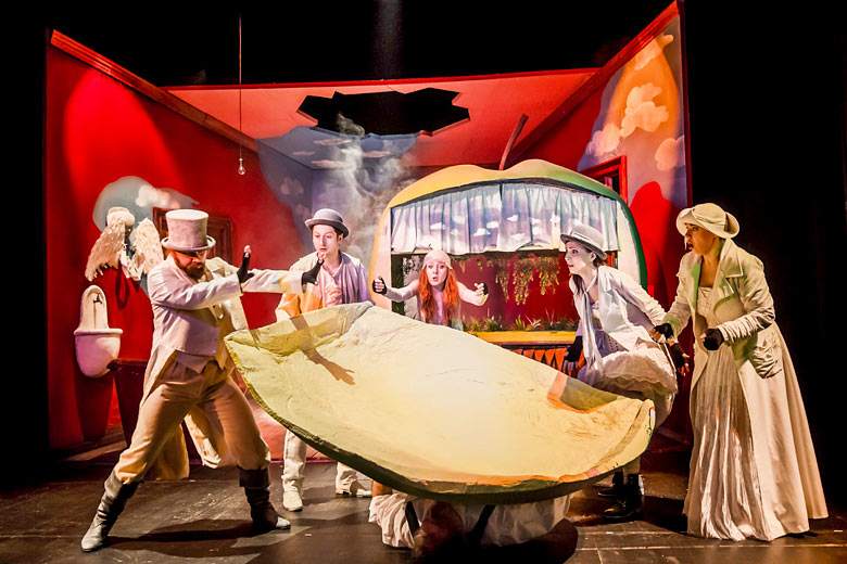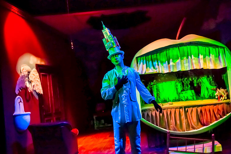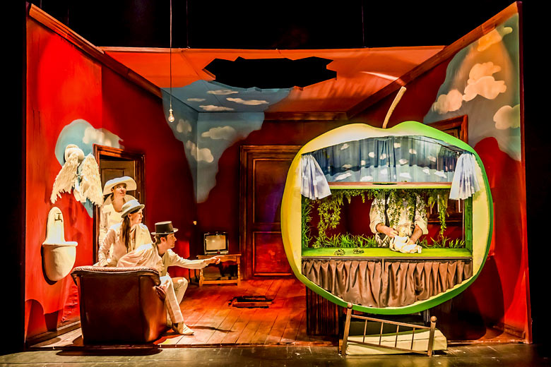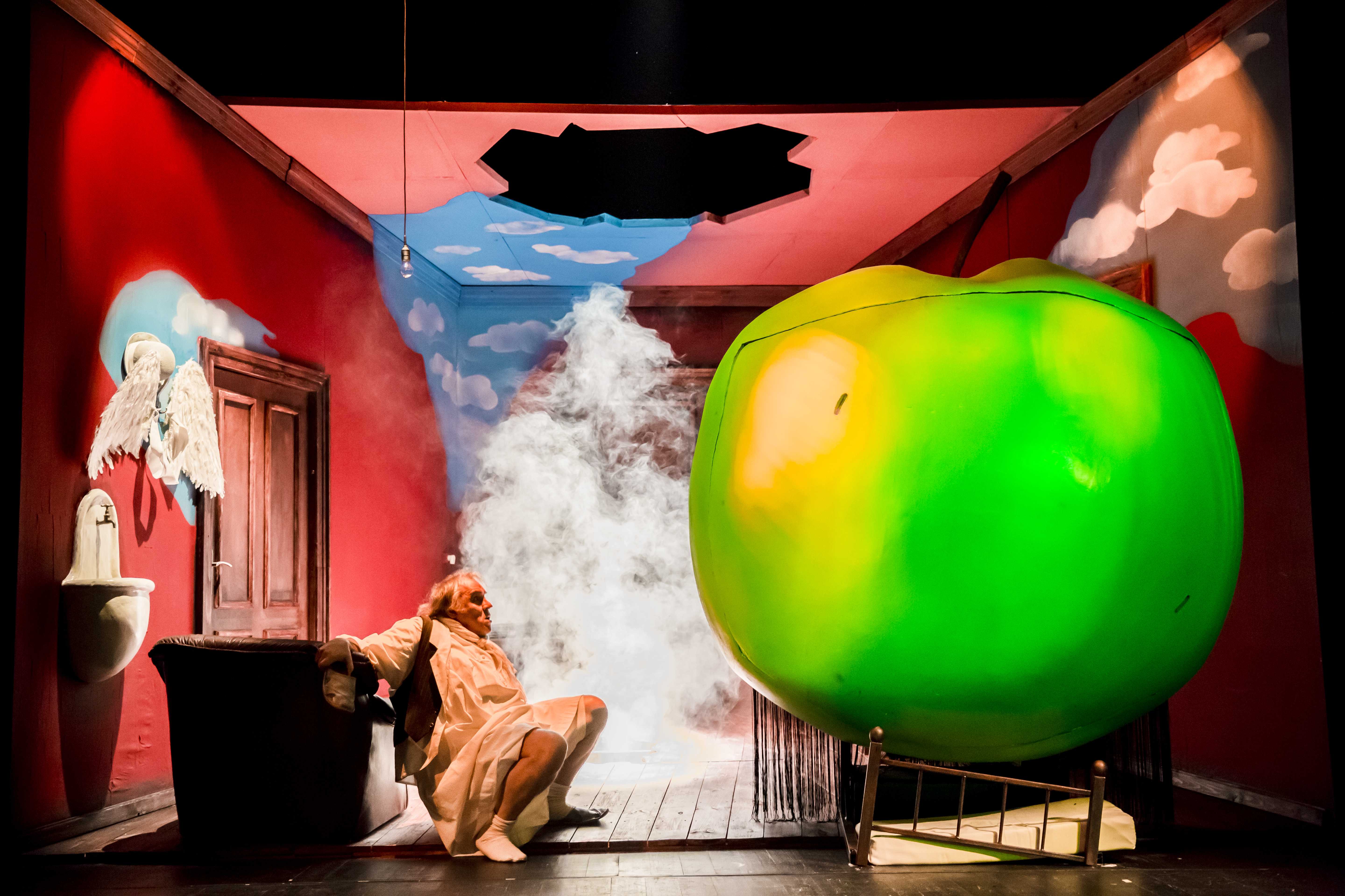 Wspomniana wielopiętrowość wyraźna jest też w scenografii spektaklu - i to wreszcie po czwarte. Za scenografię odpowiada bowiem Eva Farkasova, znana niegdyś m.in. ze scenografii do spektakli teatru Wierszalin. W BTL-u stworzyła iście bajeczną scenerię, na kilku poziomach. Tak jak w spektaklu grają aktorzy i lalki, tak i tu obok siebie funkcjonuje przestrzeń wielkoformatowa i zminiaturyzowana. Duży Aniołek ma domek naturalnej wielkości, ale gdy małe jabłko niszczy mu dach, a Aniołek spada z chmury, nagle wszystko zmienia proporcje. I nasz bohater ludzką posturę zmienia na maleńką (lalka ma nawet rysy Dolińskiego), jego domek również, maleje też wszystko w domku. Jak to przedstawić na scenie? W tym cały szkopuł, by stworzyć iluzję natychmiastowej miniaturyzacji.