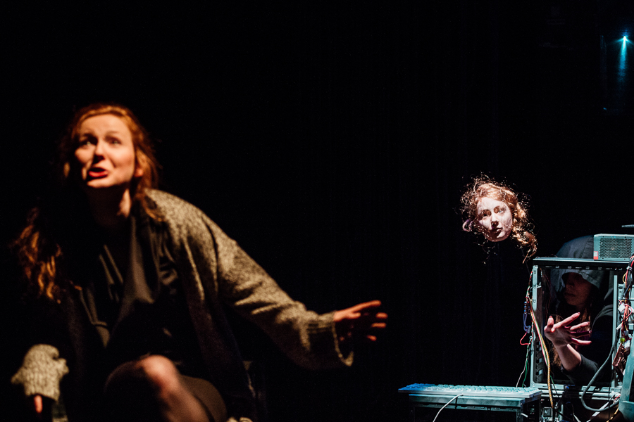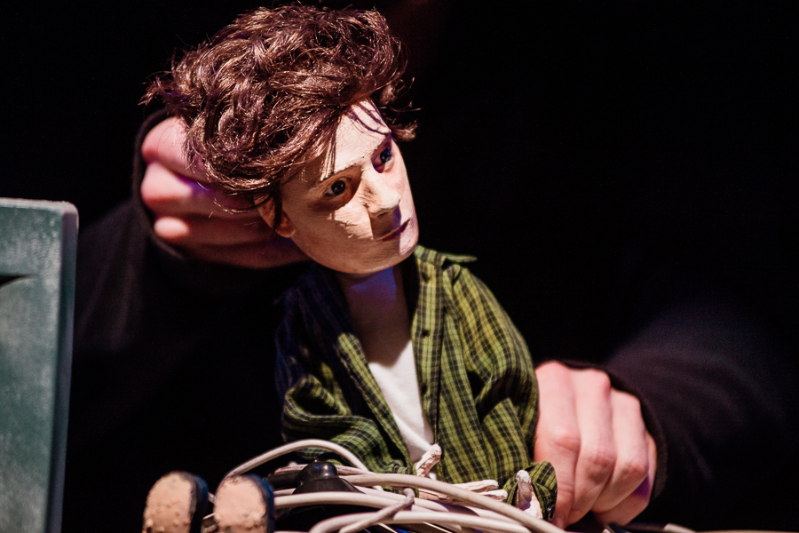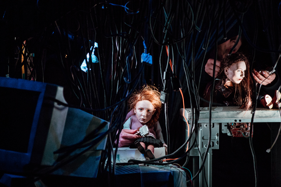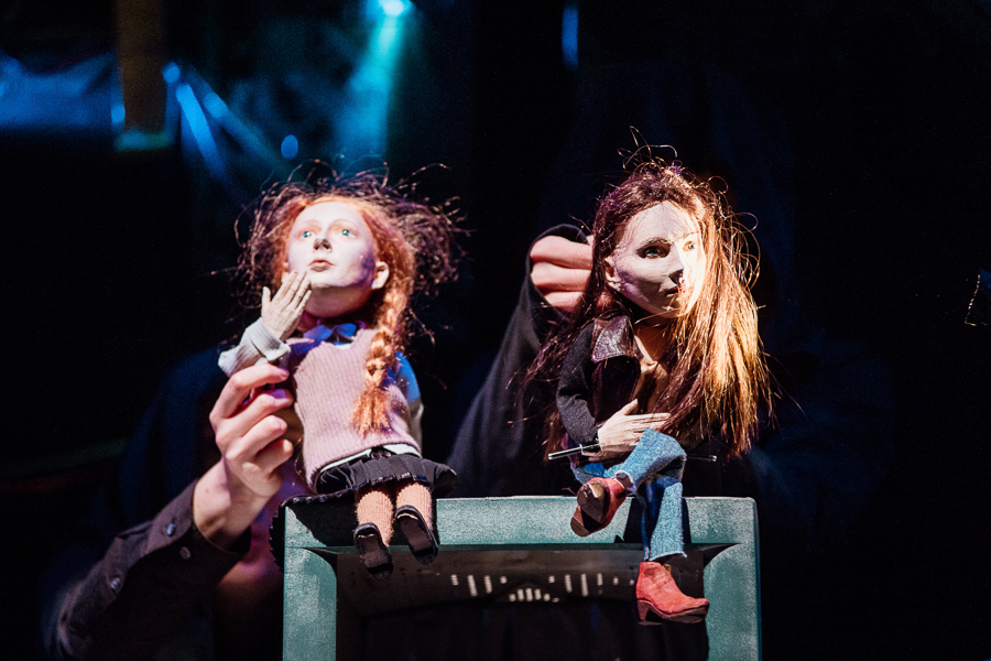 Ta perspektywa przejawia się też w sposobie inscenizacji. Aktorzy starali się stworzyć świat rozpisany na kilka planów: lalkowy, aktorski, multimedialny. Są lalki stolikowe, są maski, plan aktorski, mroczne wizualizacje i światło pełzające po bohaterach. Dorośli cofają się do wspomnień i historii sprzed lat, do siebie samych w młodym wieku, jakby znów wskakując w swoją młodszą skórę (co ciekawie podkreślają lalki, rysami przypominając swoich animatorów).