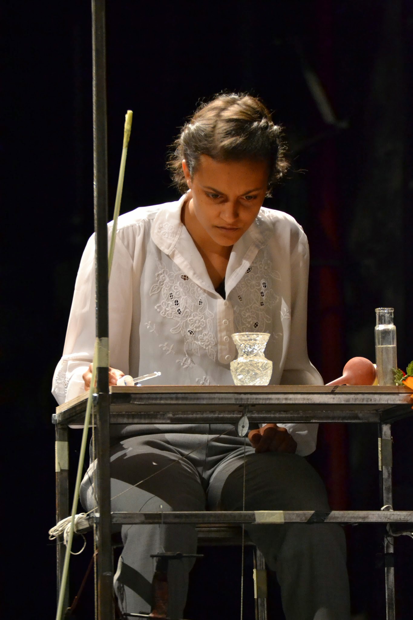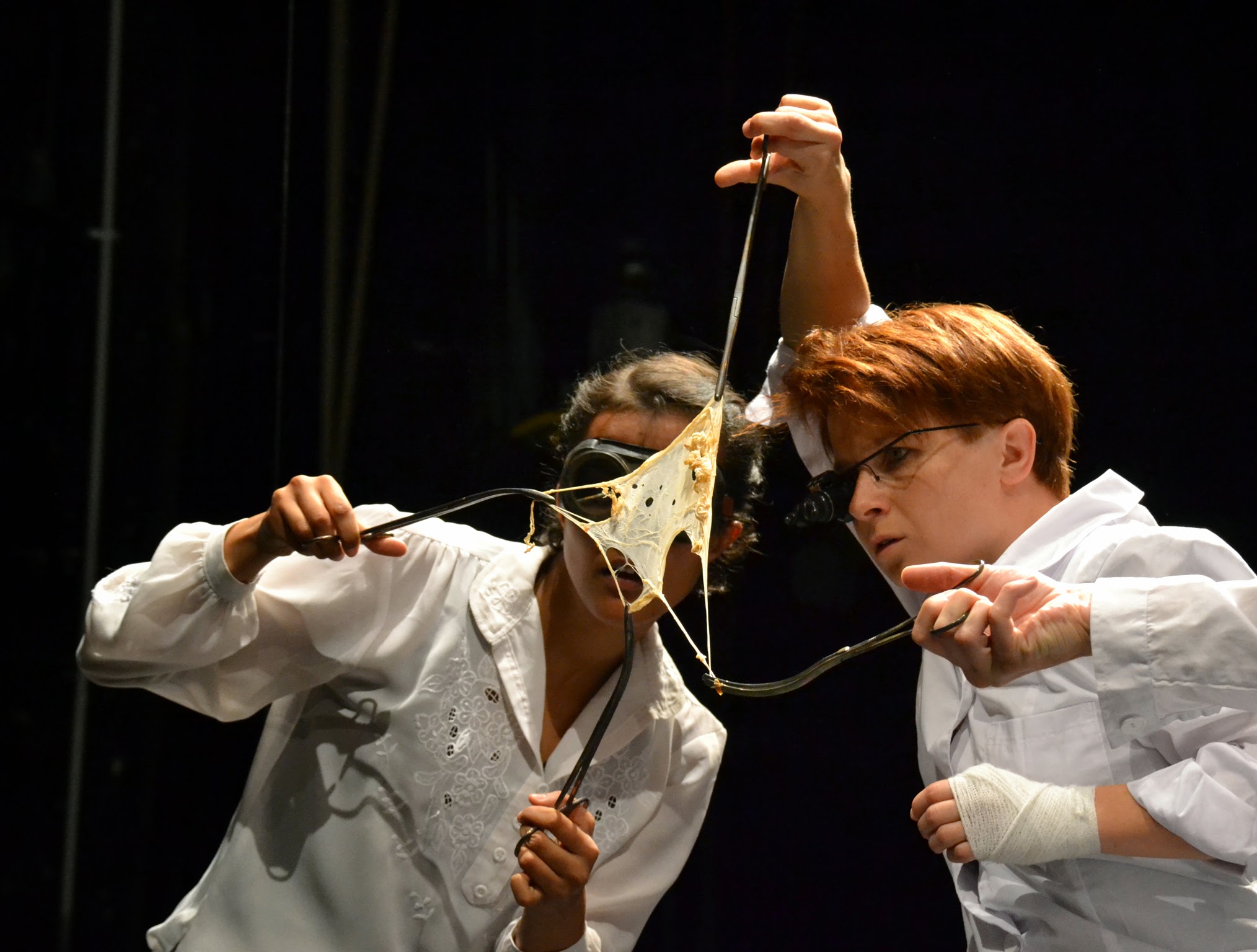 Aktorzy rozciągają ją szczypcami, testują, strzelają, naciągają na twarz, materia gdziekolwiek się znajdzie - zaczyna żyć. Czy to jako upiorny pyszczek, przypominający zmutowanego gremlina, czy strupieszała ręka, wspinająca się po plecach, czy oddychający kawałek skórki zamknięty w menzurce i podświetlony. W końcu już nie wiadomo, czy tajemnicza materia to mózg (w komiczno-upiornej formie animowany przez aktora), czy senny majak. Jego animacja, choć pokazana w całej technicznej krasie, animacją być przestaje. Trochę straszny, trochę piękny moment: złożona w misce kupka poszarpanej gumy, przypominająca mózgową materię, powoli rozciągana jest przez sznurki z różnych stron sceny (znany u Vogla motyw). I nagle na oczach widza z tej nieokreślonej masy rodzi się upiorna postać. Unosi się do góry, coraz wyżej i wyżej, już poza teatralną maszynerię. Aż w końcu senny demon znika.