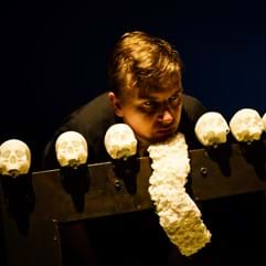 Przedstawienie w formie monodramu w luźny sposób wykorzystuje elementy dramatu Szekspira, tworząc oniryczną impresję o historii księcia H.