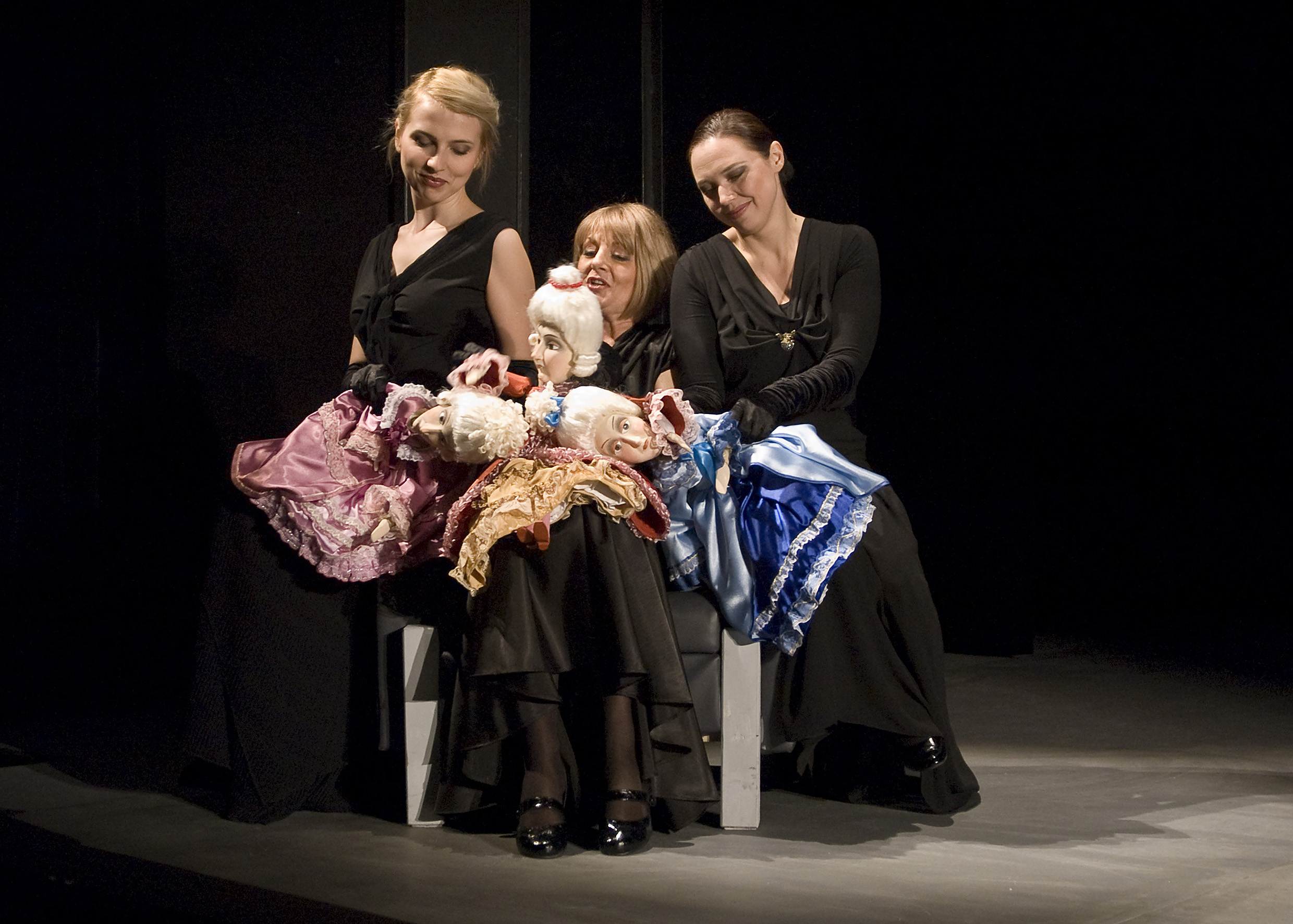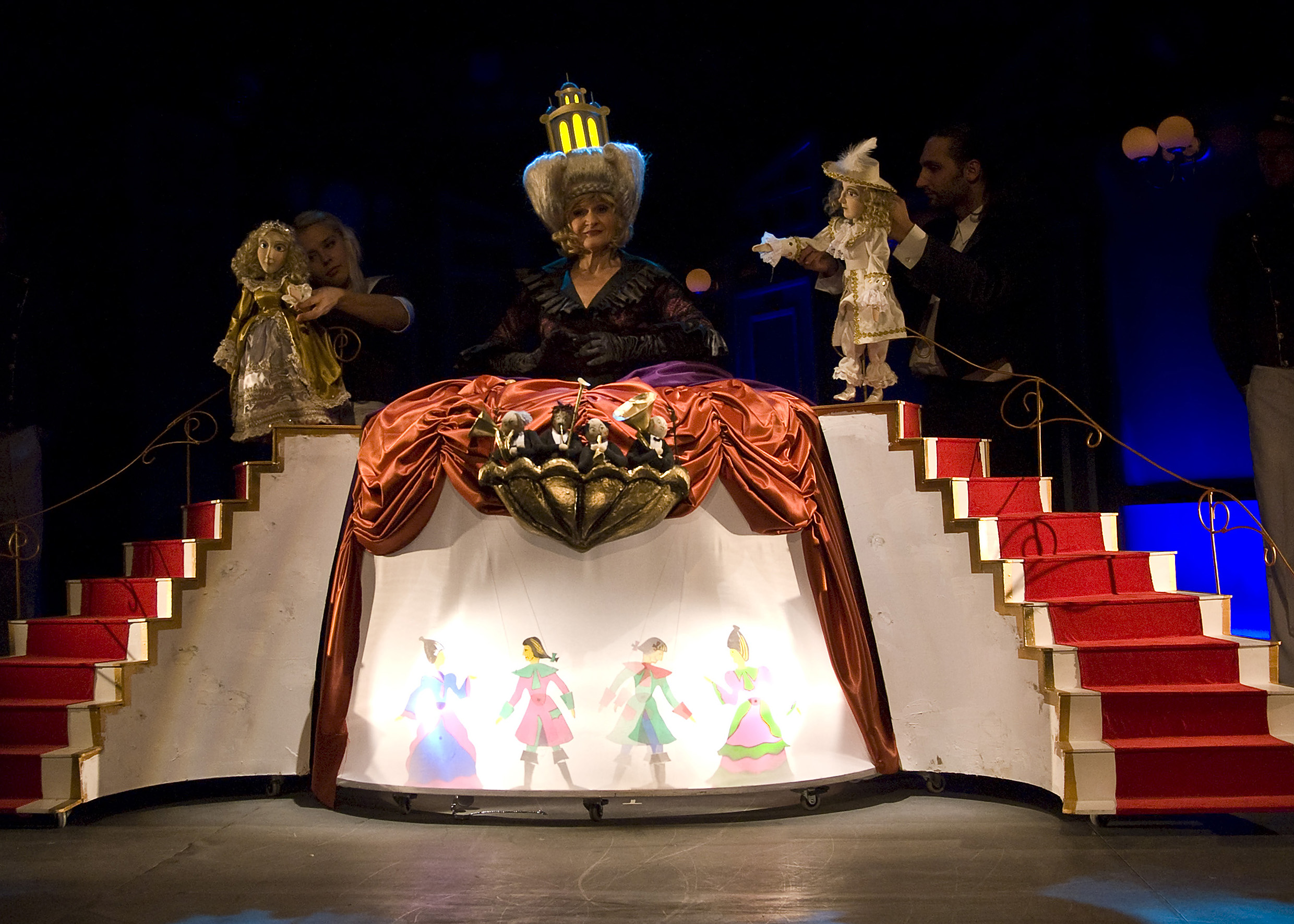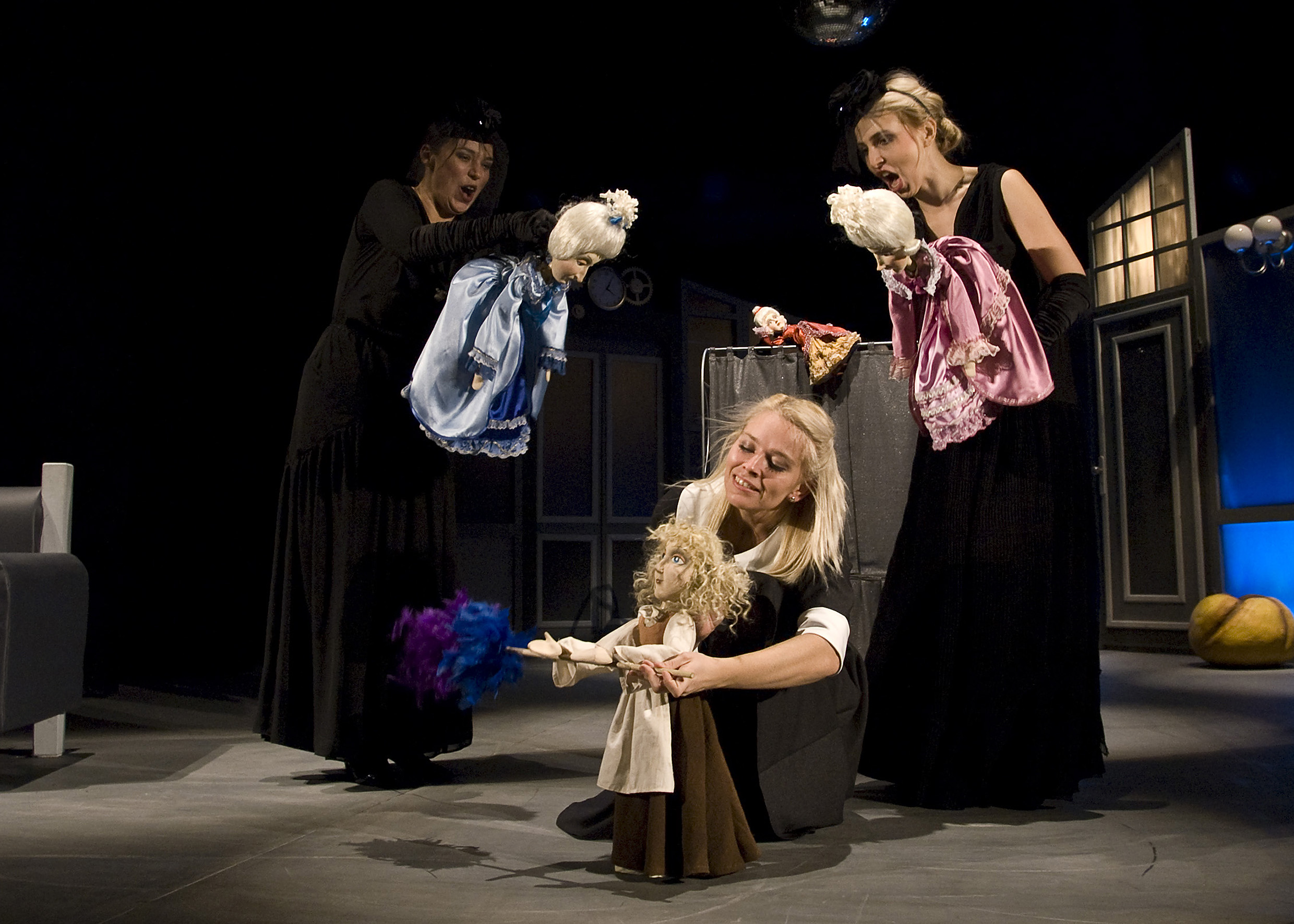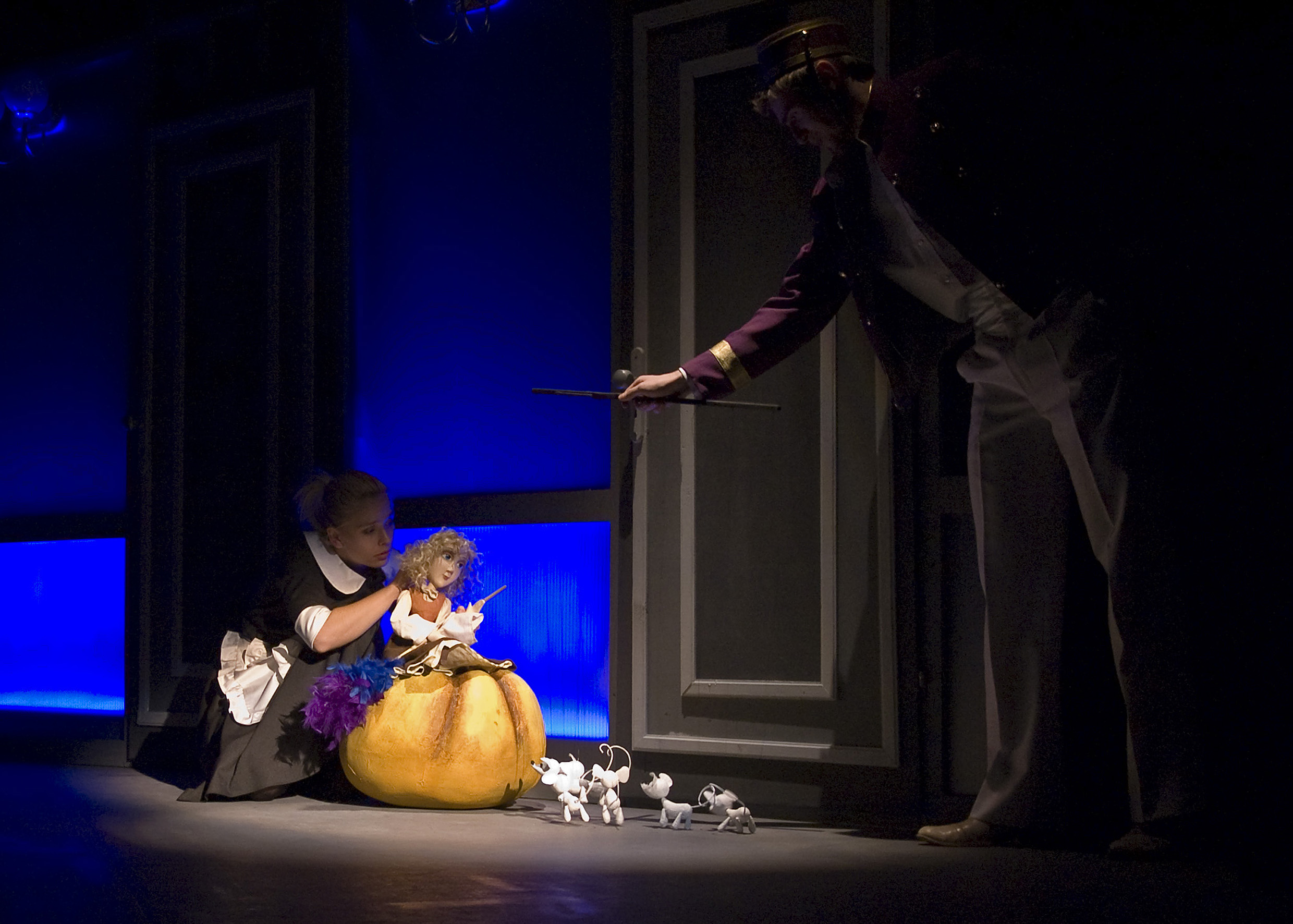 Wszystko to rozgrywa się w planie aktorskim i lalkowym - aktorzy animują proste lalki, najróżniejszej wielkości, czasem pojawia się teatr cieni. W tle muzykanci przygrywają na żywo. Do tego mnóstwo sztuczek ze światłem, które zmienia kolory, zalewa scenę ciepłą poświatą, albo setkami wirujących "zajączków". Albo kilka ruchów, przesunięć sprzętów i strojna suknia zamienia się w salę balową. Jeszcze zakręcić trzeba też korbą i oto długim podestem, rozdzielającym siedzących widzów, sunie dynia, sama, bez niczyjej pomocy! Za chwilę zamieni się w karocę i zaprzęg, i te też na bal pojadą same...