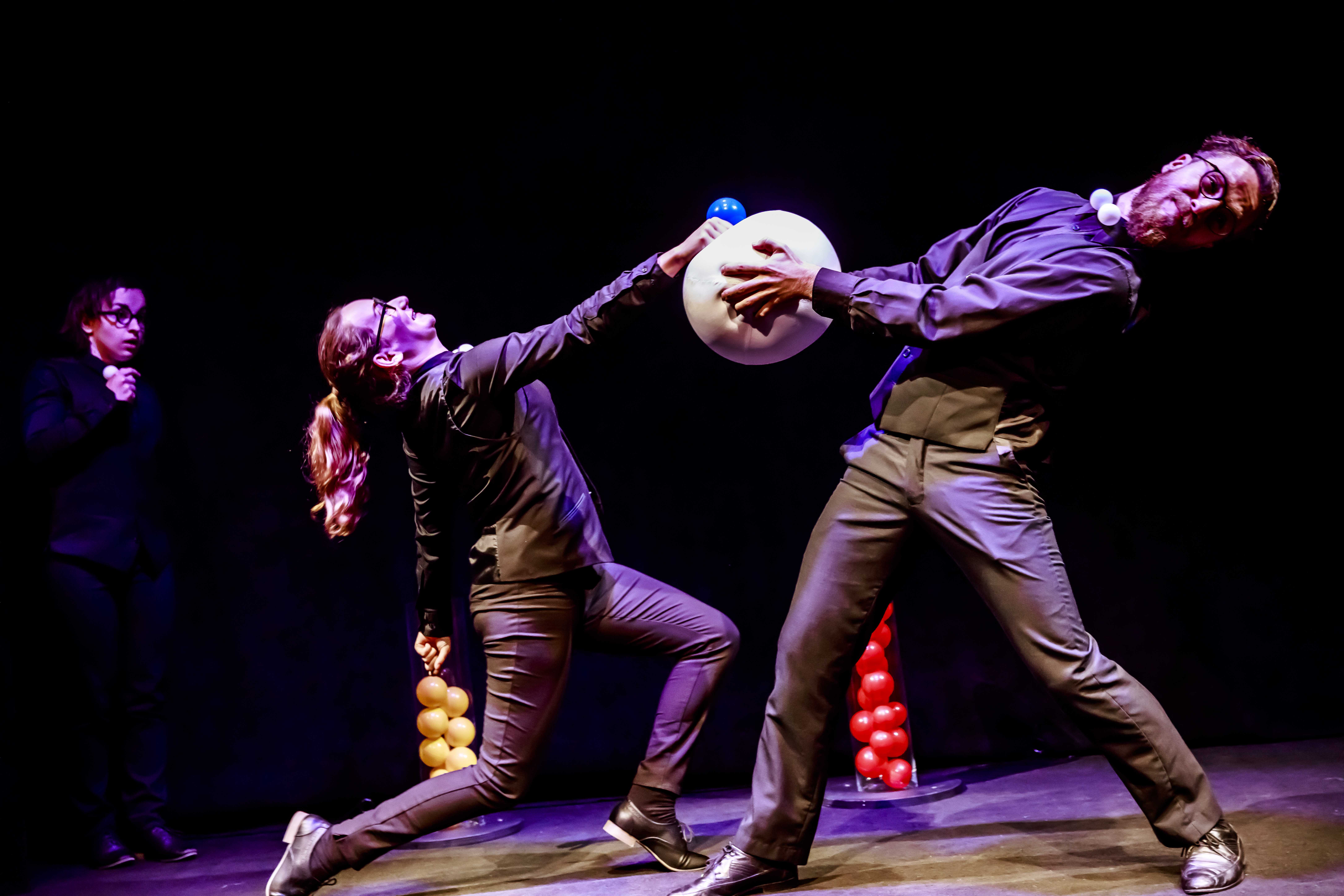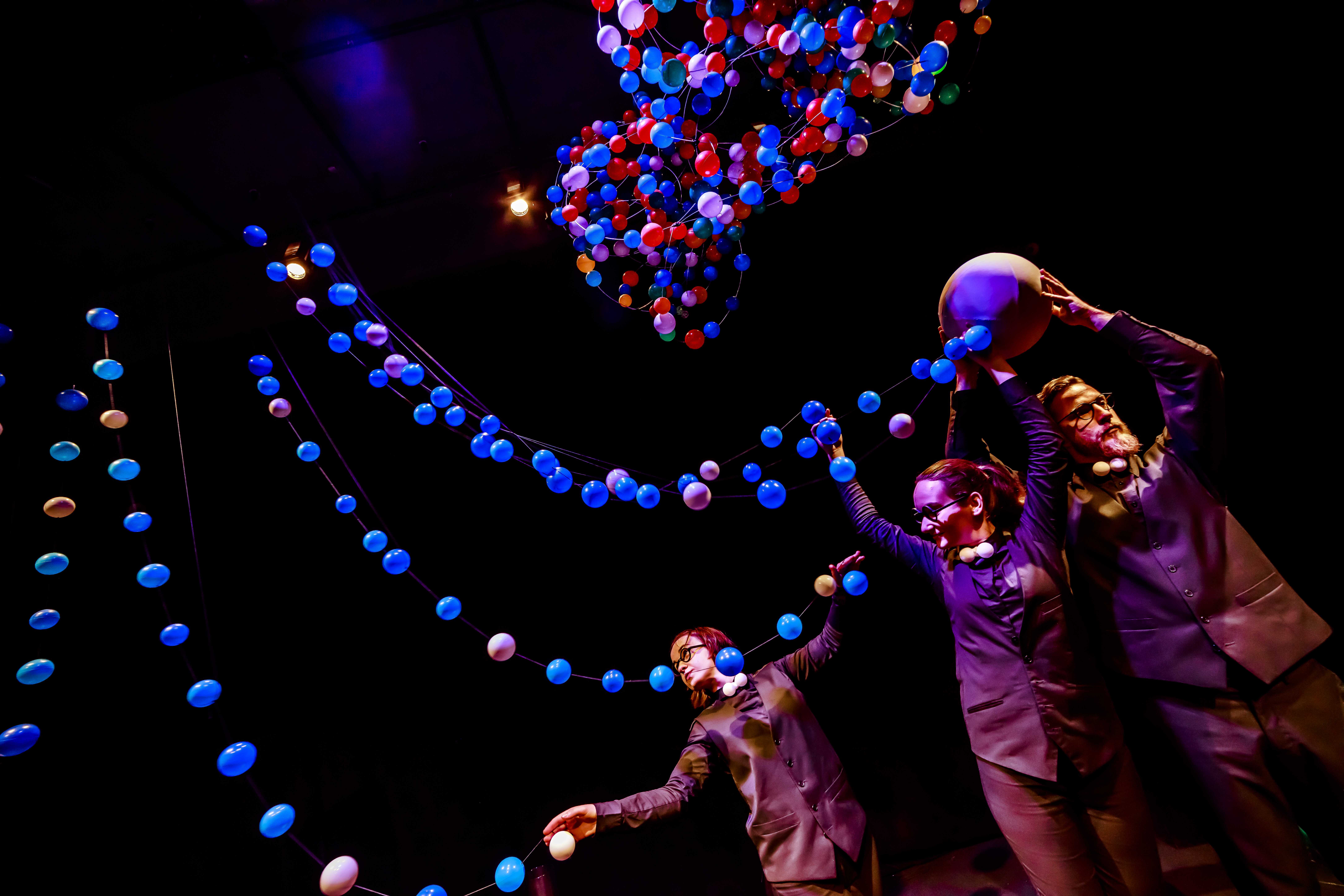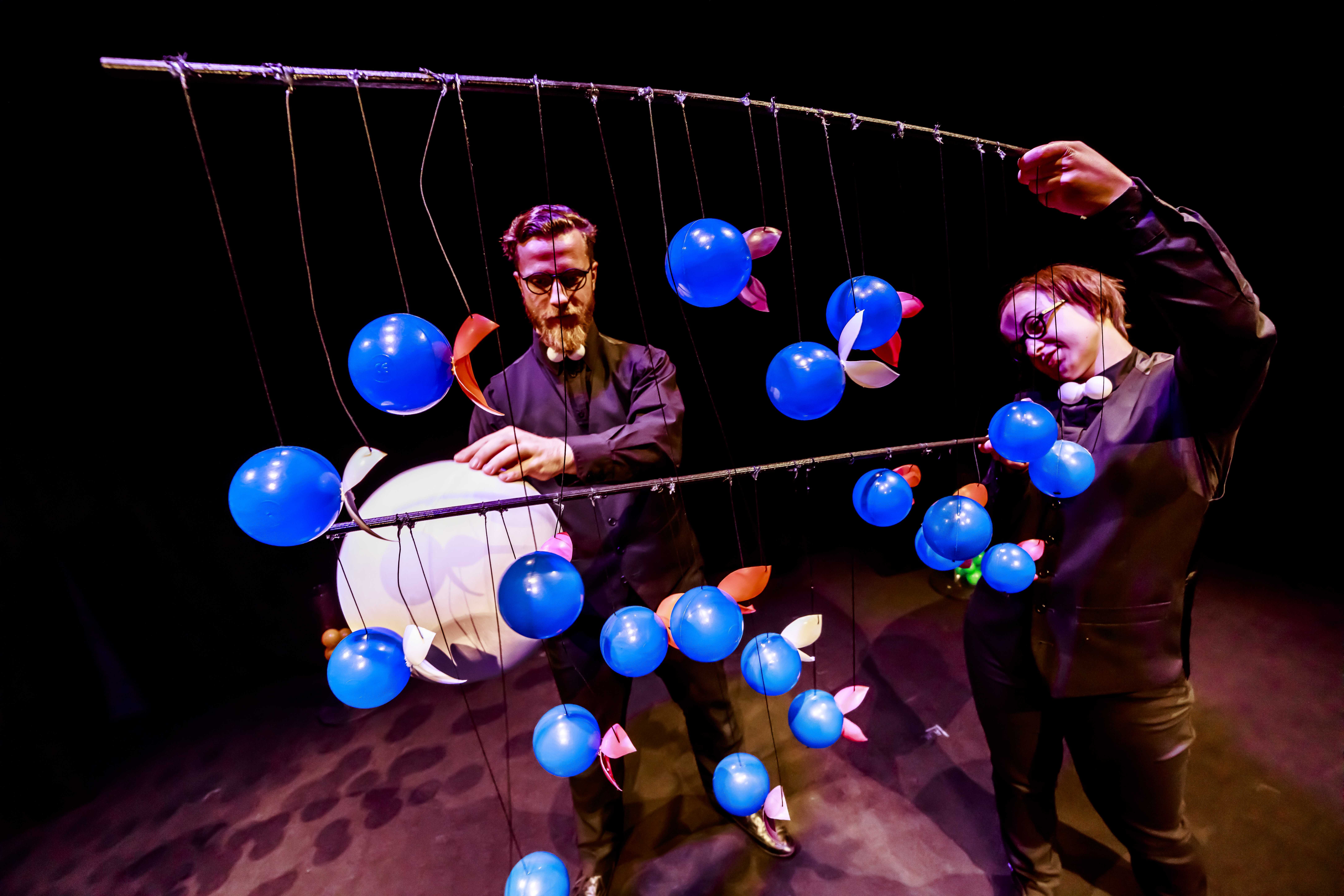 Główną role w przedstawieniu odgrywa ruch i zabawa kolorami. Niebieskie kulki przeistaczają się w ryby.