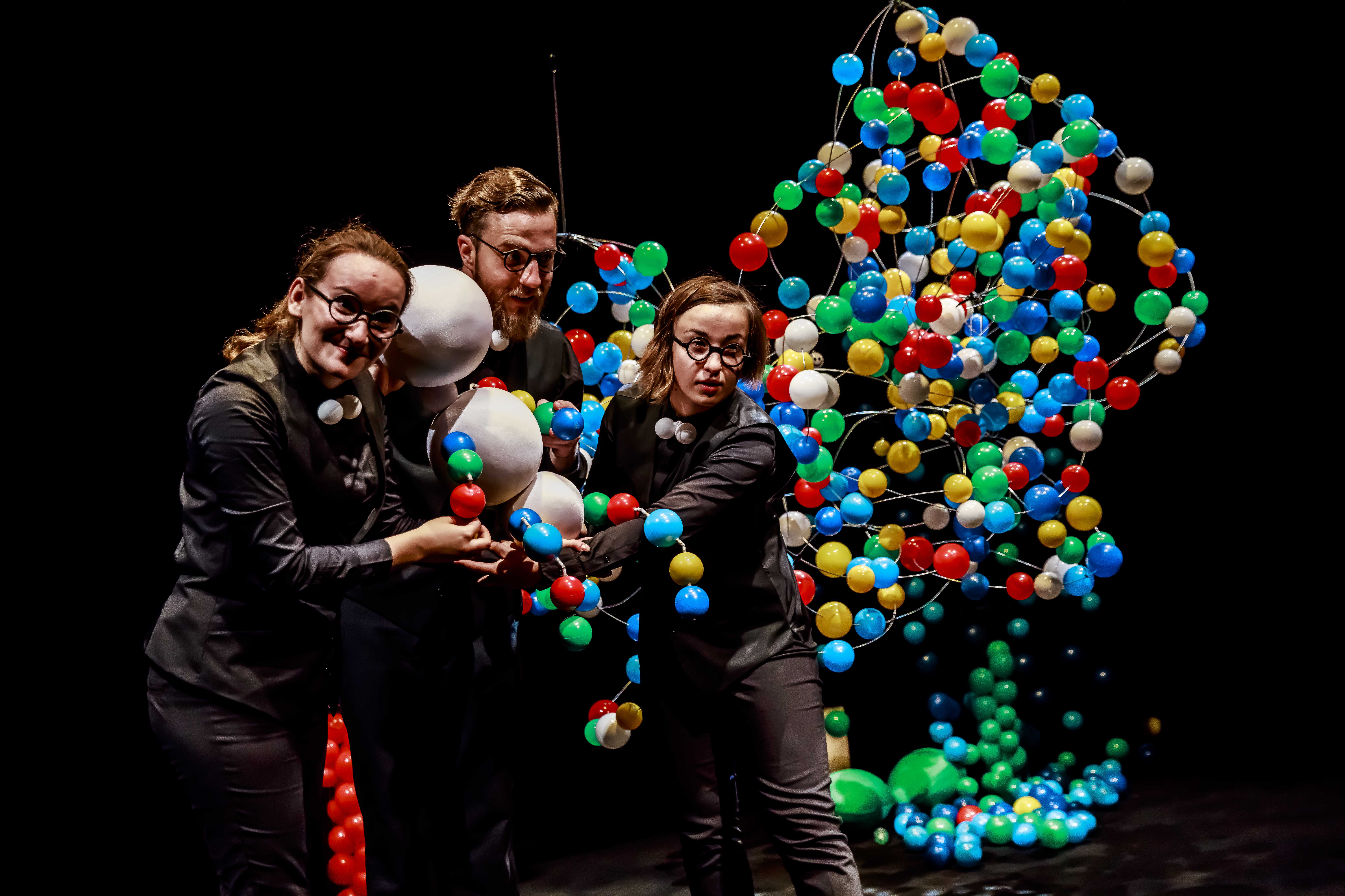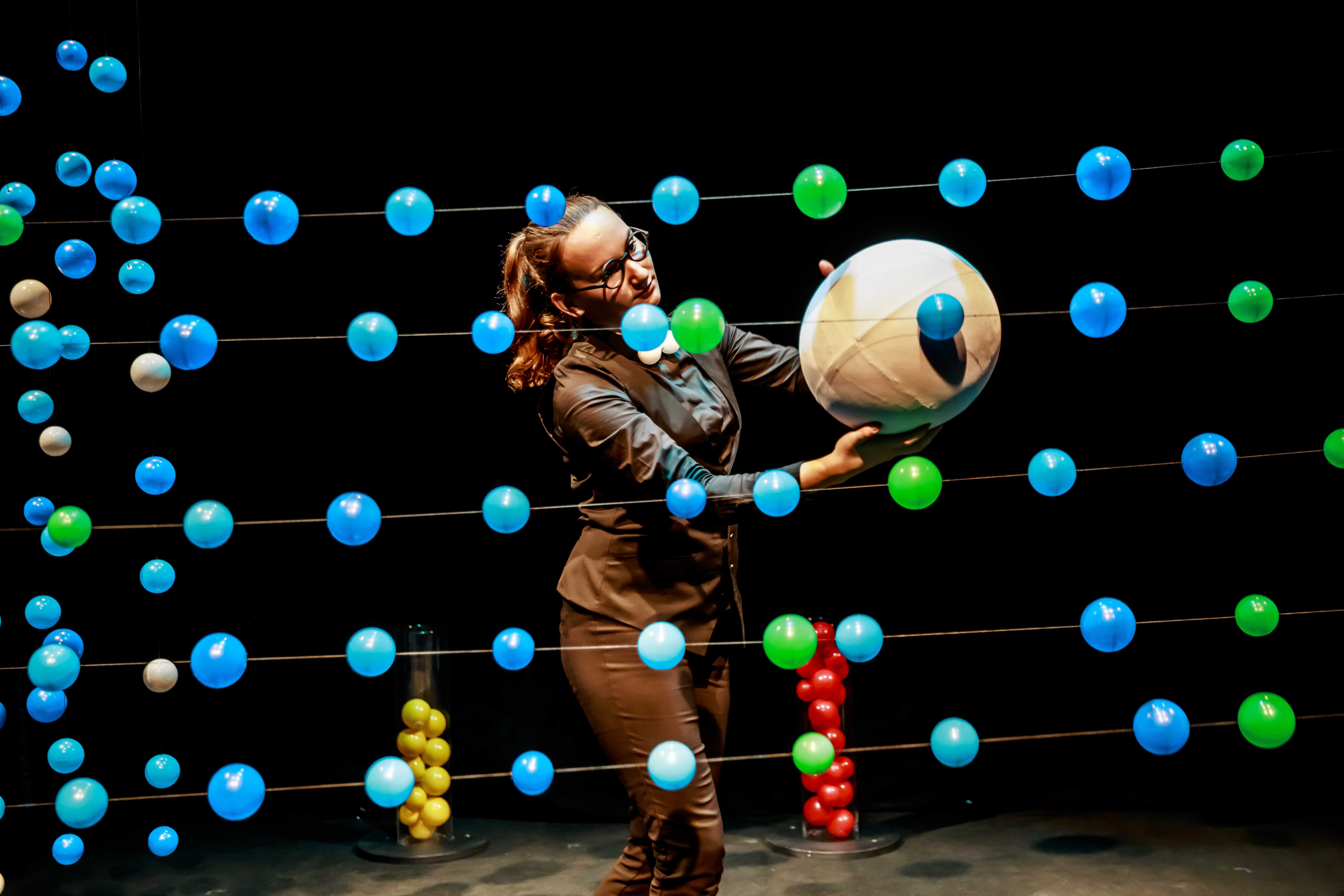 Przedstawienie zaczyna się jeszcze w korytarzu. Widzowie czekają w skarpetkach (trzeba zdjąć buty), a ci najmłodsi otrzymują od jednej z aktorek po 2 kolorowe kulki, które po wejściu na salę będą musiały wrzucić do odpowiedniej probówki. Dzieci wyraźnie podekscytowane usadawiają się na kolorowych poduszkach, by wybrać się w świat kulek.