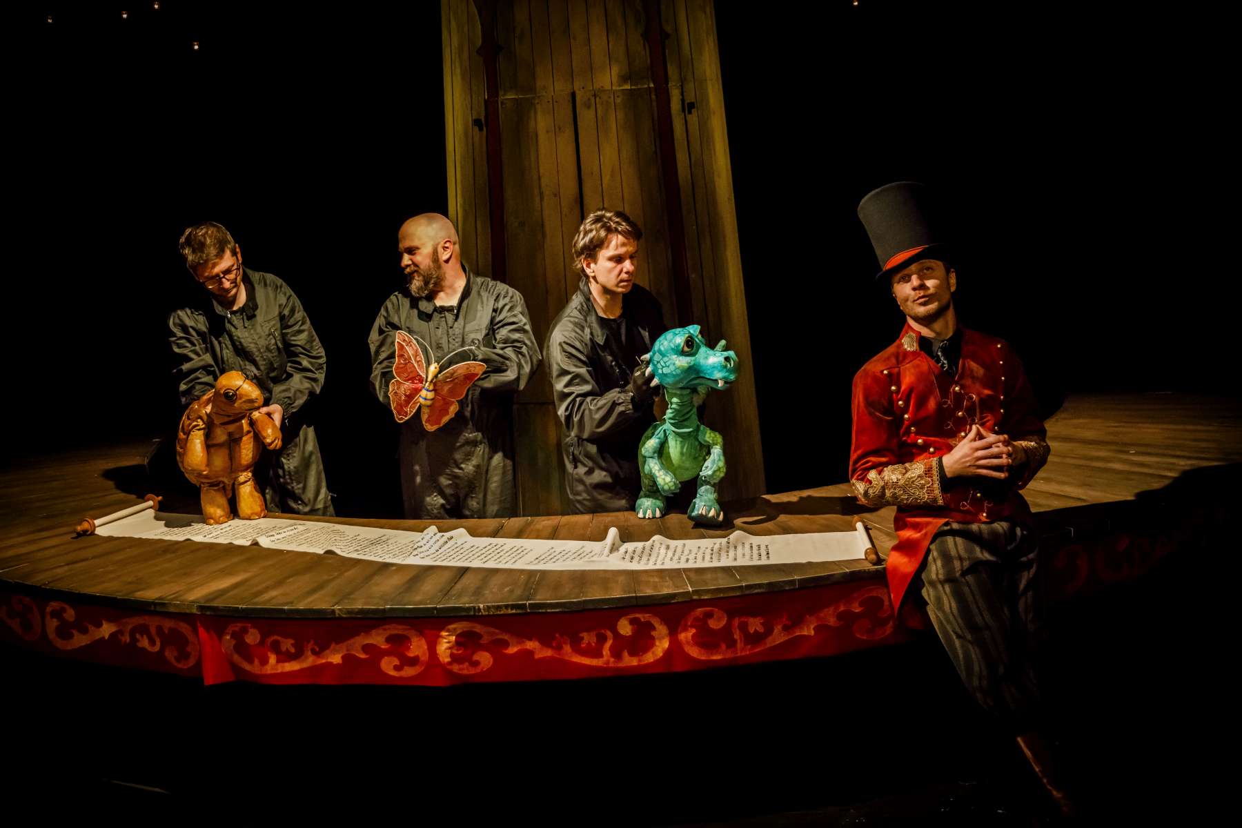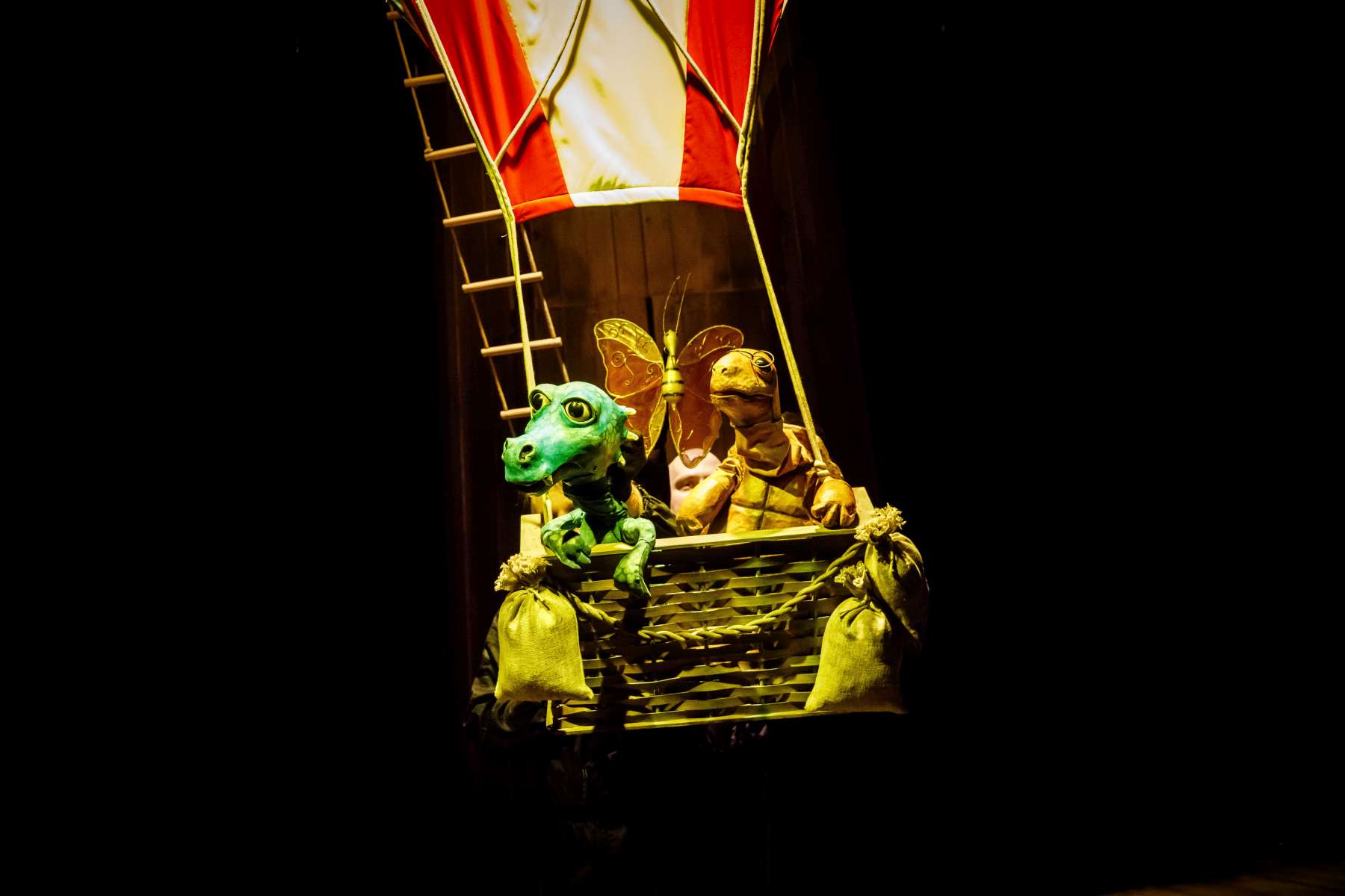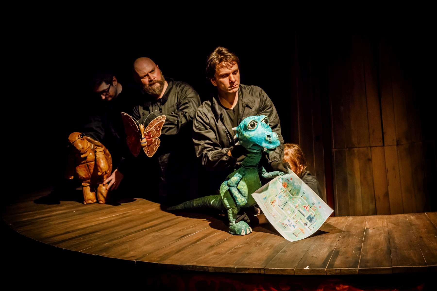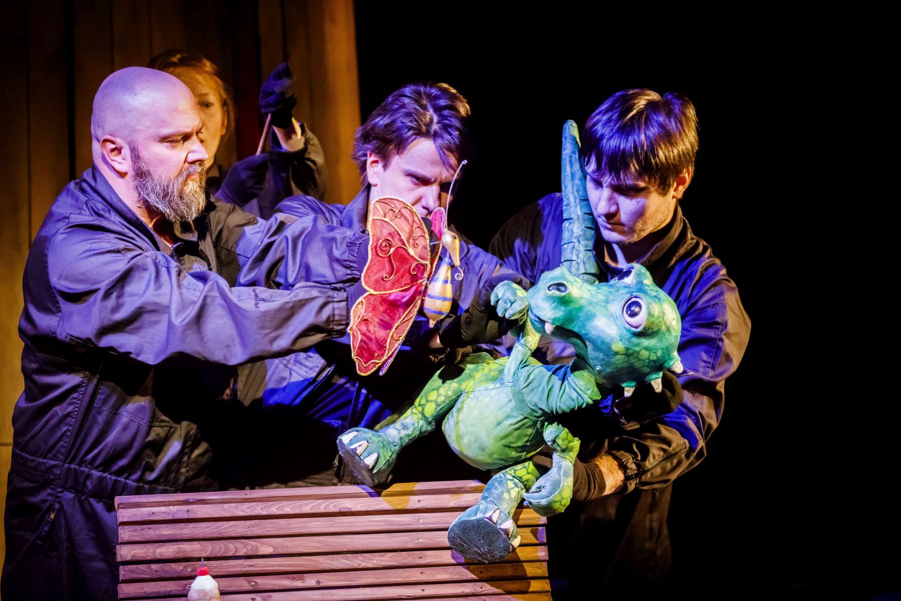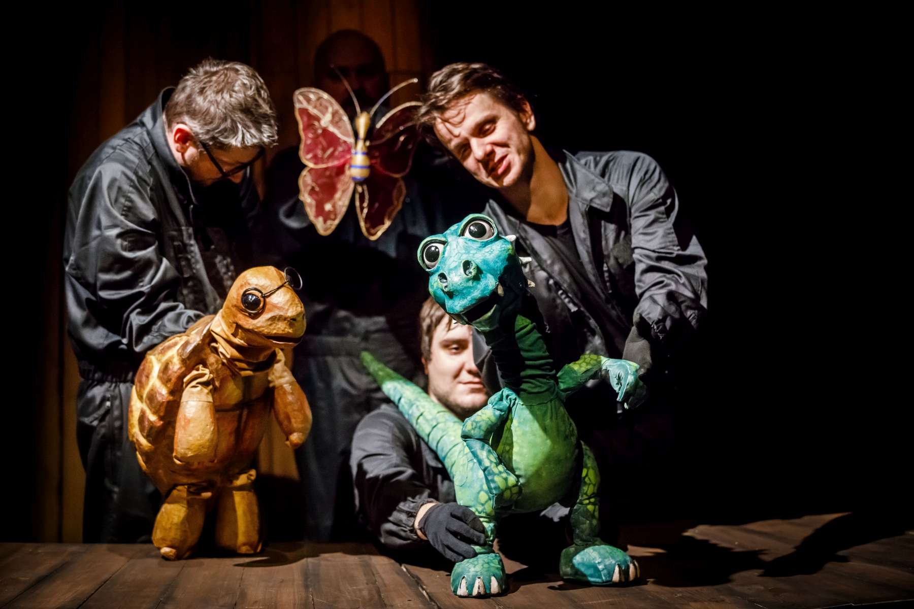 Animanty (termin Haliny Waszkiel) zaprojektowane przez scenografa Michała Wyszkowskiego są pierwszorzędne – pomysłowe i urocze, a do tego wydobywają talent artystów-animatorów. Byli oni widoczni dla widzów, więc można było się przyjrzeć ich kunsztowi, ale mieli na sobie czarne kombinezony – znak prymatu aktora ożywianego. Niezwykle podobał mi się sposób nadawania życia Dinozaurowi – jedna osoba, czyli Mateusz Smaczny, animowała głowę i tułów, wypowiadając kwestie, a druga (rotacyjnie) odpowiadała za ruch łap. Absolutnie mistrzowska była też praca z lalką Żółwia. Poddawał ją animacji Michał Jarmoszuk, trafnie naśladując ociężałe ruchy gada, otwierając buzię, wysuwając szyję itd. Dostosowany był do tego przeciągły i spokojny sposób mówienia. Do postaci Motyla był przypisany Krzysztof Bitdorf. Jego animant był najmniejszych rozmiarów, miał drewniany tułów i witrażowe skrzydełka. To oznaczało mniejszą ruchomość niż w przypadku dwóch pozostałych „muszkieterów”, którzy mieli pluszowe stawy i giętki kark. Mimo to, Bitdorf poradził sobie fruwająco, oddając głosem i trzepotem skrzydeł charakter rezolutnego motylego zawadiaki.
