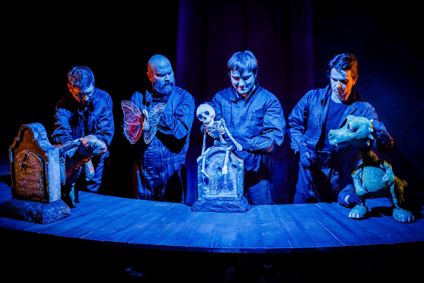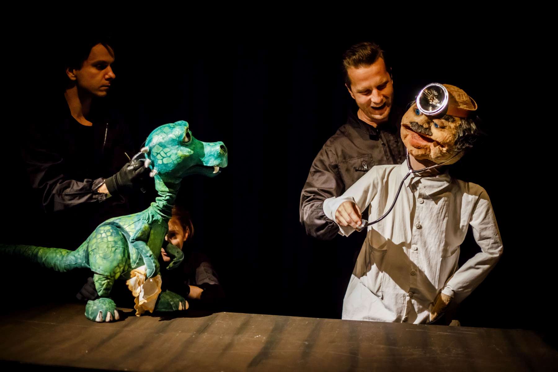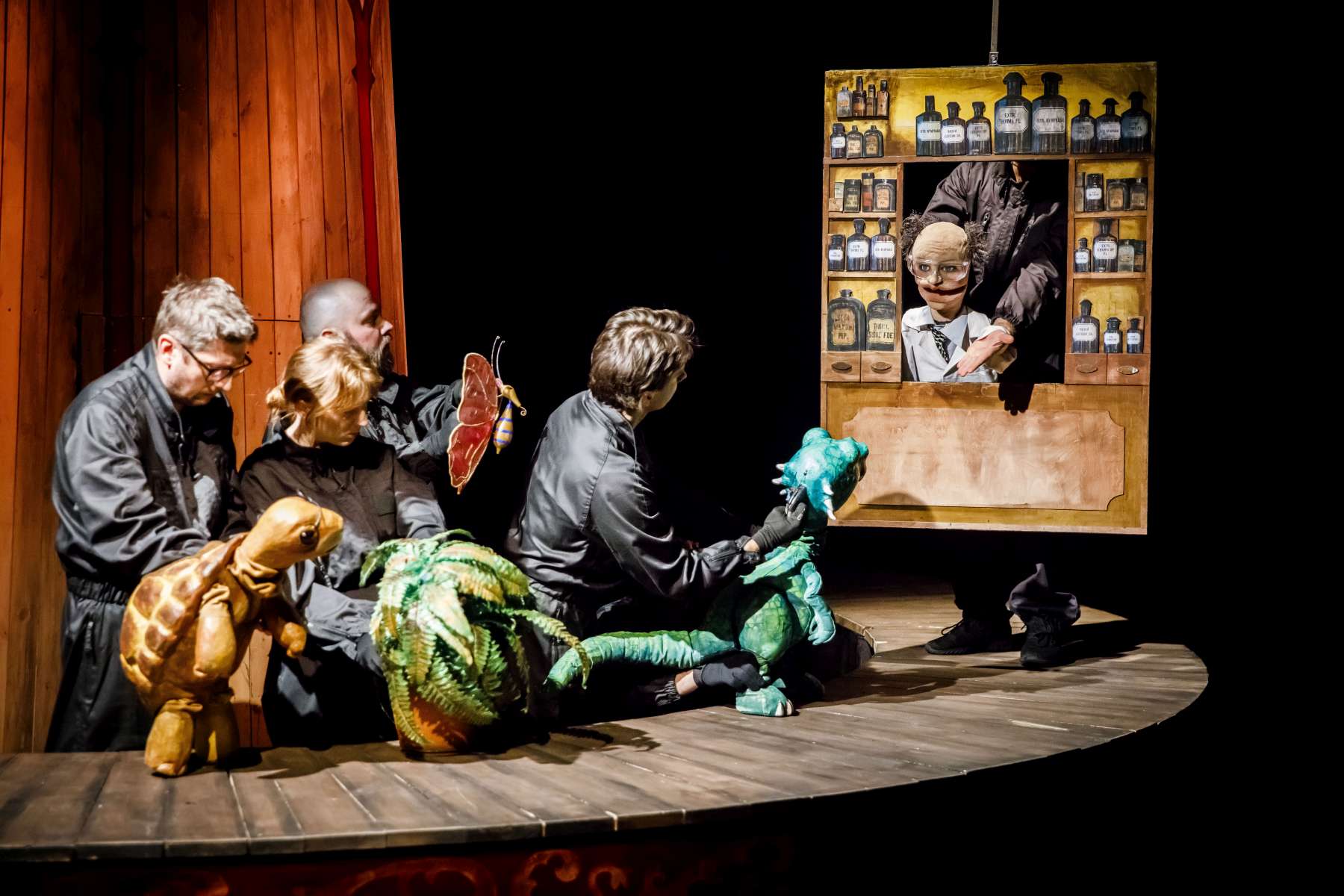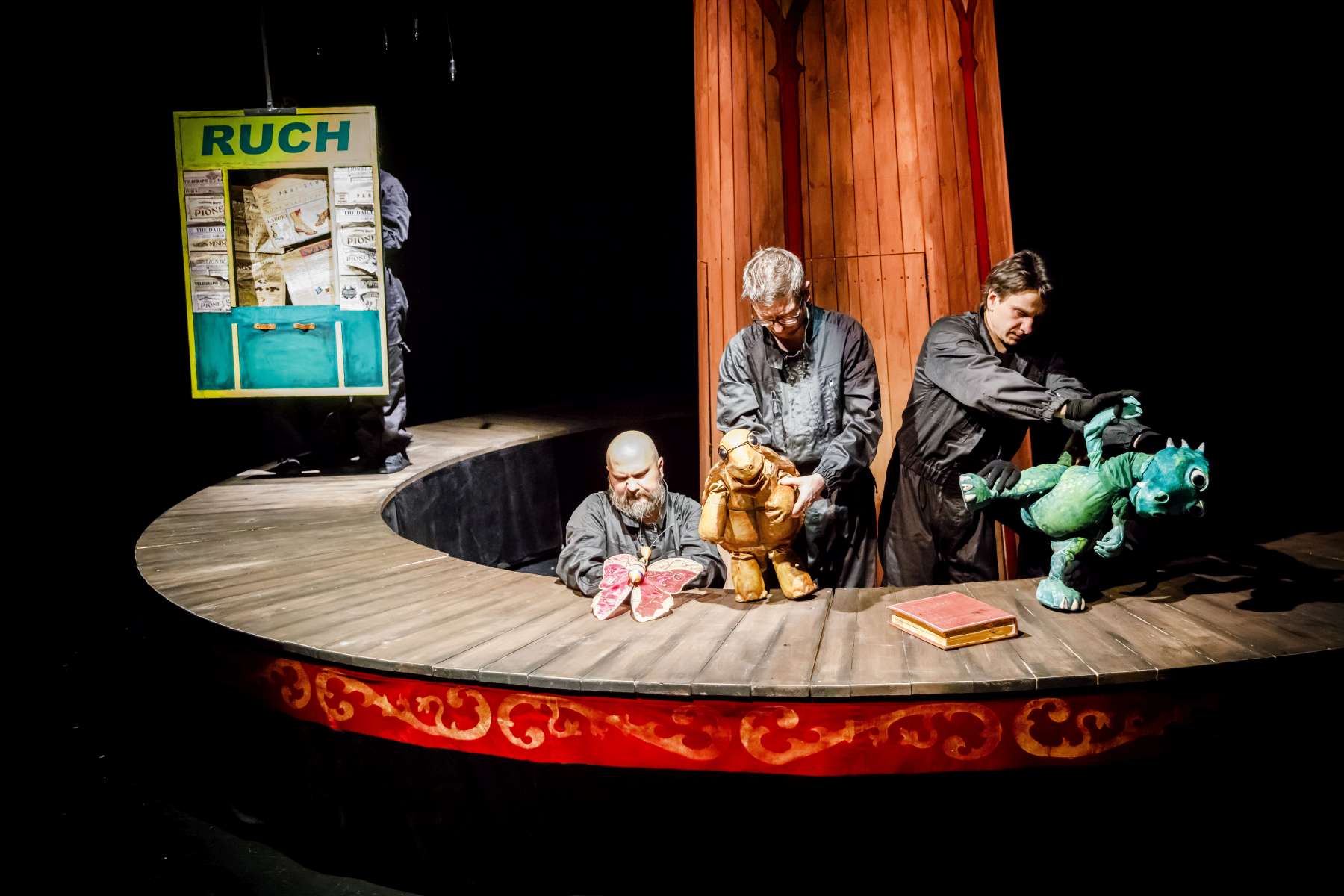 Animanty (termin Haliny Waszkiel) zaprojektowane przez scenografa Michała Wyszkowskiego są pierwszorzędne – pomysłowe i urocze, a do tego wydobywają talent artystów-animatorów. Byli oni widoczni dla widzów, więc można było się przyjrzeć ich kunsztowi, ale mieli na sobie czarne kombinezony – znak prymatu aktora ożywianego. Niezwykle podobał mi się sposób nadawania życia Dinozaurowi – jedna osoba, czyli Mateusz Smaczny, animowała głowę i tułów, wypowiadając kwestie, a druga (rotacyjnie) odpowiadała za ruch łap. Absolutnie mistrzowska była też praca z lalką Żółwia. Poddawał ją animacji Michał Jarmoszuk, trafnie naśladując ociężałe ruchy gada, otwierając buzię, wysuwając szyję itd. Dostosowany był do tego przeciągły i spokojny sposób mówienia. Do postaci Motyla był przypisany Krzysztof Bitdorf. Jego animant był najmniejszych rozmiarów, miał drewniany tułów i witrażowe skrzydełka. To oznaczało mniejszą ruchomość niż w przypadku dwóch pozostałych „muszkieterów”, którzy mieli pluszowe stawy i giętki kark. Mimo to, Bitdorf poradził sobie fruwająco, oddając głosem i trzepotem skrzydeł charakter rezolutnego motylego zawadiaki.