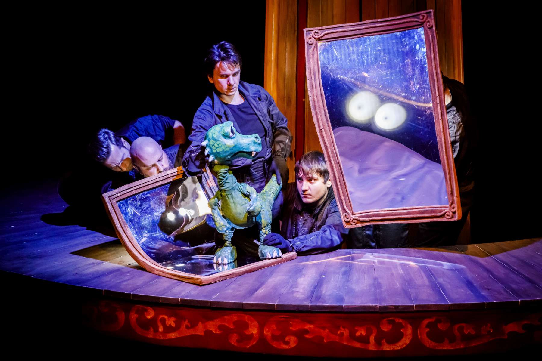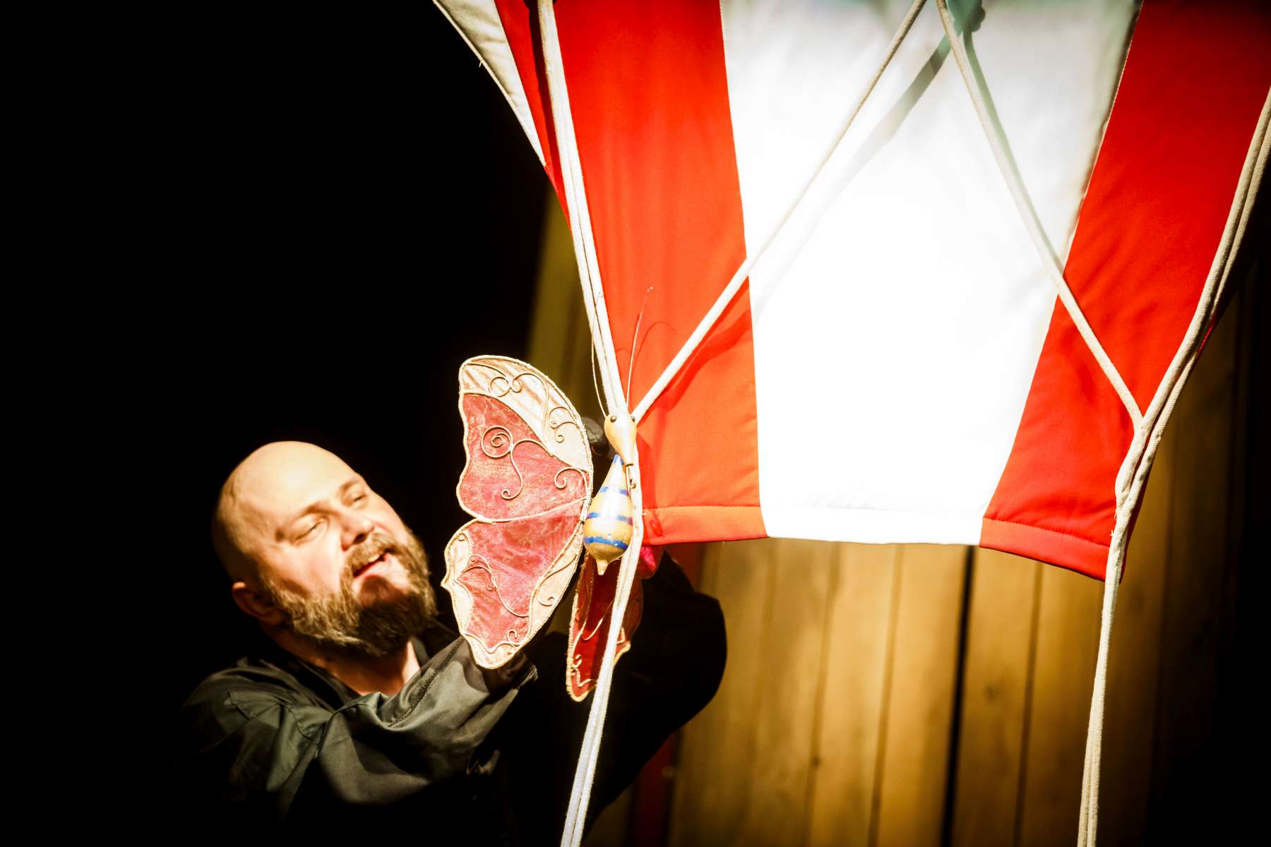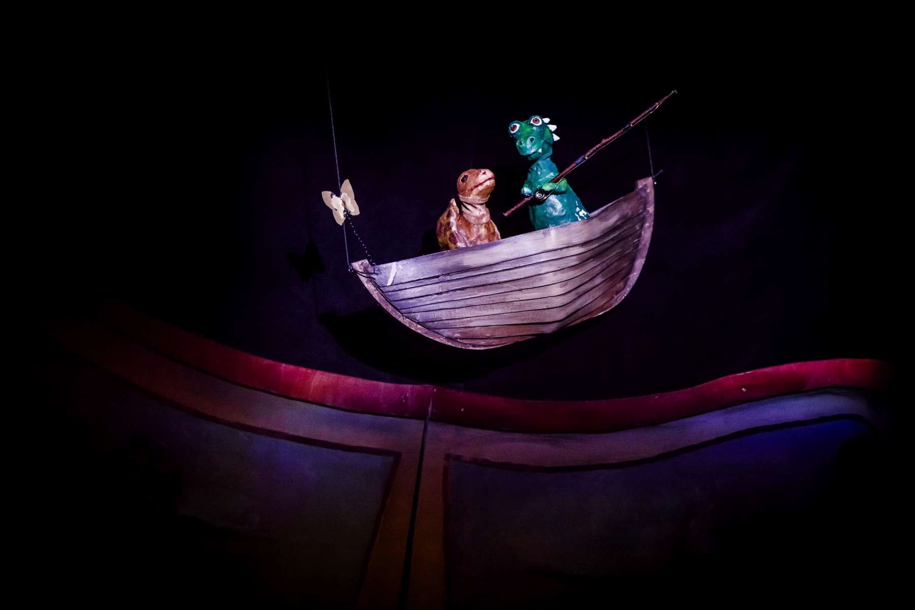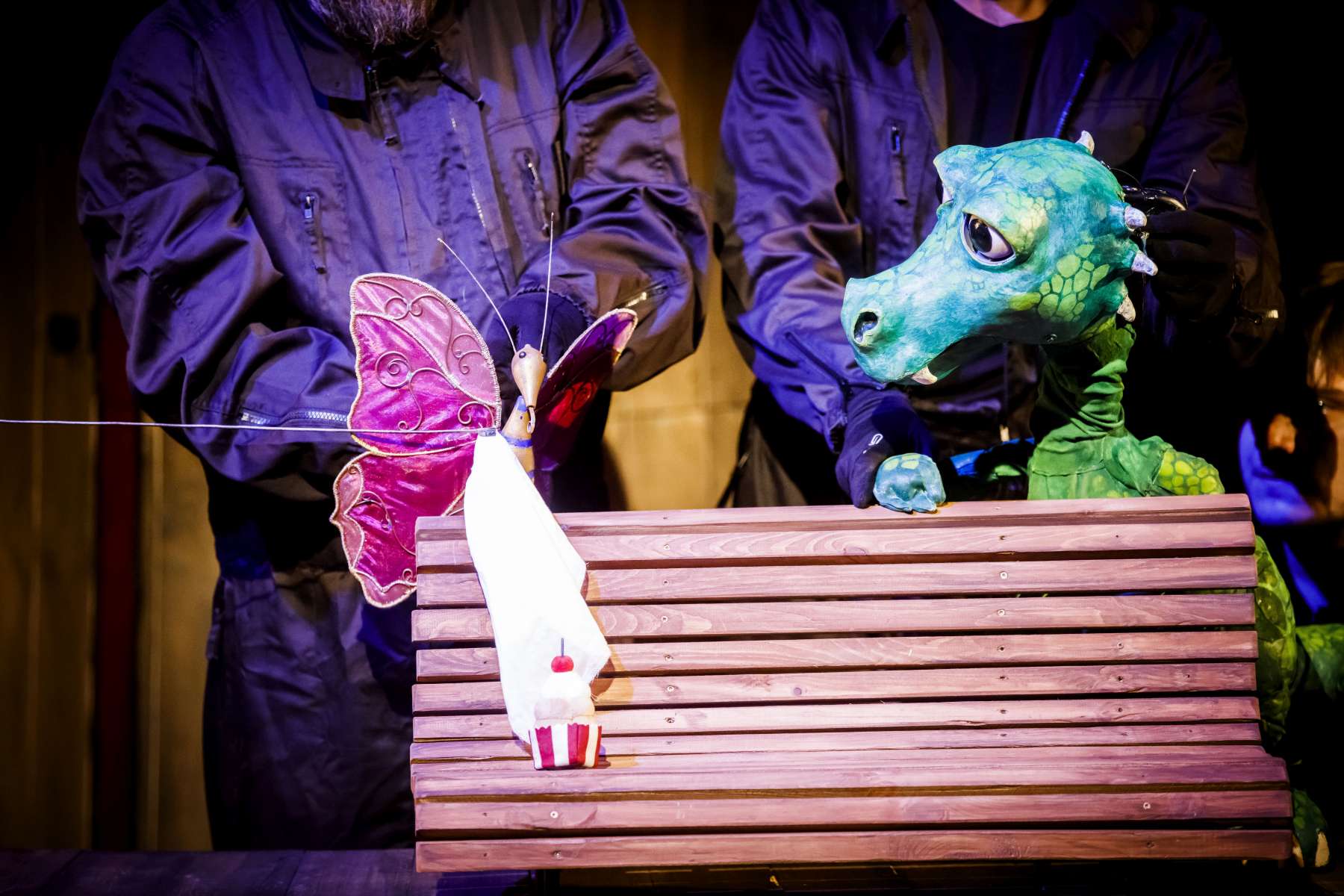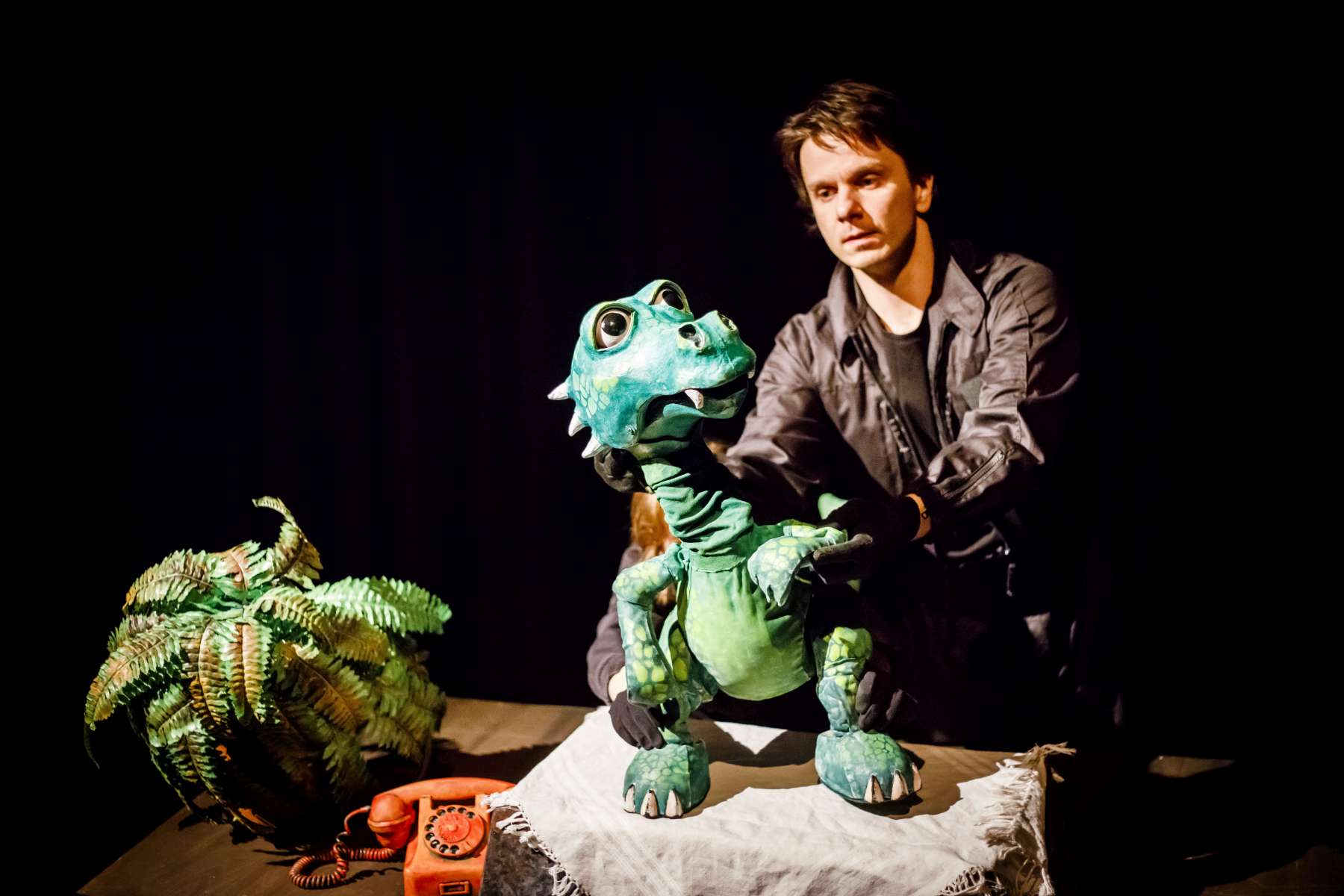 Animanty (termin Haliny Waszkiel) zaprojektowane przez scenografa Michała Wyszkowskiego są pierwszorzędne – pomysłowe i urocze, a do tego wydobywają talent artystów-animatorów. Byli oni widoczni dla widzów, więc można było się przyjrzeć ich kunsztowi, ale mieli na sobie czarne kombinezony – znak prymatu aktora ożywianego. Niezwykle podobał mi się sposób nadawania życia Dinozaurowi – jedna osoba, czyli Mateusz Smaczny, animowała głowę i tułów, wypowiadając kwestie, a druga (rotacyjnie) odpowiadała za ruch łap. Absolutnie mistrzowska była też praca z lalką Żółwia. Poddawał ją animacji Michał Jarmoszuk, trafnie naśladując ociężałe ruchy gada, otwierając buzię, wysuwając szyję itd. Dostosowany był do tego przeciągły i spokojny sposób mówienia. Do postaci Motyla był przypisany Krzysztof Bitdorf. Jego animant był najmniejszych rozmiarów, miał drewniany tułów i witrażowe skrzydełka. To oznaczało mniejszą ruchomość niż w przypadku dwóch pozostałych „muszkieterów”, którzy mieli pluszowe stawy i giętki kark. Mimo to, Bitdorf poradził sobie fruwająco, oddając głosem i trzepotem skrzydeł charakter rezolutnego motylego zawadiaki.