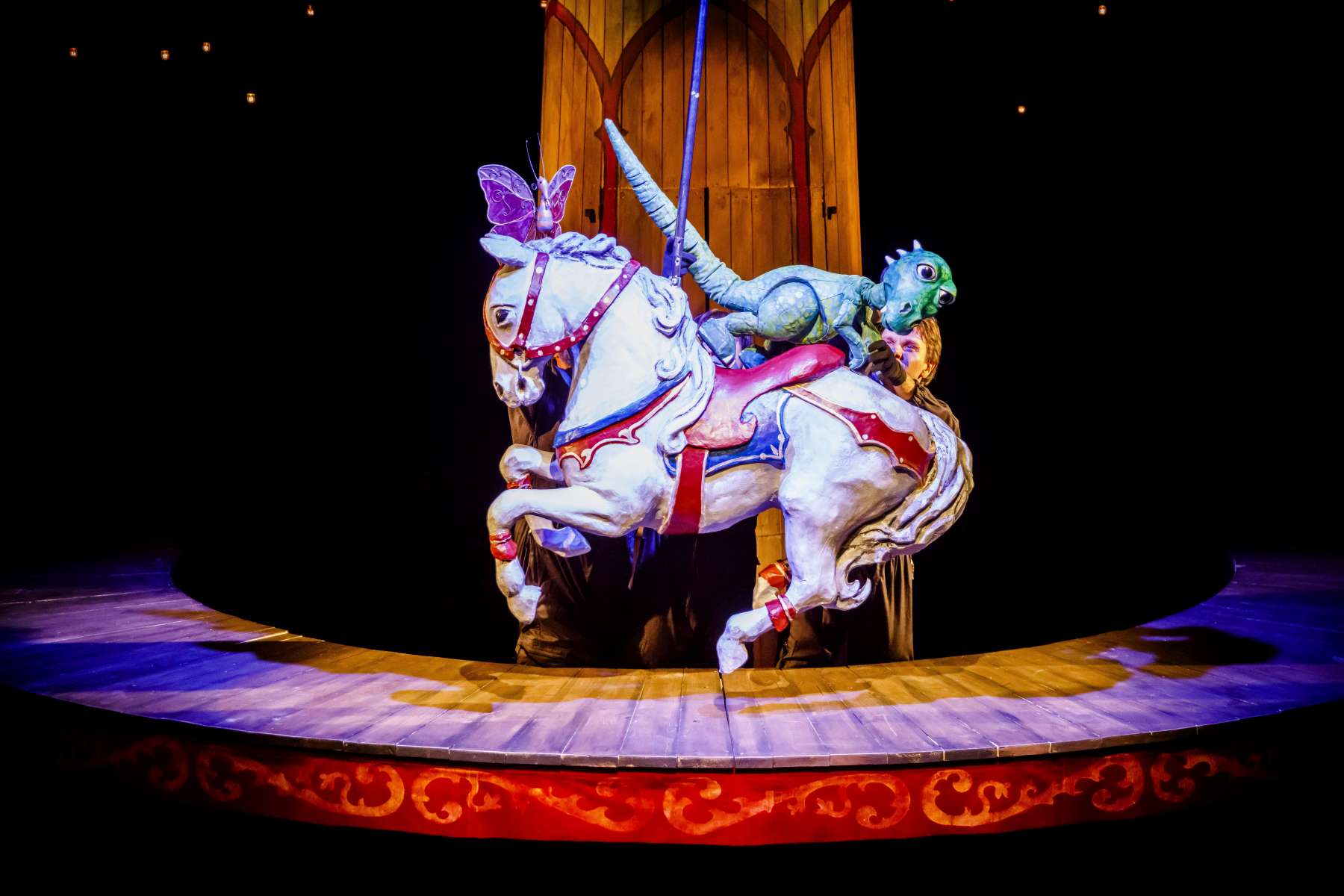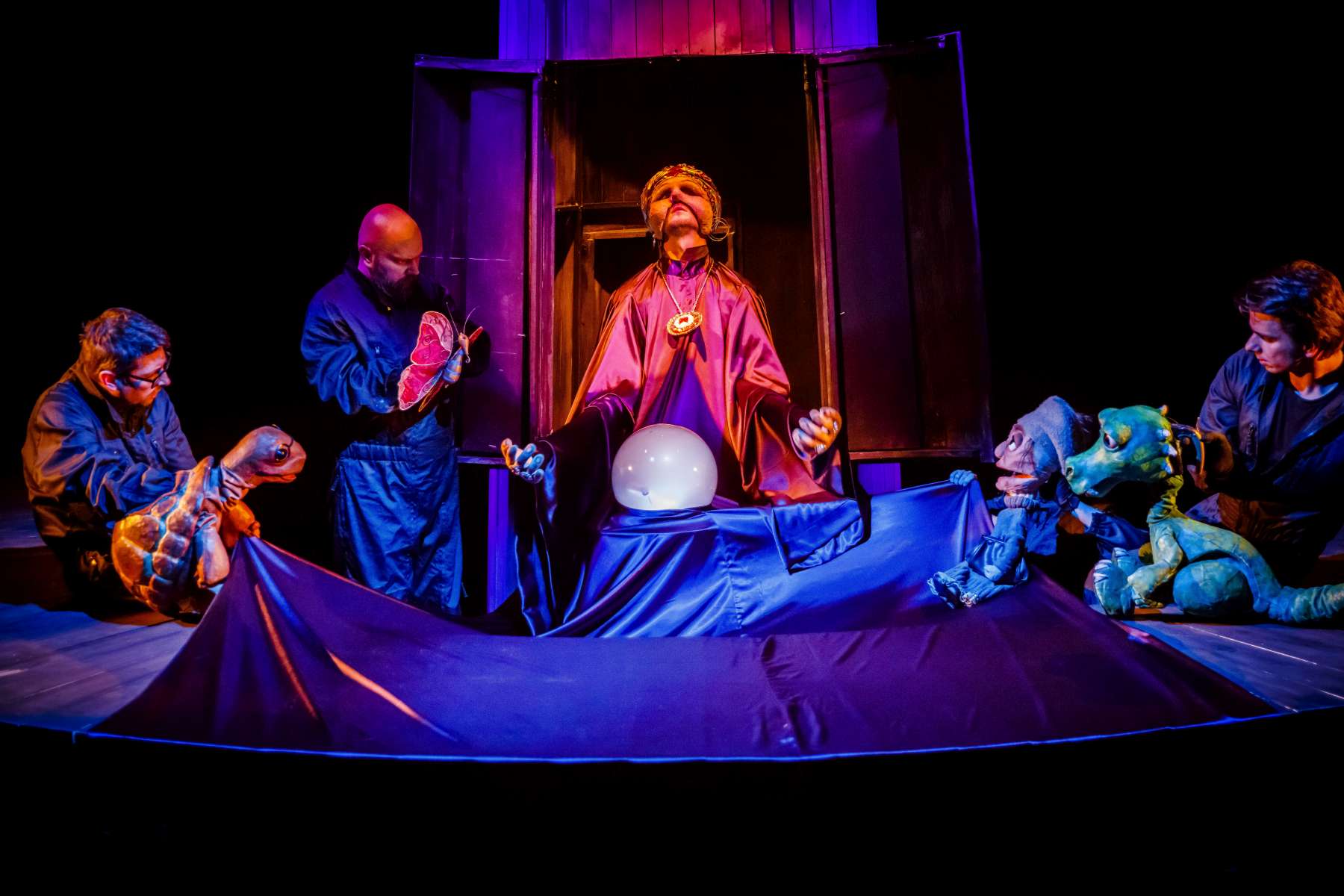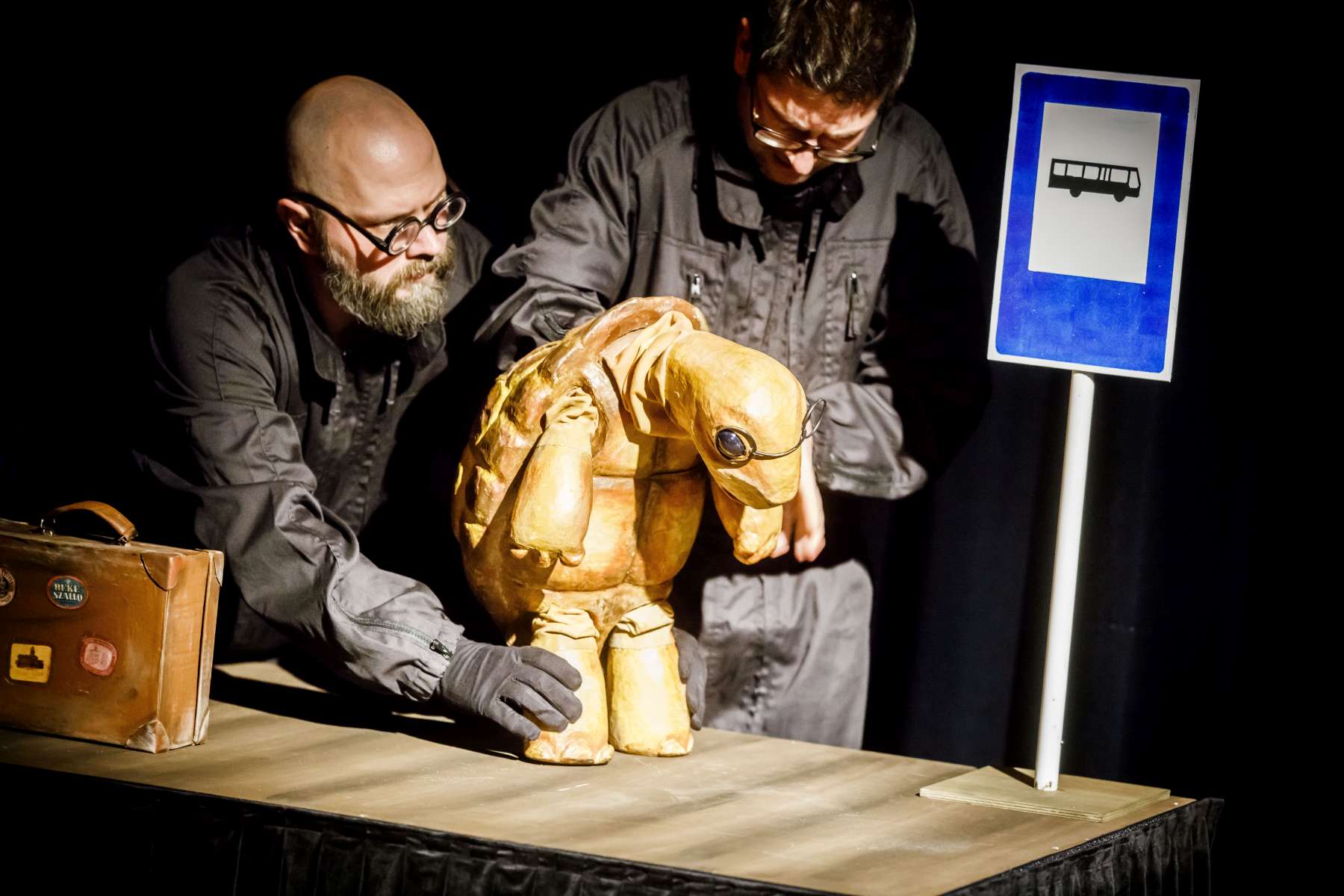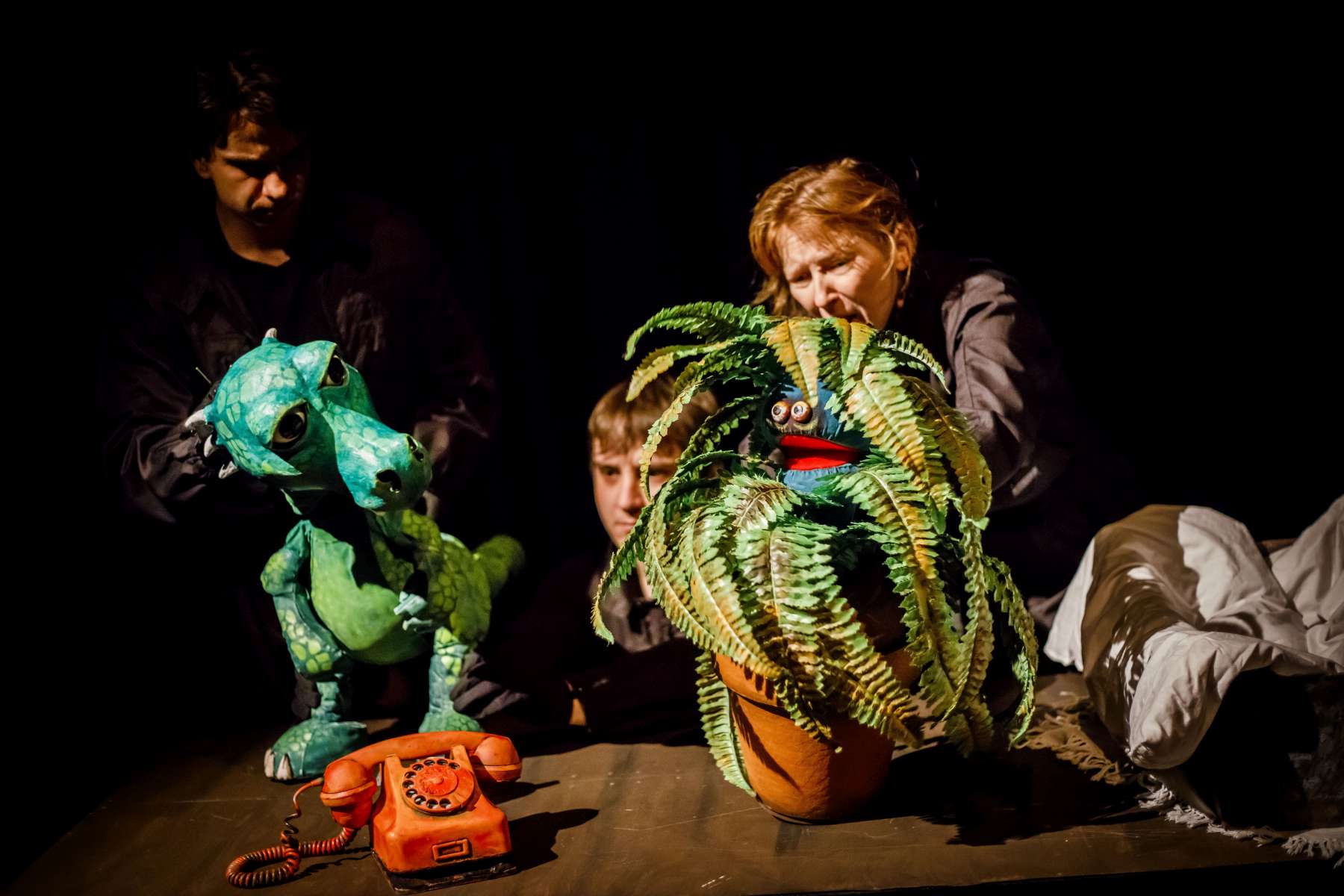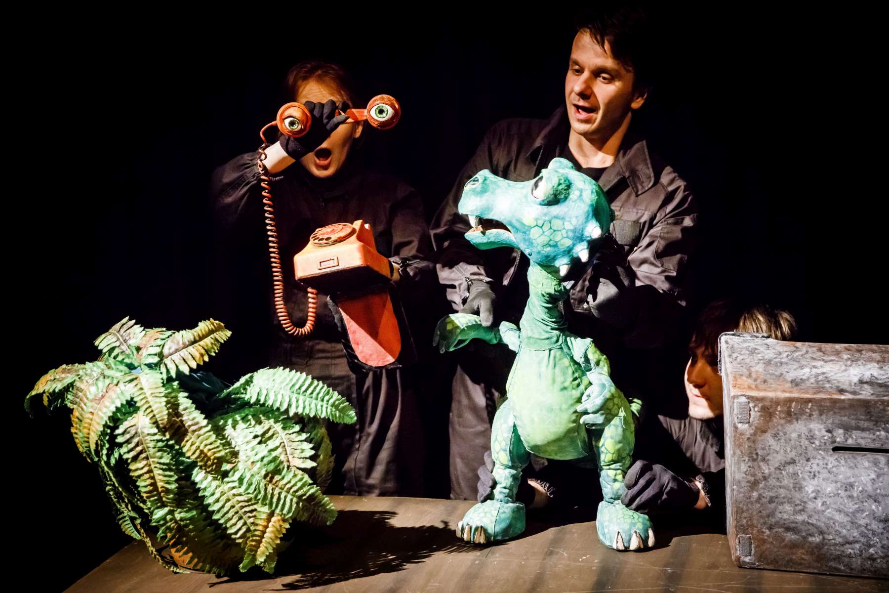Animanty (termin Haliny Waszkiel) zaprojektowane przez scenografa Michała Wyszkowskiego są pierwszorzędne – pomysłowe i urocze, a do tego wydobywają talent artystów-animatorów. Byli oni widoczni dla widzów, więc można było się przyjrzeć ich kunsztowi, ale mieli na sobie czarne kombinezony – znak prymatu aktora ożywianego. Niezwykle podobał mi się sposób nadawania życia Dinozaurowi – jedna osoba, czyli Mateusz Smaczny, animowała głowę i tułów, wypowiadając kwestie, a druga (rotacyjnie) odpowiadała za ruch łap. Absolutnie mistrzowska była też praca z lalką Żółwia. Poddawał ją animacji Michał Jarmoszuk, trafnie naśladując ociężałe ruchy gada, otwierając buzię, wysuwając szyję itd. Dostosowany był do tego przeciągły i spokojny sposób mówienia. Do postaci Motyla był przypisany Krzysztof Bitdorf. Jego animant był najmniejszych rozmiarów, miał drewniany tułów i witrażowe skrzydełka. To oznaczało mniejszą ruchomość niż w przypadku dwóch pozostałych „muszkieterów”, którzy mieli pluszowe stawy i giętki kark. Mimo to, Bitdorf poradził sobie fruwająco, oddając głosem i trzepotem skrzydeł charakter rezolutnego motylego zawadiaki.