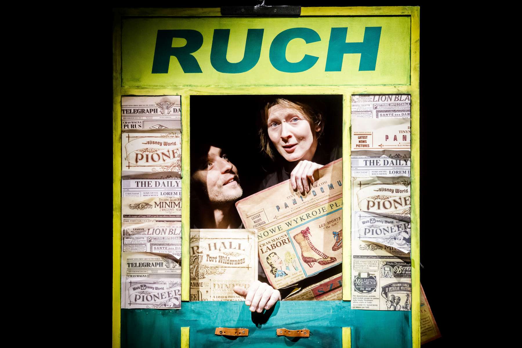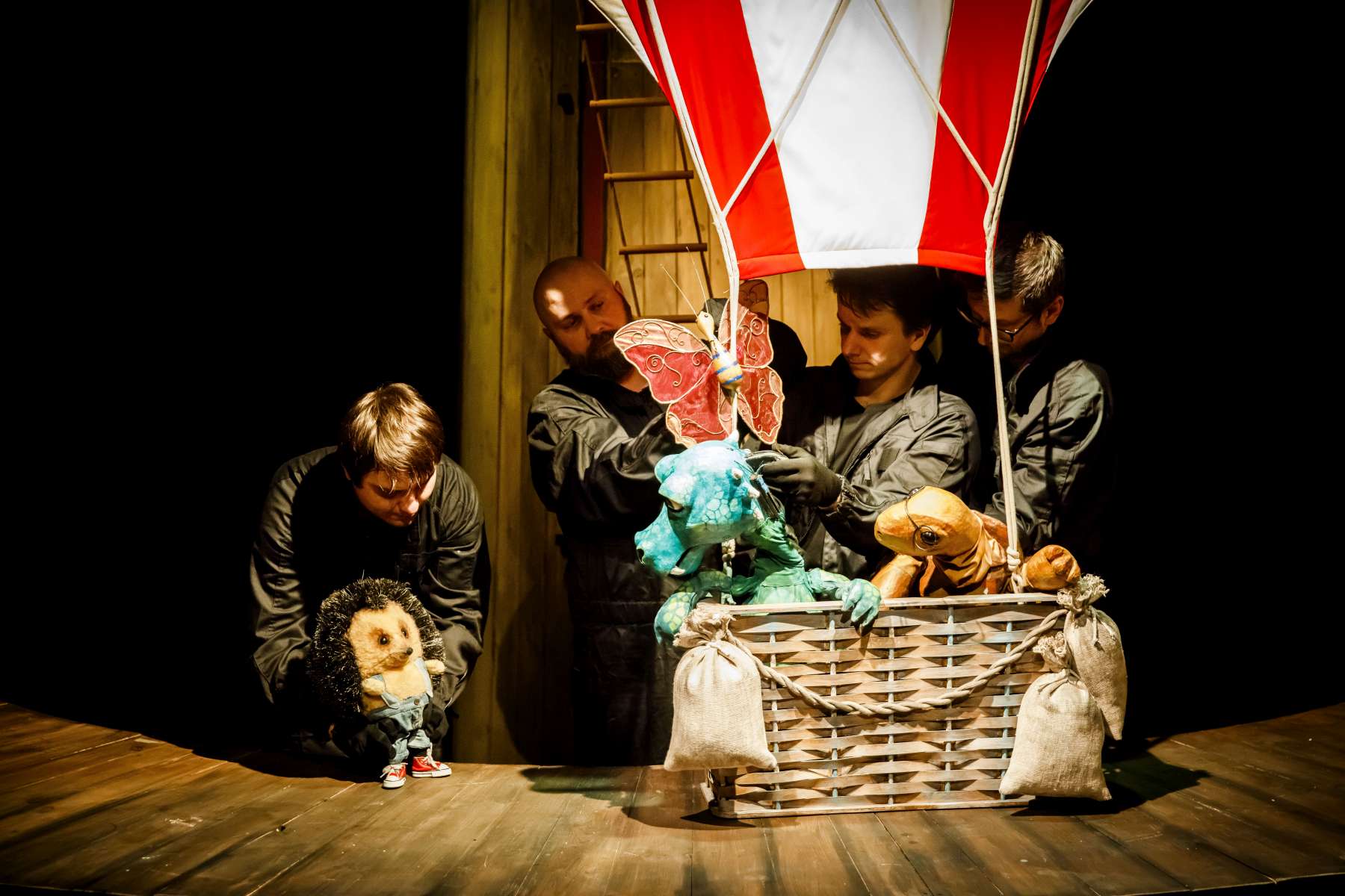 Guśniowska-reżyserka rozmieściła swój spektakl na kilku poziomach głębokości sceny. Część wydarzeń rozgrywa się na małej estradzie prosceniowej, a inne na scenie właściwej, gdzie kręci się obrotówka-karuzela wesołego miasteczka. Lalki mają także swoje miniatury, które stara się dostrzec publiczność z zadartą głową, śledząc lot balonem, który wymarzyli sobie przyjaciele. Wszystkie rekwizyty są postarzone, przypominają plan czarno-białego filmu albo dom prababci, co tworzy sielsko-melancholijny klimat.