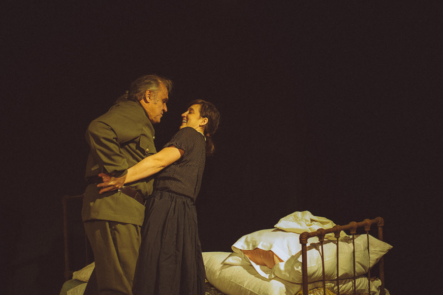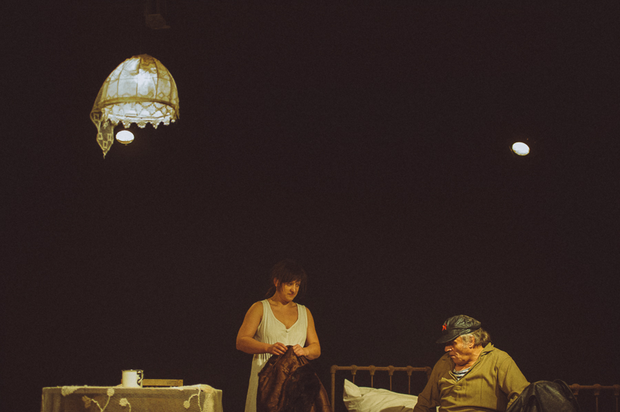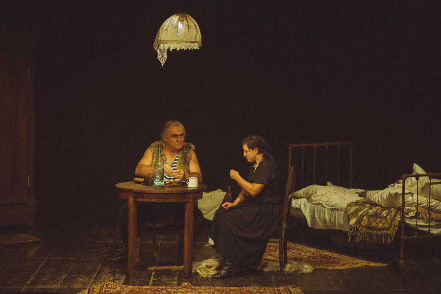 Katarzyna Siergiej, pełna energii, dwoi się i troi, zmienia maski raz płaszcząc się przed prześladowcami, innymi razy przejmując nad nimi władzę. Wykorzystuje ich słabości, by obronić cześć i wykpić niecne zamiary. Ryszard Doliński ma większą szansę na wygranie się. Od operetkowo zakochanego, starzejącego się panicza, po prostaka niewylewającego za kołnierz, obżerającego się na oczach widowni, po skretyniałego, ale w istocie najgroźniejszego w swej podejrzliwości i rewolucyjnej czujności komisarza. Drobnymi gestami, gagami podkreśla komizm postaci. Reżyserka mu w tym wyraźnie dopomaga, choćby każąc spektakularnie oddawać mocz podczas pijaństwa. I w żadnym razie nie obraża to ani nie gorszy widzów.