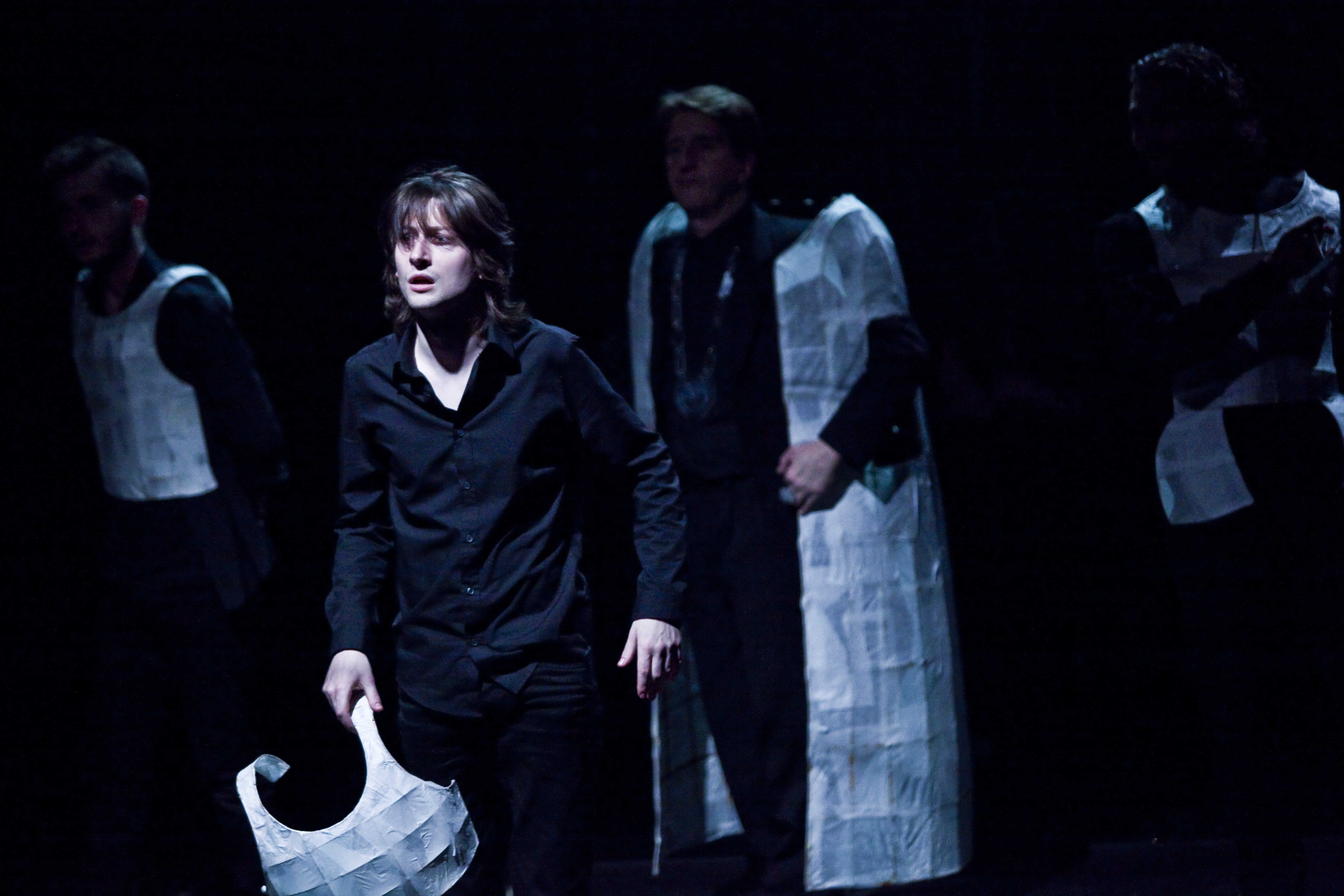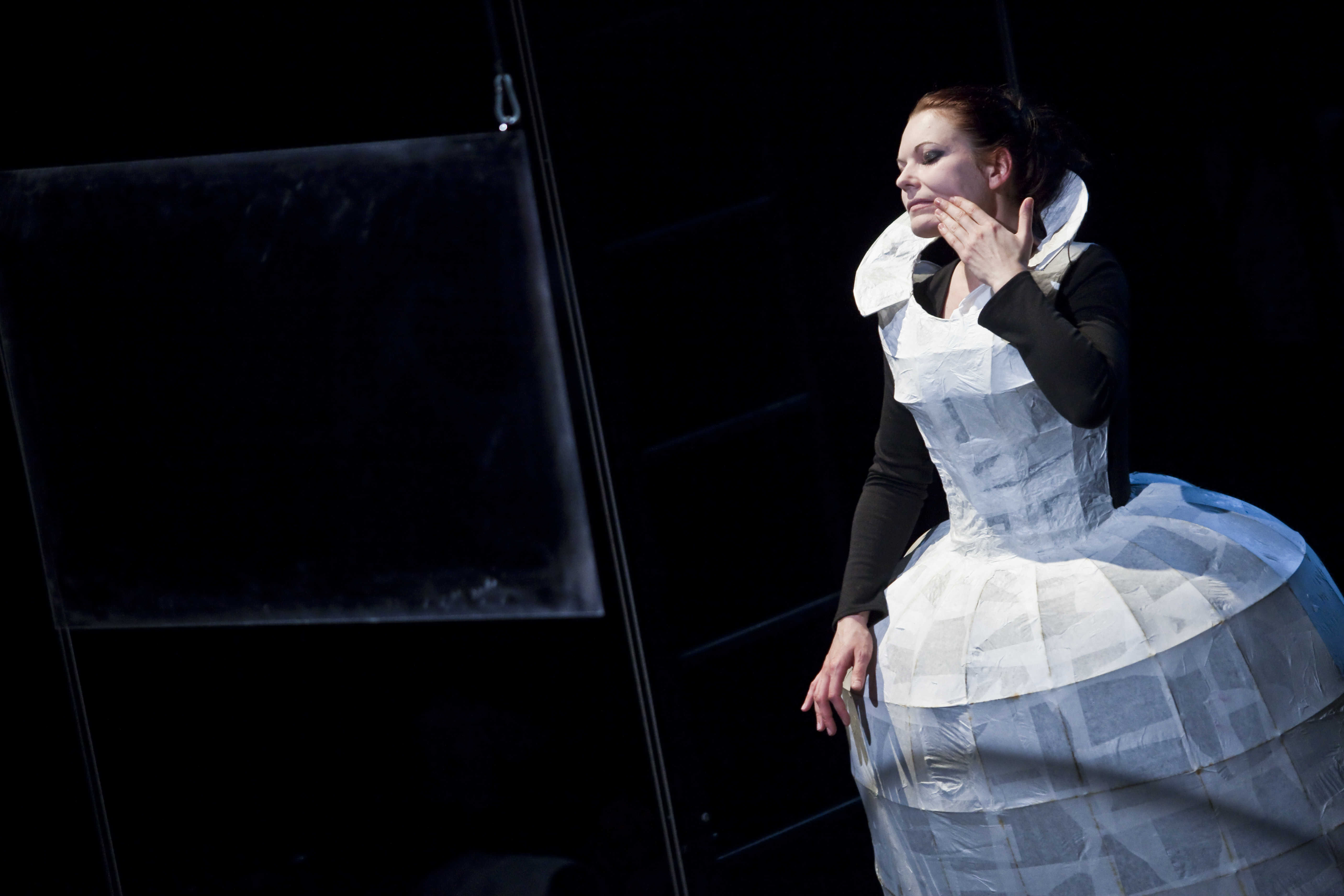 W białostockim spektaklu ów dualizm, przejście z normalności i spokoju w krzyk, wojowniczość, nienawiść zaznaczone jest też w sferze kostiumu. Aktorzy ubrani na czarno wsuwają się w sztywne papierowe zbroje, wojenne suknie - co ciekawe, w kolorze białym. Gdy tylko podjeżdża na linie tego typu odzienie - po pewnym czasie już wiadomo: będzie groźnie, krzykliwie i nienawistnie. Ale też, o ile w kolejnych zbiorowych scenach zaczyna to już nużyć, o tyle w indywidualnych prezentacjach owe przejście z czerni w biel i odwrotnie - bywa intrygujące. W jednej z takich wyrazistych, pięknych scen pani Montecchi (Magdalena Czajkowska) poklepuje nerwowo policzki. Może to krem, co ma zatrzymać upływający czas, a może gest, który ma pomóc otrząsnąć się z trwającego bezwładu, marazmu nienawiści. Matka Romea powoli uwalnia się papierowego gorsetu, zmienia się jej twarz i cała sylwetka, znika sztywność, wraca życie, lekkość, jest ulga. Montecchi tęskni za normalnością, chce wyszywać, a nie nienawidzieć. Ale to tylko złudzenie, za chwilę przychodzi mąż (Paweł Szymański) i metodycznie popycha ją w stronę papierowego pancerza. Ta scena zresztą ma swoje wyraziste, przejmujące dokończenie w finale spektaklu. Gdy pani Montecchi nie może znieść śmierci syna, wyrywa dziurę w gorsecie i odchodzi, pan Montecchi przygląda się porzuconemu gorsetowi nierozumiejącym wzrokiem. Z jego ściągniętej twarzy, przygarbionej sylwetki ból aż promieniuje, nie ma już walecznej postawy, pozostaje obnażony, zrozpaczony człowiek.