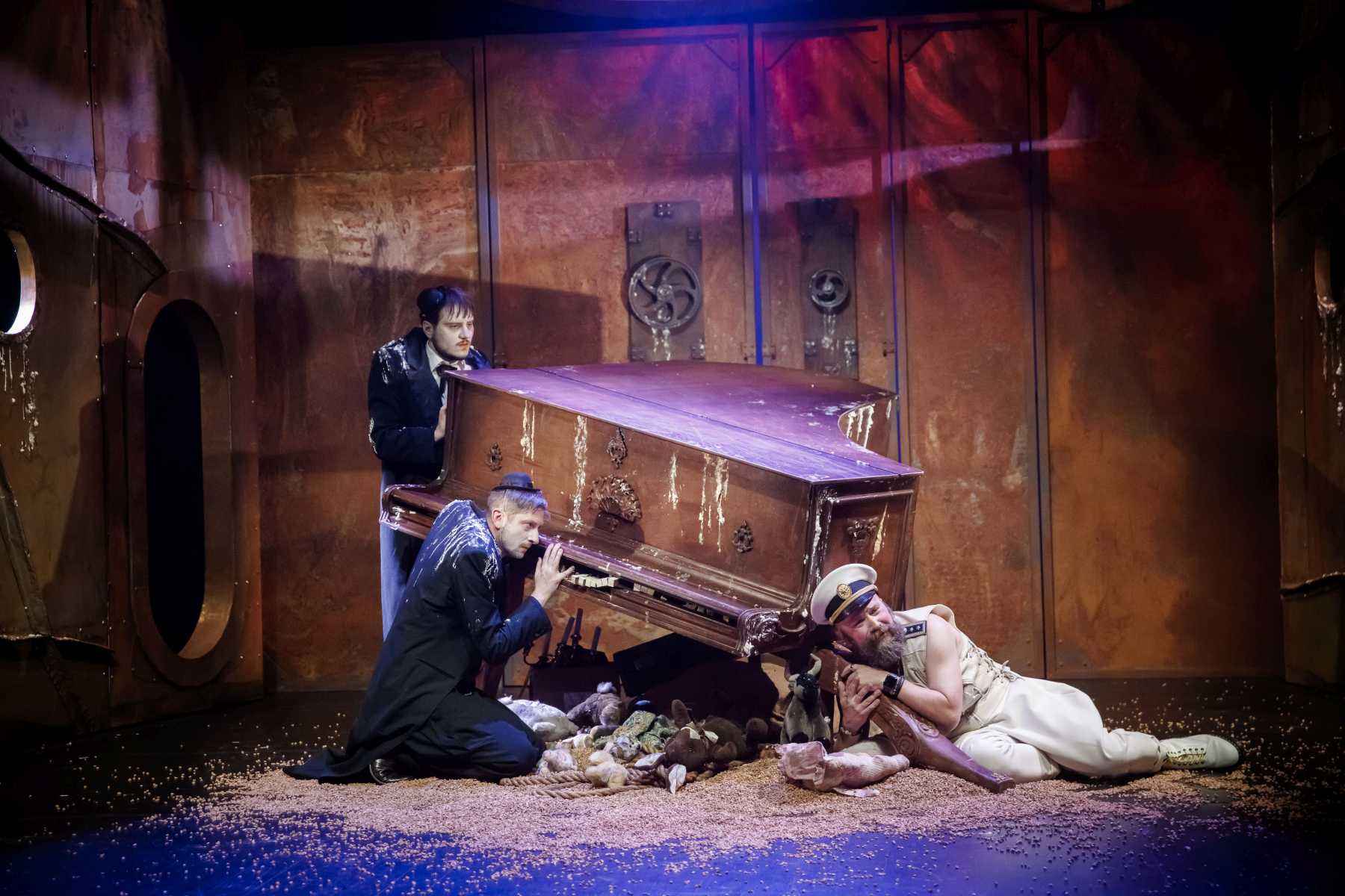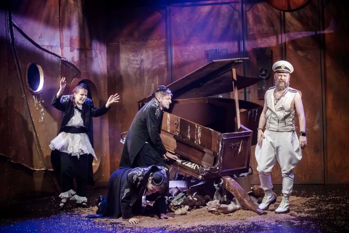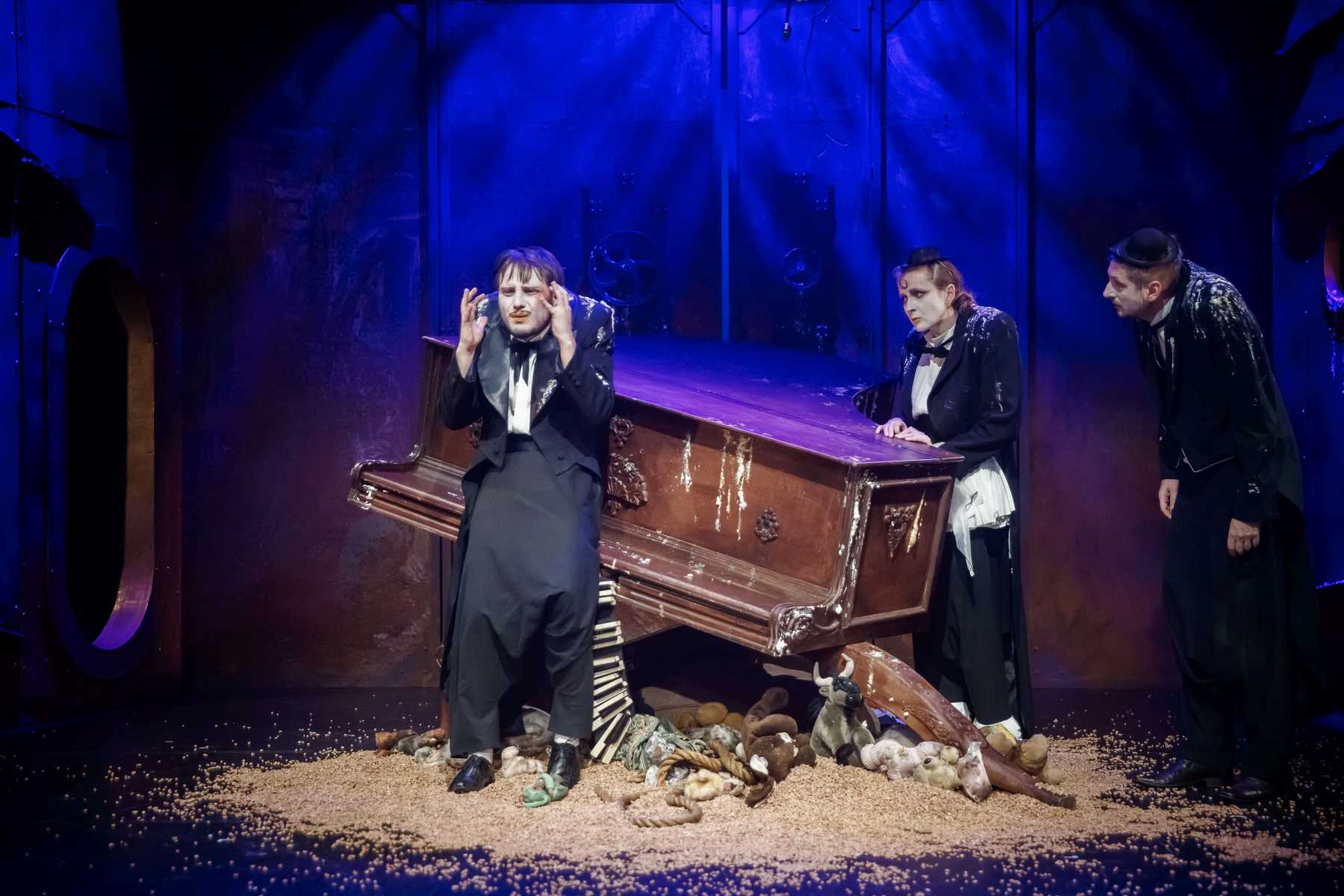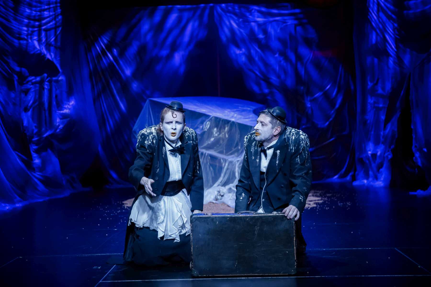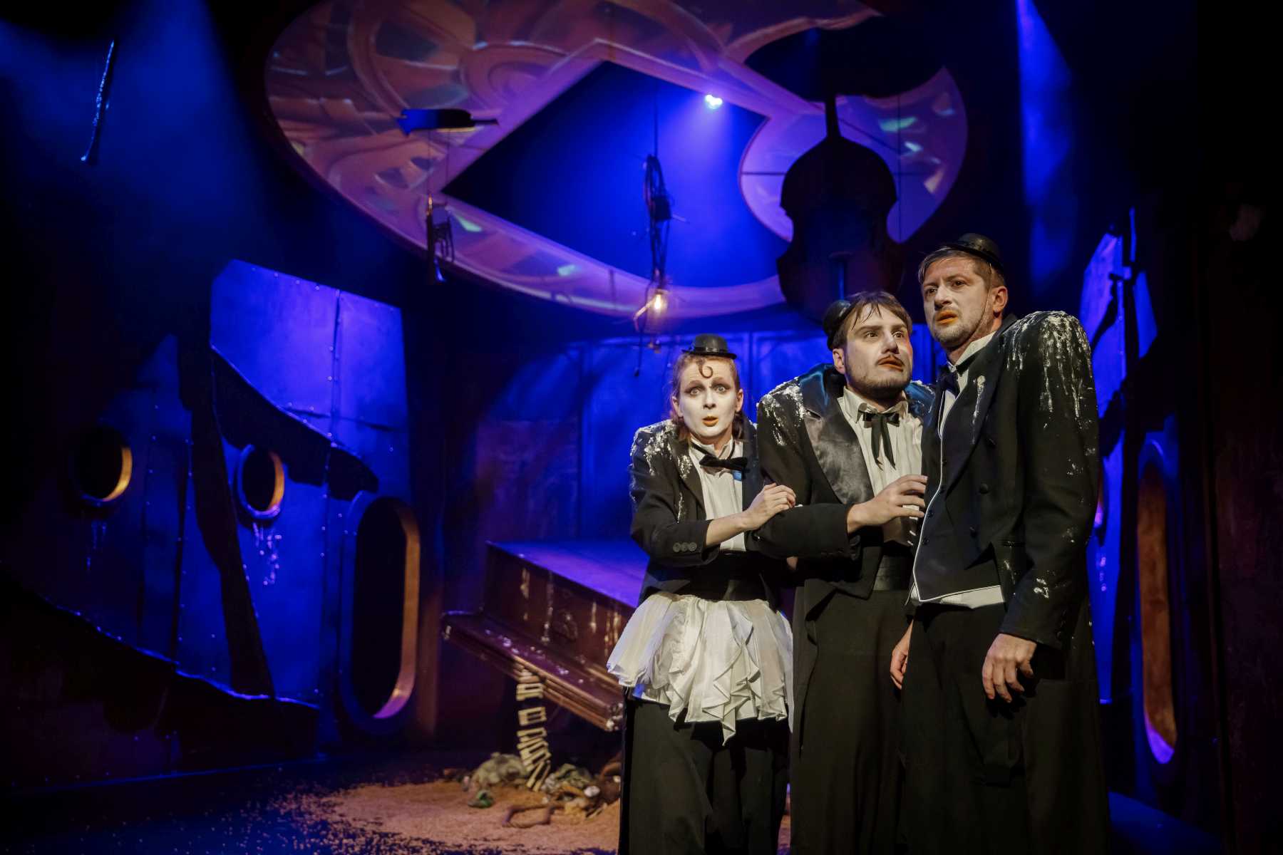 Intrygującym pomysłem okazuje się konstrukcja umieszczona na scenie, tak wieloznaczna, że można odczytywać ją na różne sposoby. Przechylony kufer? Zniszczony fortepian? A może rodzaj katafalku, który - gdy spektakl na chwilę przybiera ciemniejszą barwę - sygnalizuje memento mori dla nas i świata? Wtedy i Pingwiny krążące po scenie, odziane w czarne fraki i z twarzą zmienioną makijażem w maskę, przypominają przez chwilę żałobnych ceremoniarzy. Ale oto na scenę wkracza Gołąb, cały w bieli - i ponure wrażenie umyka. Konstrukcja też w jednej chwili nabiera innych znaczeń: jest nie tylko symbolem rozpadu, ale przecież i kryjówką, schronieniem, gdy trzeba kogoś ratować z opresji.