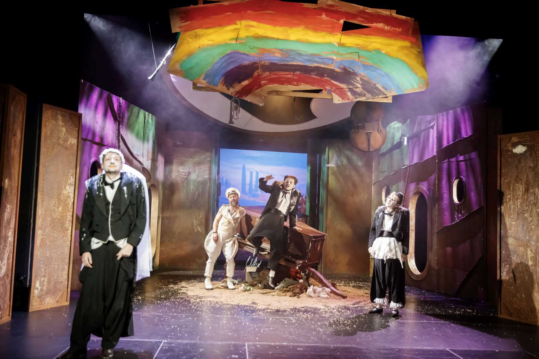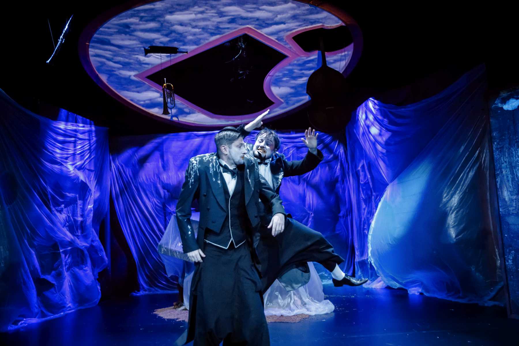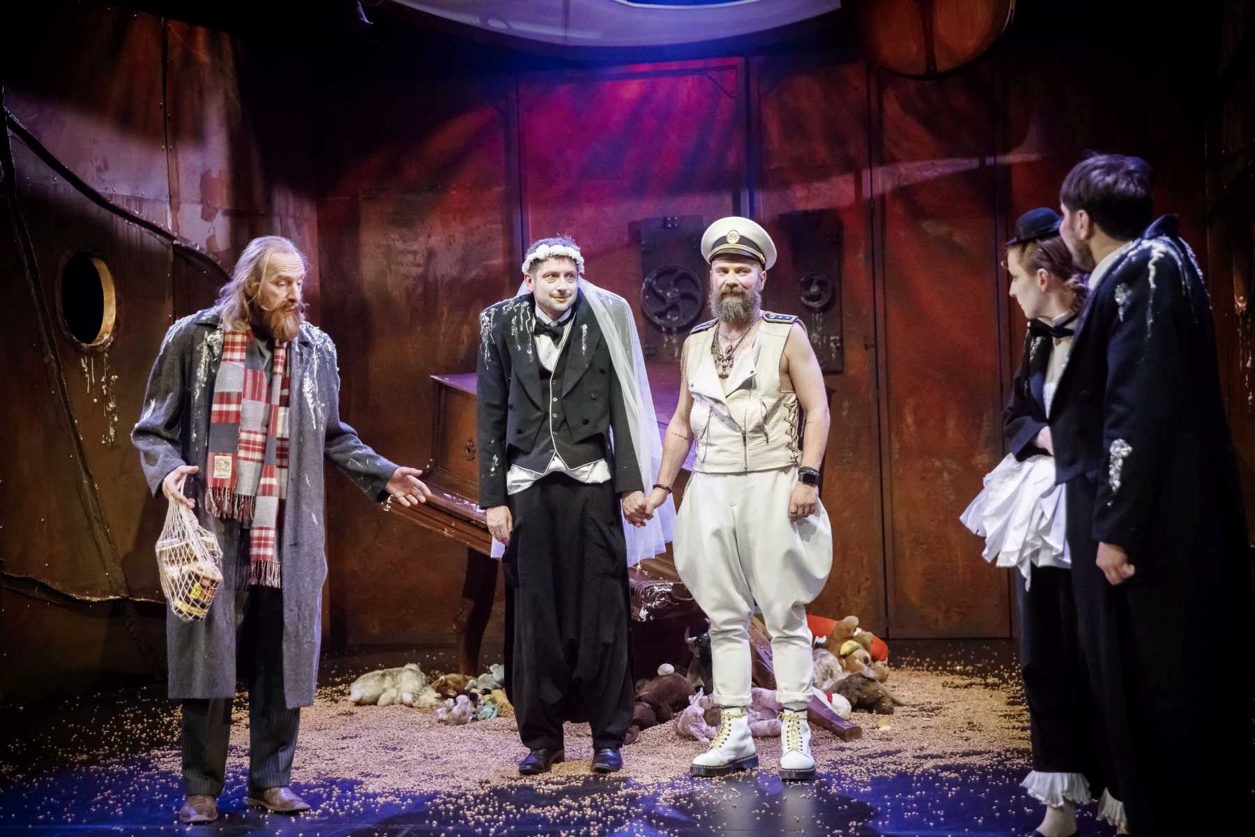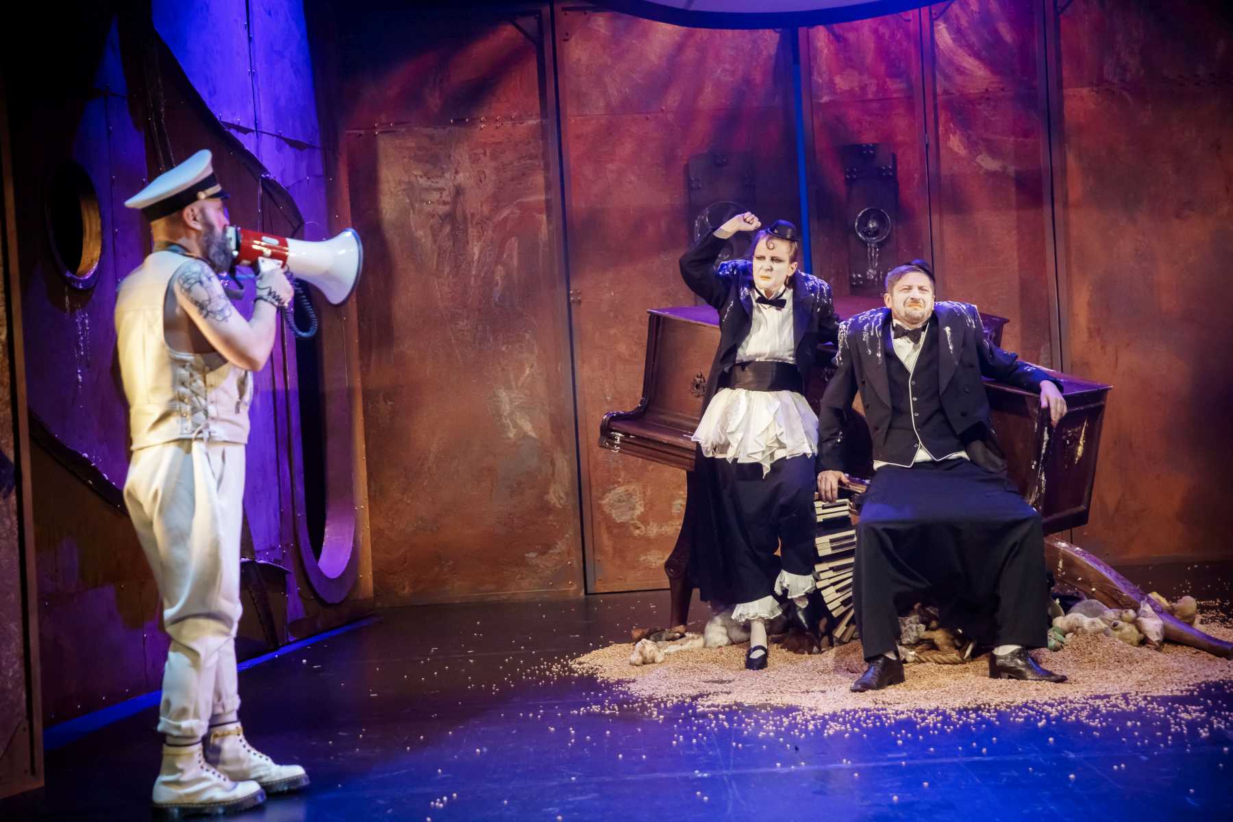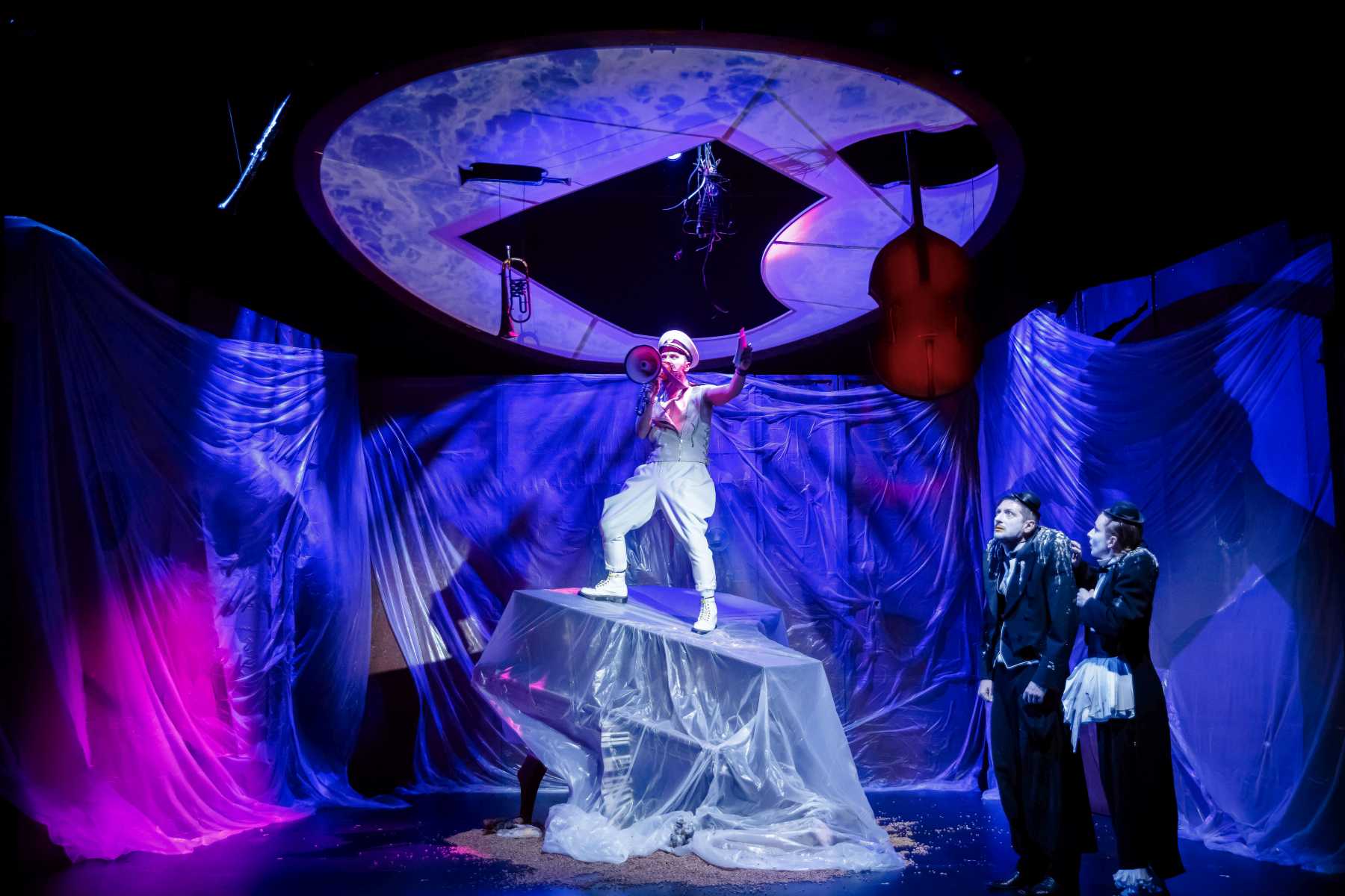 Intrygującym pomysłem okazuje się konstrukcja umieszczona na scenie, tak wieloznaczna, że można odczytywać ją na różne sposoby. Przechylony kufer? Zniszczony fortepian? A może rodzaj katafalku, który - gdy spektakl na chwilę przybiera ciemniejszą barwę - sygnalizuje memento mori dla nas i świata? Wtedy i Pingwiny krążące po scenie, odziane w czarne fraki i z twarzą zmienioną makijażem w maskę, przypominają przez chwilę żałobnych ceremoniarzy. Ale oto na scenę wkracza Gołąb, cały w bieli - i ponure wrażenie umyka. Konstrukcja też w jednej chwili nabiera innych znaczeń: jest nie tylko symbolem rozpadu, ale przecież i kryjówką, schronieniem, gdy trzeba kogoś ratować z opresji.