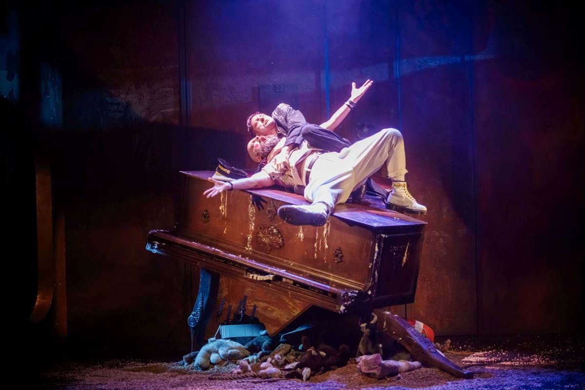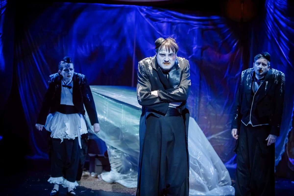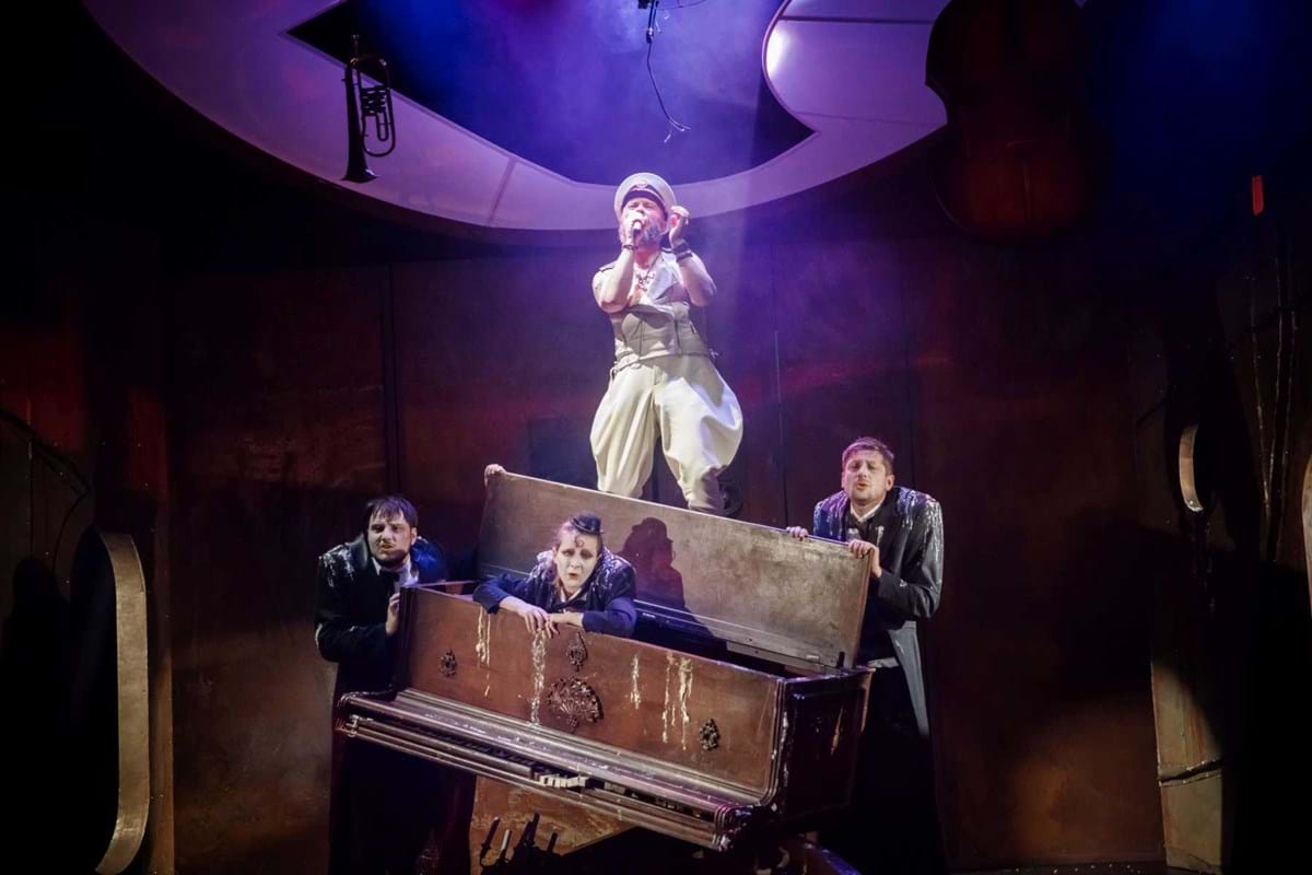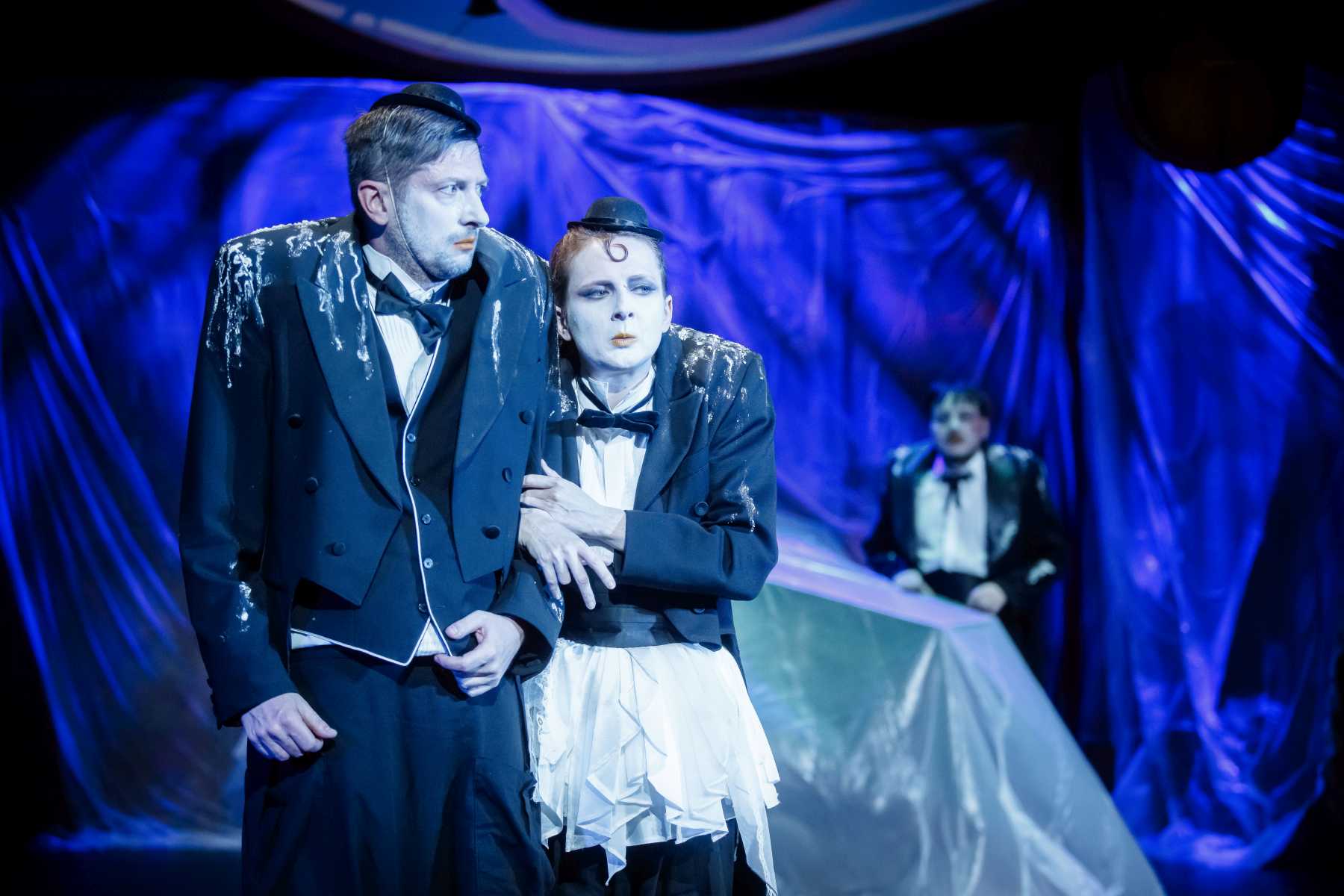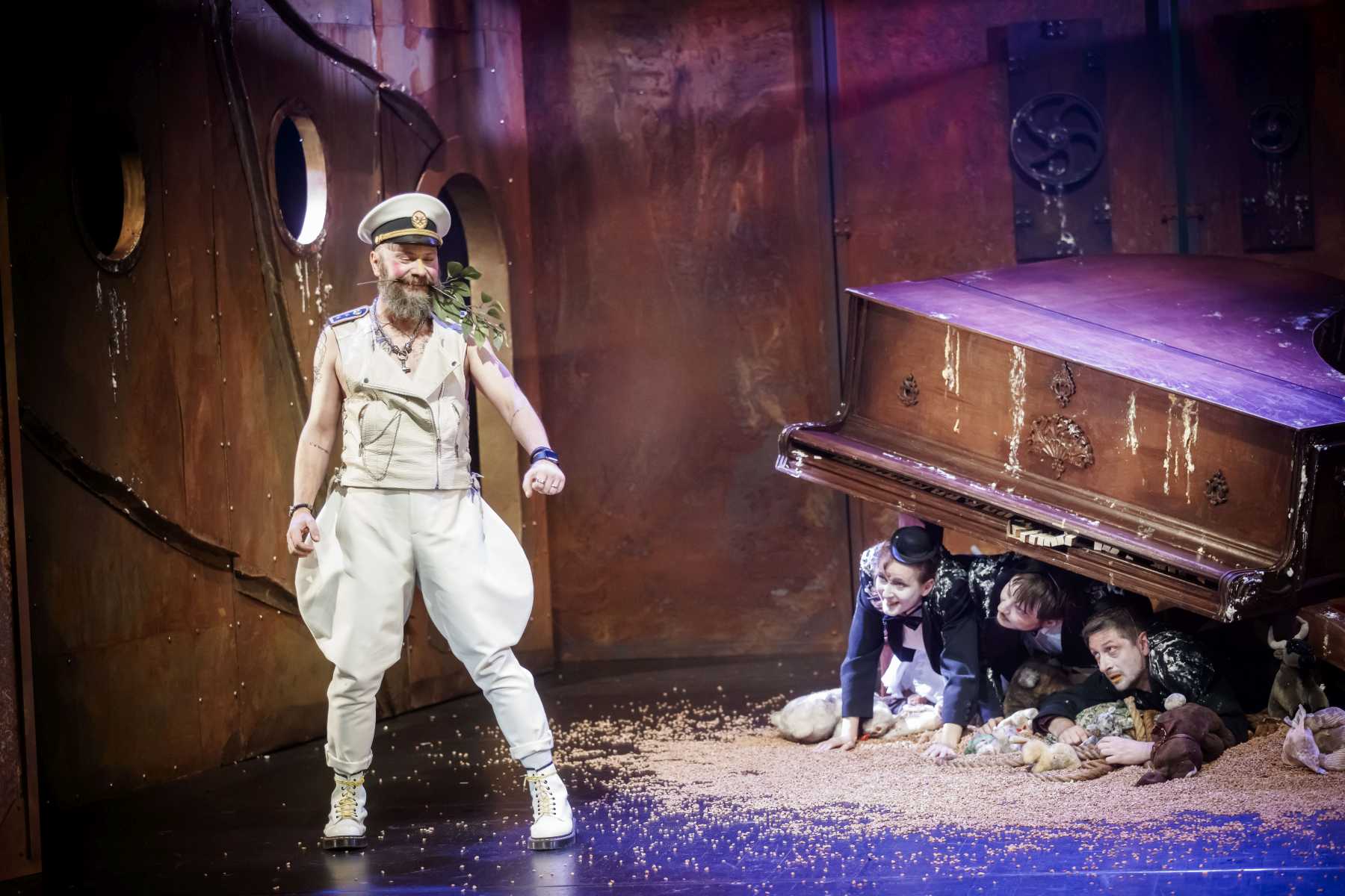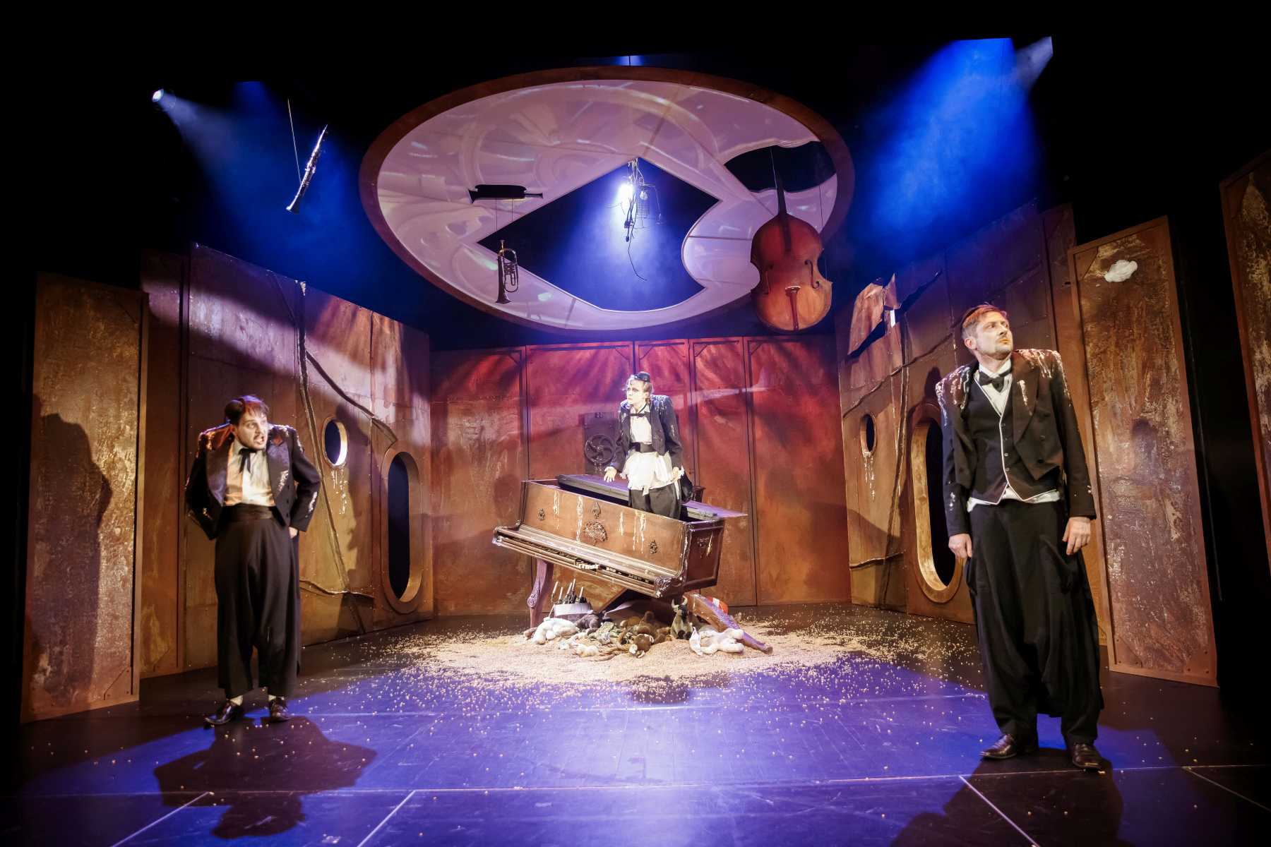 Intrygującym pomysłem okazuje się konstrukcja umieszczona na scenie, tak wieloznaczna, że można odczytywać ją na różne sposoby. Przechylony kufer? Zniszczony fortepian? A może rodzaj katafalku, który - gdy spektakl na chwilę przybiera ciemniejszą barwę - sygnalizuje memento mori dla nas i świata? Wtedy i Pingwiny krążące po scenie, odziane w czarne fraki i z twarzą zmienioną makijażem w maskę, przypominają przez chwilę żałobnych ceremoniarzy. Ale oto na scenę wkracza Gołąb, cały w bieli - i ponure wrażenie umyka. Konstrukcja też w jednej chwili nabiera innych znaczeń: jest nie tylko symbolem rozpadu, ale przecież i kryjówką, schronieniem, gdy trzeba kogoś ratować z opresji.