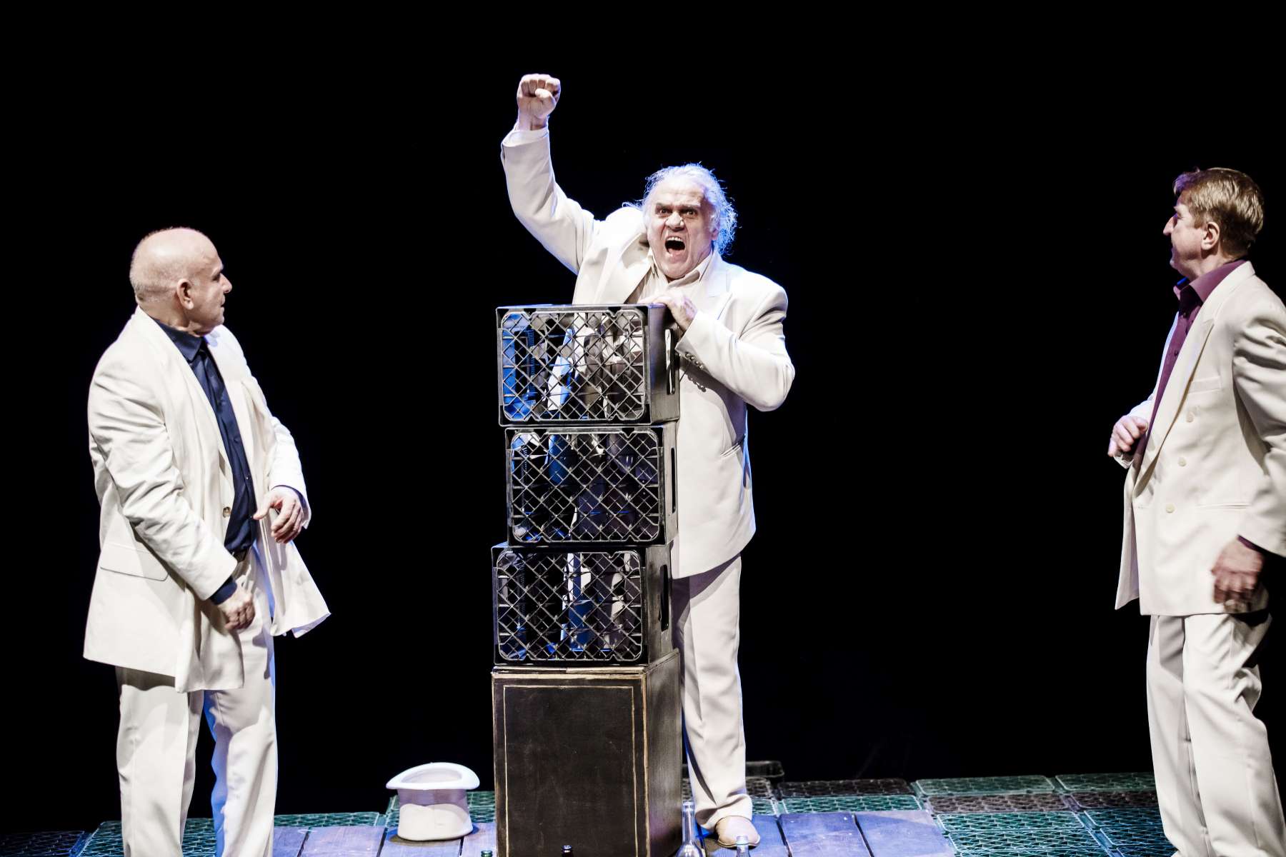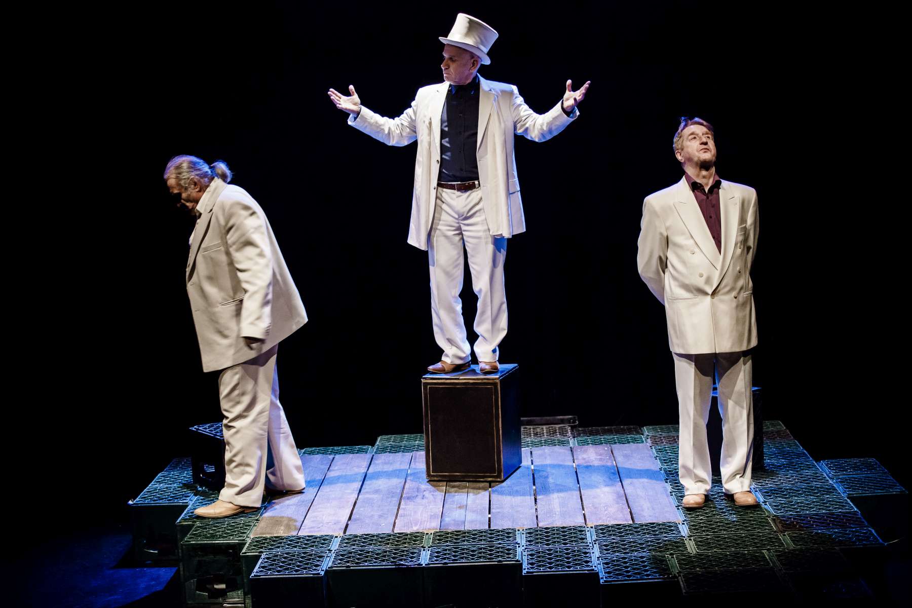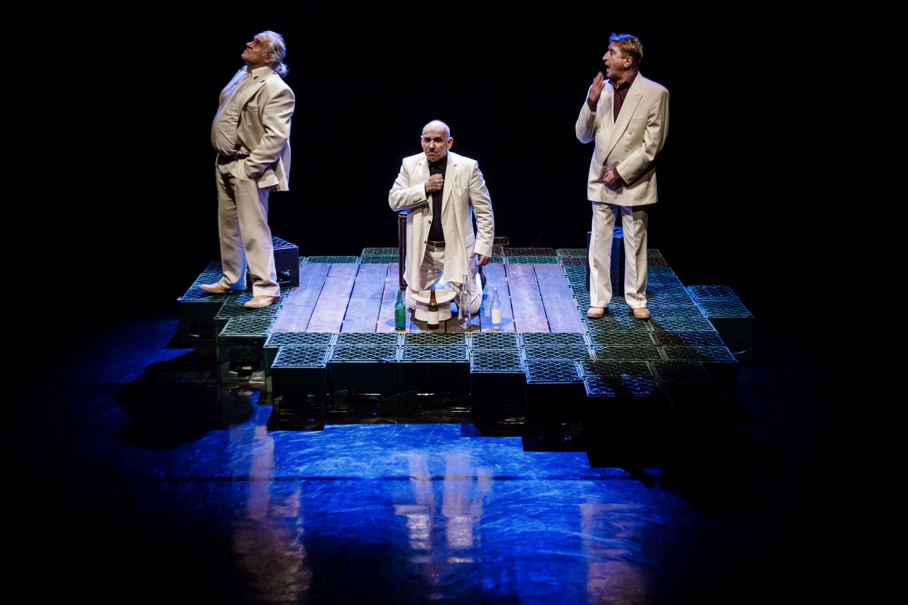 Cała trójka dryfuje na tratwie, sklejonej ze starych skrzynek na butelki. Całość skonstruowana jest sprytnie - choć osadzona na podłodze, to cały czas się kołysze, chybocze, przechyla. Aktorzy ciągle walczą z utrzymanie równowagi. A że czarna tafla wokół odbija światło jak woda, rzeczywiście można ulec złudzeniu, że tratwa dryfuje po falach.