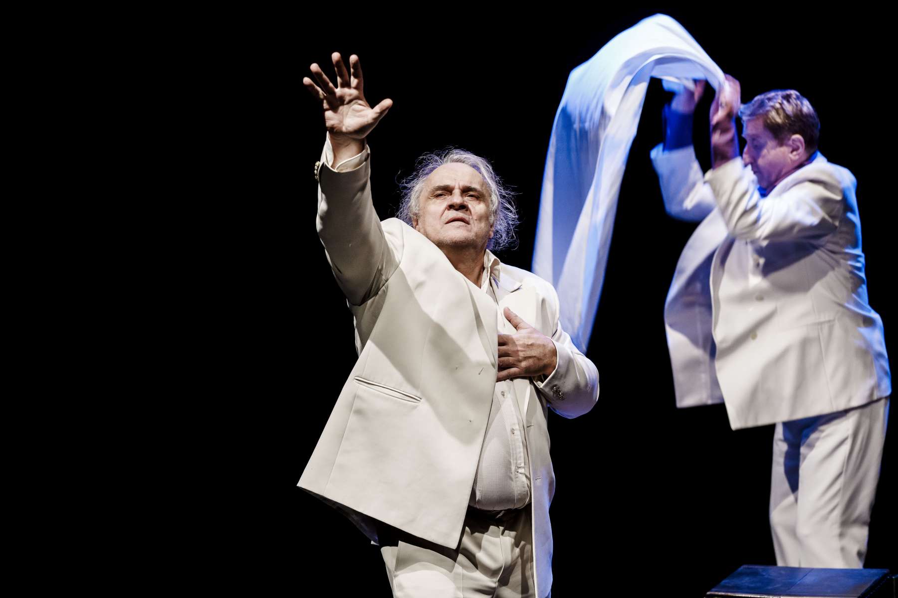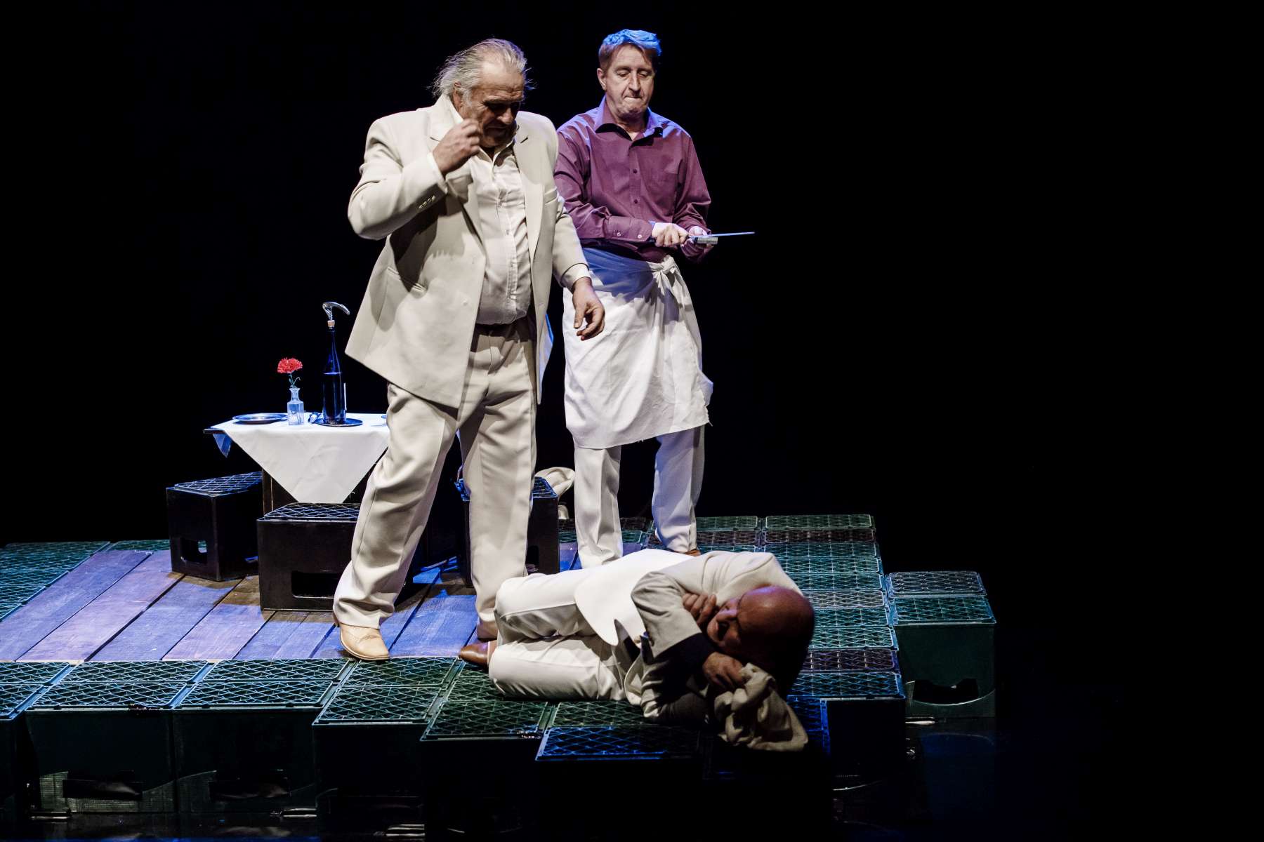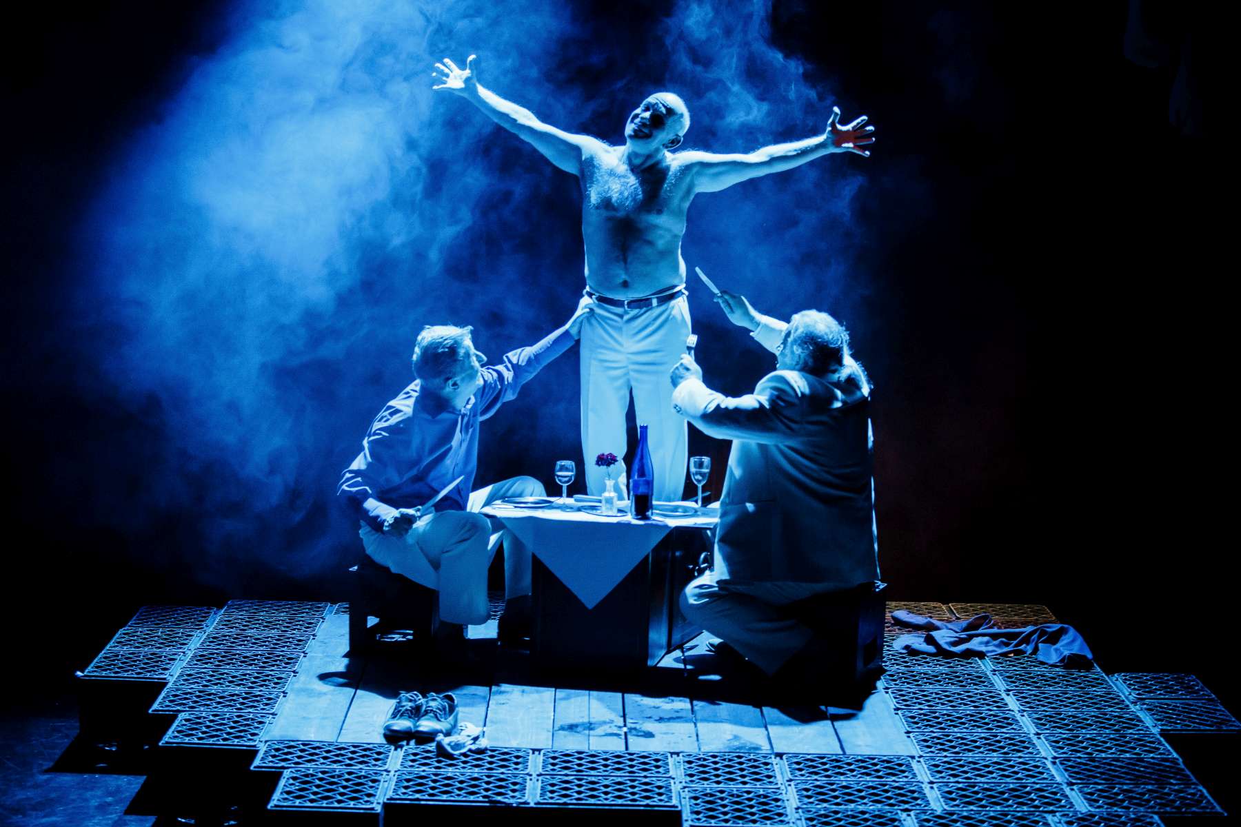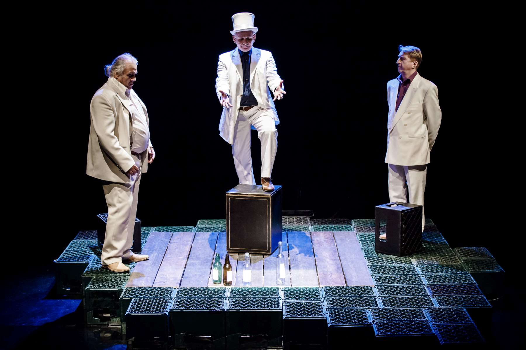 Cała trójka dryfuje na tratwie, sklejonej ze starych skrzynek na butelki. Całość skonstruowana jest sprytnie - choć osadzona na podłodze, to cały czas się kołysze, chybocze, przechyla. Aktorzy ciągle walczą z utrzymanie równowagi. A że czarna tafla wokół odbija światło jak woda, rzeczywiście można ulec złudzeniu, że tratwa dryfuje po falach.