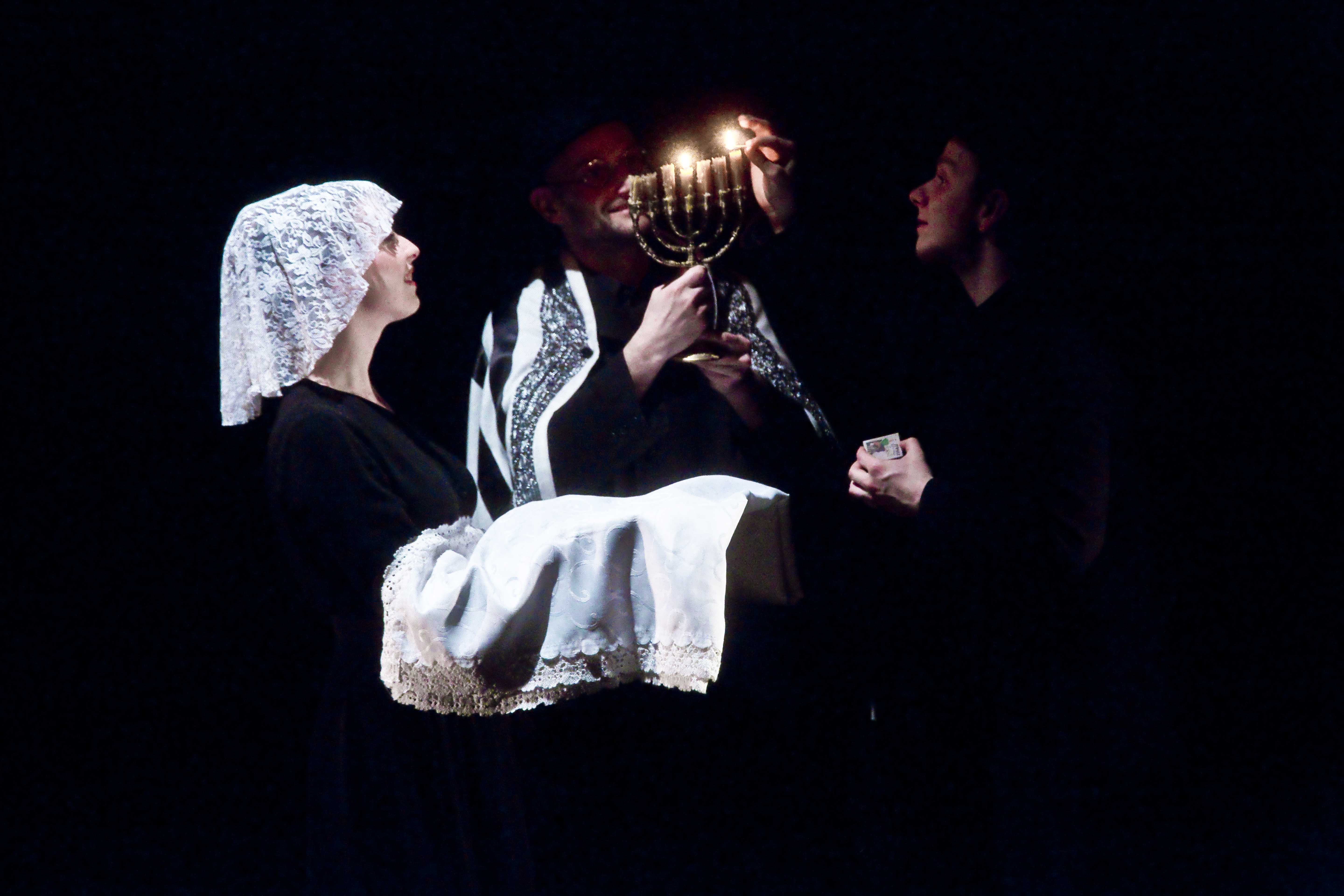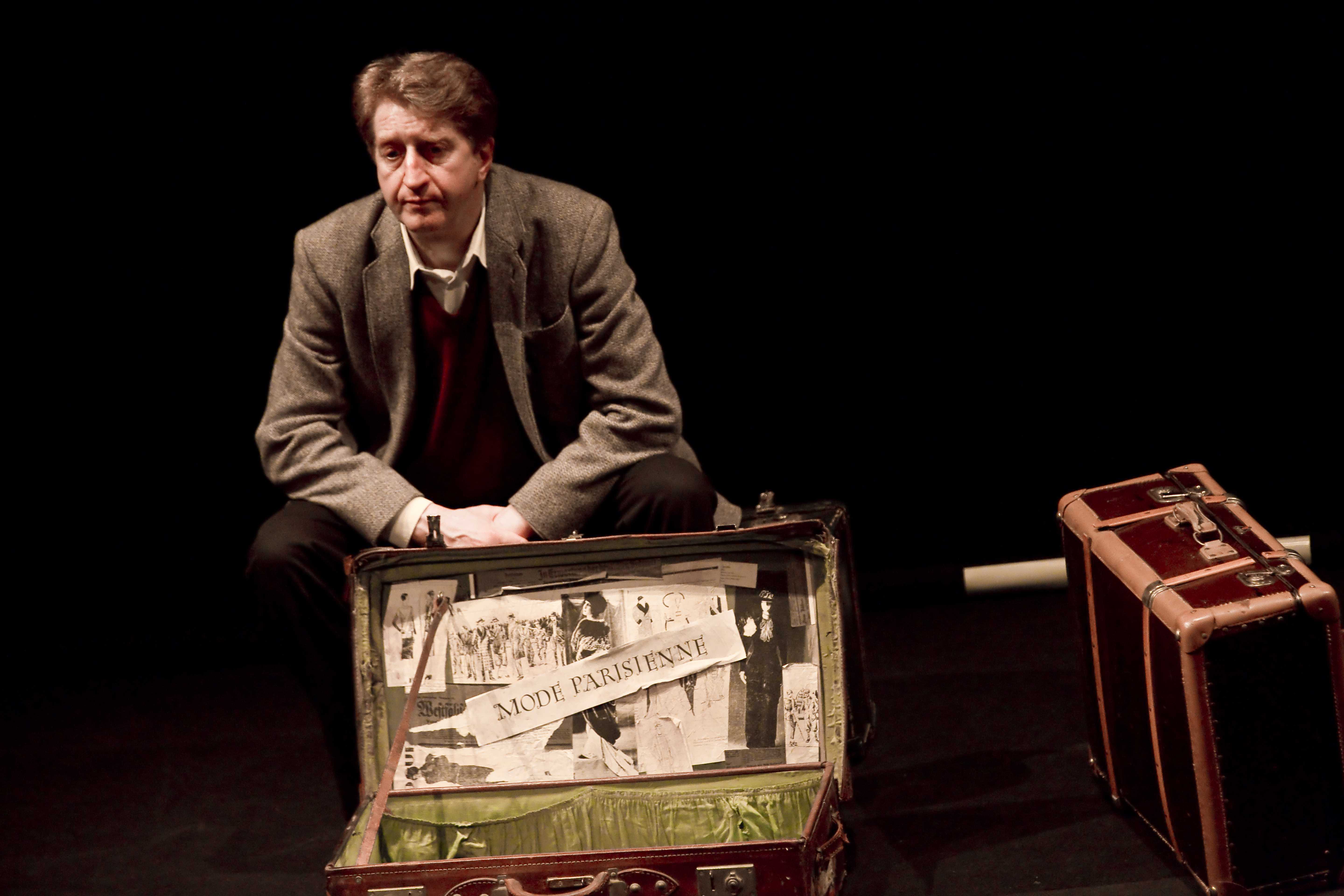 Słusznie zapowiadał reżyser, że będzie to spektakl na jednego aktora i pamięć. Aktor - narrator (znakomity Zbigniew Litwińczuk) to Izaak stary, u kresu życia, pogodny, troszkę sarkastyczny. Pamięć i zapełniający ją bliscy i dalecy, a także on sam - młody, jeszcze naiwny (ciekawy Mateusz Smaczny) - to też aktor, niczym wielogłowy stwór. Stary Izaak stoi na scenie, jego pamięć jest przed nim, jakby w ciemnej niszy. On sam jest w przestrzeni realnej, tu i teraz, na wyciągnięcie ręki. Coś wtrąci, dopowie, zwróci się do swojej pamięci albo do widzów. Pamięć jest też niby tuż obok, bardzo namacalna. A jednak daleko. Poprzez sprytne zabiegi techniczne staje się jakby trochę zawoalowana, jakby zasnuta mgiełką, przypływa, odpływa - jak wspomnienia właśnie. Stary Izaak, samotny, za kompanów mający jedynie trzy fiolki leków na sen, tęskni, zanurza się we wspomnienia, najchętniej za nimi by pobiegł. I tak właśnie w pierwszej scenie jest: gromadka postaci w czarnych żydowskich czapach, odwrócona do widzów plecami - wchodzi w mrok, Izaak za nimi spieszy, gubi walizki, prosi, by zaczekali, ale nic z tego. Już są odgrodzeni cienką siatką, troszkę przydymieni, zagarnięci przez ciemność. Choć spektakl to rzecz bardziej o człowieku i jego zmaganiach z losem niż konkretnie o dramacie narodu żydowskiego, to ta scena jest silnie symboliczna. Dawni sąsiedzi zniknęli z pejzażu, już ich nie ma, pozostał brak nie do wypełnienia. Izaakowi pozostaje więc tylko przebierać w swoich walizkach i odkurzać stare fotografie.