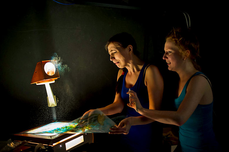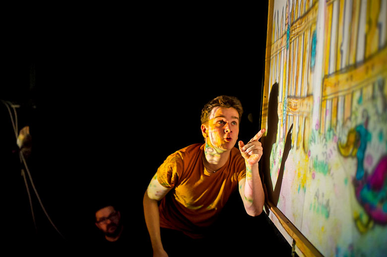 W Białostockim Teatrze Lalek baśń otacza widza natychmiast po wejściu w przestrzeń teatru - w malutkiej Sali Prób kuszą na podłodze siedzenia na kolorowych poduszkach i niepokojące malowidła na ścianach. Zaprojektowane w rysunku i kolorystyce przez Łucję Grzeszczyk pod opieką Haliny Zalewskiej–Słobodzianek. Ścienne malowidła tuż przed przedstawieniem rozpoczynają wędrówkę i ruch. Zaintrygowani mali widzowie śledzą ich przesuwanie z zainteresowaniem i uważnie. Pokazują sobie różne postacie, jakby dobrze znane, a zarazem odmienne, które - gdy zgaśnie światło - powrócą w przedstawieniu.