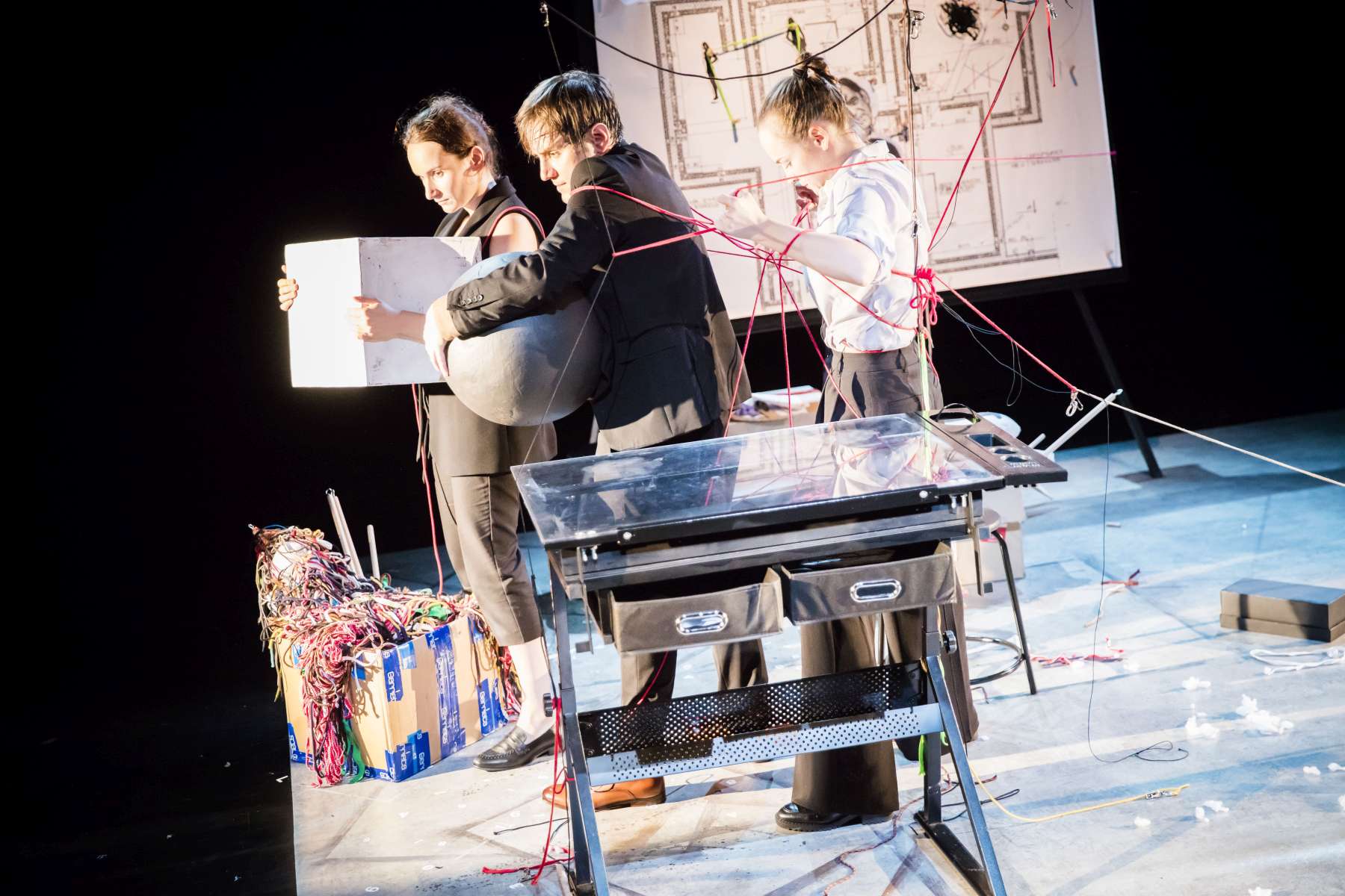 Za sprawą ich działań linie rysowane przez geometrów na papierze, swoiste porządkowanie przestrzeni, przeniesione są w przestrzeń. Aktorzy rozsnuwają sznurki, opasują nimi scenę, do sznurków przypinają niezliczoną liczbę lalek wyciętych z kartonu - twarzy, ust, rąk, lalek-poduszek, wyobrażeń wszystkich tych, którzy ze zmianą kształtu Samsy sobie nie radzą, oceniają go. Towarzystwo mówi, przekrzykuje się, to kakofonia dźwięków. To, co ma uporządkować przestrzeń, tak naprawdę wprowadza pewną opresyjność - sznurki rozpięte na scenie stają się w pewnym sensie metaforą wzajemnych zależności. Są jak wspólny krwiobieg, który z wolna zawłaszcza toksyna, a w niej: złe emocje, niechęć, odraza. Opresyjny, absurdalny klimat idealnie podbija świetna elektroniczna muzyka Anny Steli.