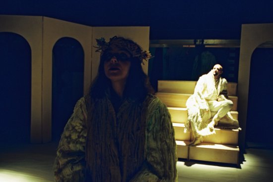 Teatralny Jurodom jest miejscem specjalnym. To przestrzeń opowieści ukrytej, niemal wydobywającej się spod ziemi, odseparowanej od widzów. W Białymstoku publiczność zasiadała na umieszczonej kilka metrów nad sceną platformie, otaczającej ją ze wszystkich stron. Biała podłoga wydobywająca się z mroku, wielkie chorągwie z ikonami, ogromne jasne płaszcze pacjentów poruszających się daleko od widza, tworzyły przestrzeń wyobrażającą jednocześnie szpital, świątynię albo salę skalnego pałacu. Centralny Basen Artystyczny, gdzie spektakl został zagrany w ramach festiwalu, zdusił pierwotnie wykreowany majestat miejsca i zmienił relacje między widownią i aktorami. Szkoda, bo właśnie architektura spektaklu, ustawienie perspektywy, w której widownia zamienia się w swoistą arenę, stanowi główny walor tego, całkowicie rozgrywanego w żywym planie, widowiska.
