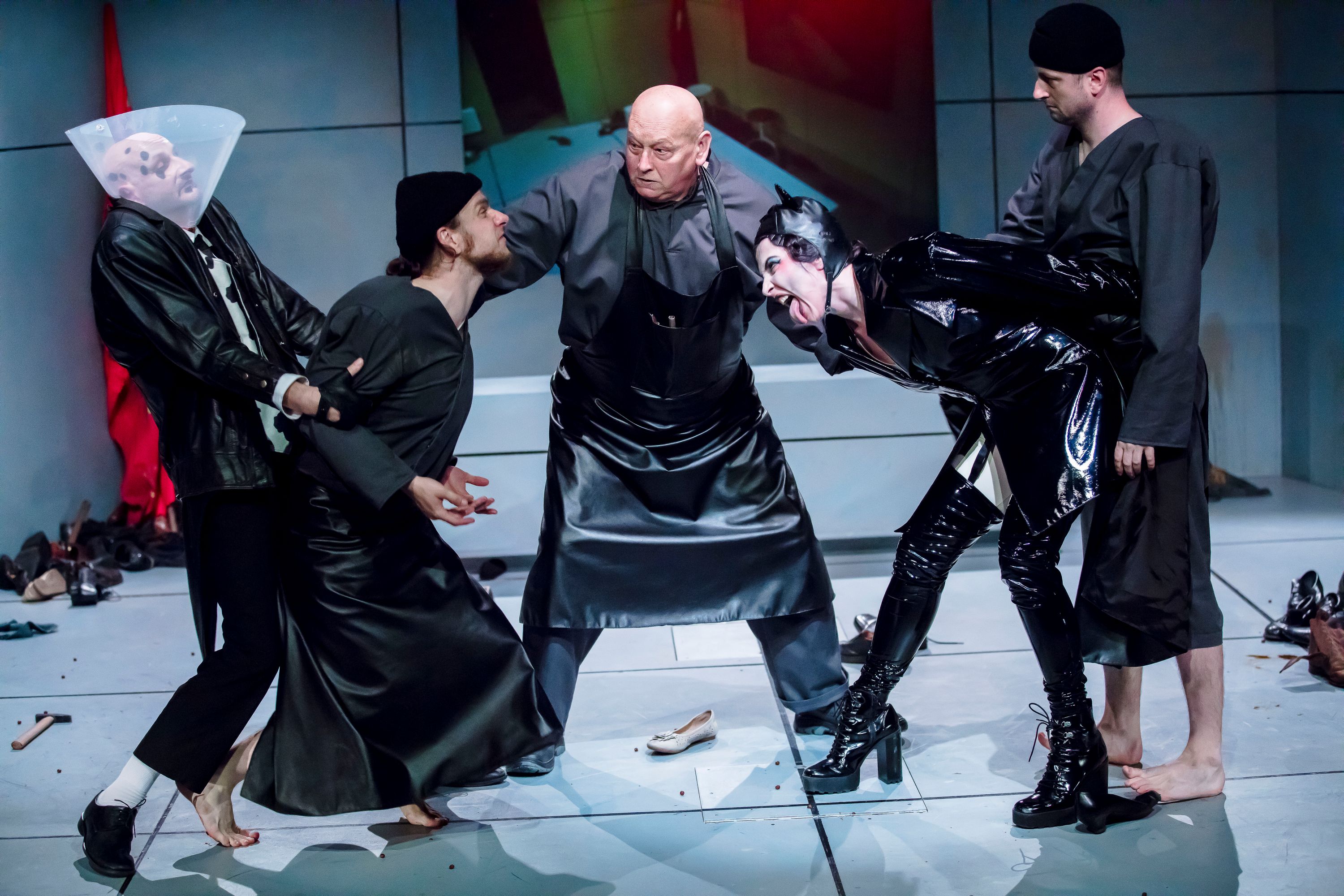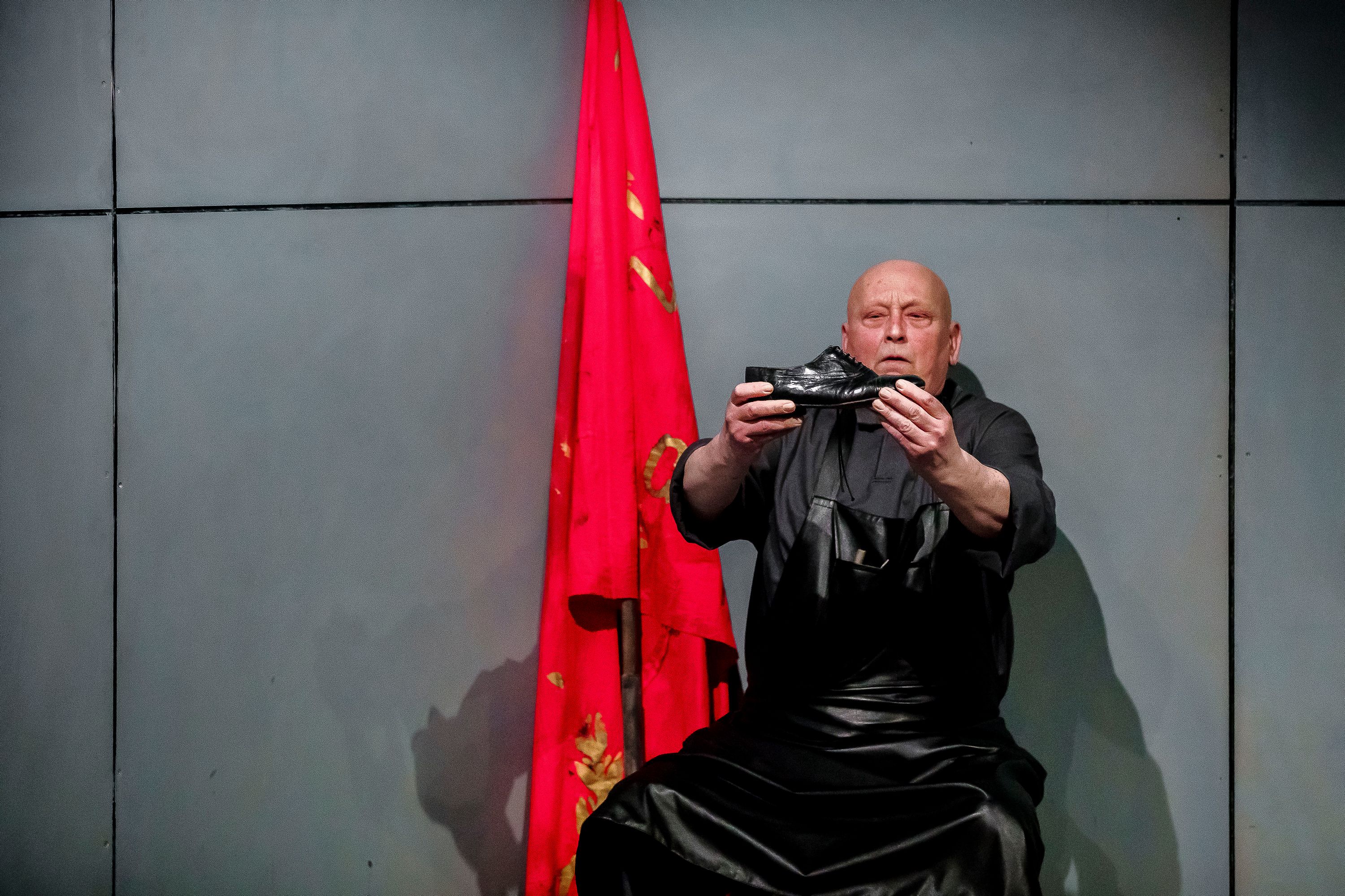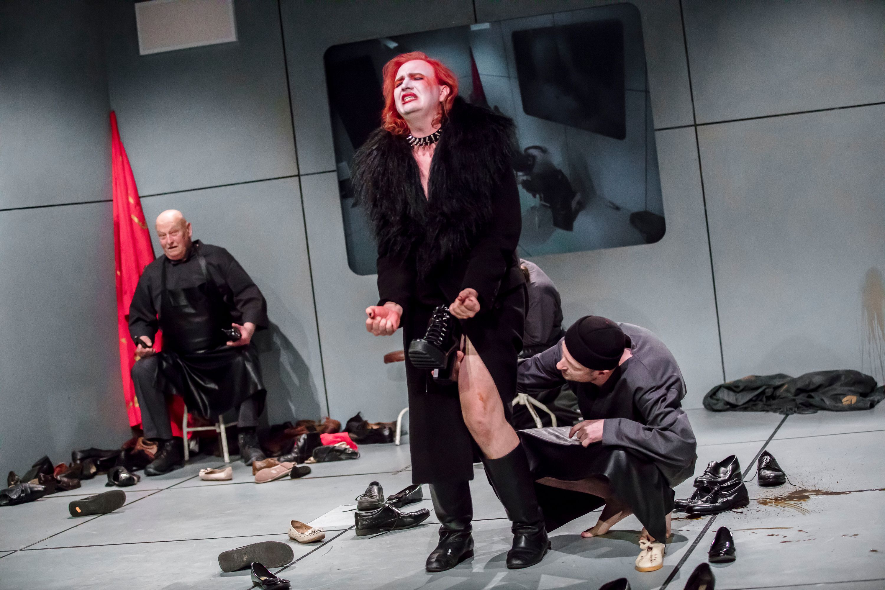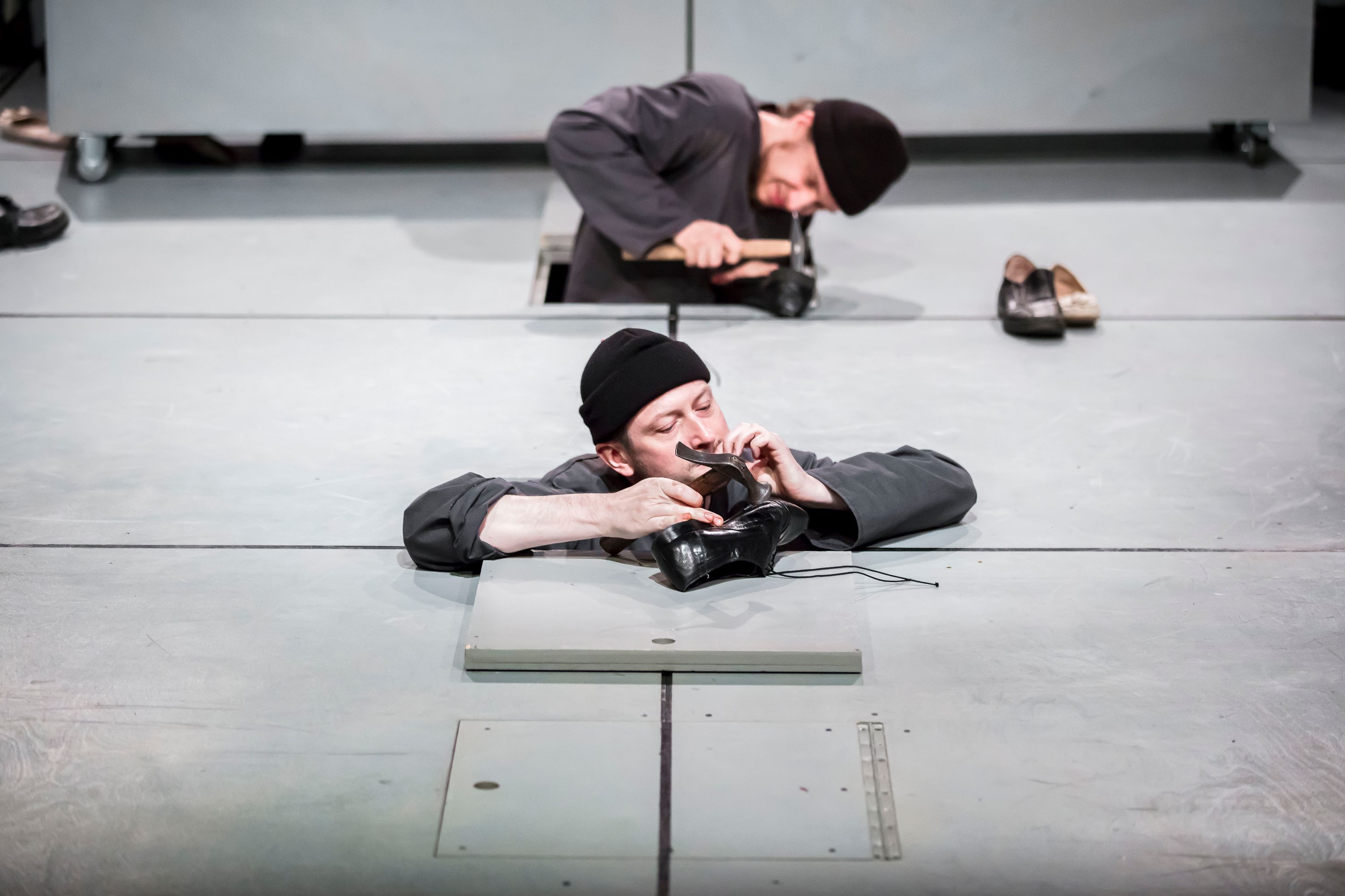 W jednej chwili szara przestrzeń może być pokoiczkiem w suterenie, gdzie szewcy pracowicie stukają w obcasy, w drugiej – kapitalistyczną fabryczką butów, w której praca już odbywa się taśmowo (świetna inscenizacyjnie scena z przesuwającymi się na czerwonej materii butami). A po drodze jeszcze może być miejscem kolejnych rewolucji, zawirowań i zawłaszczeń. A te następują błyskawicznie, tu każdy czegoś chce, ma swoje pragnienia i ciągoty.