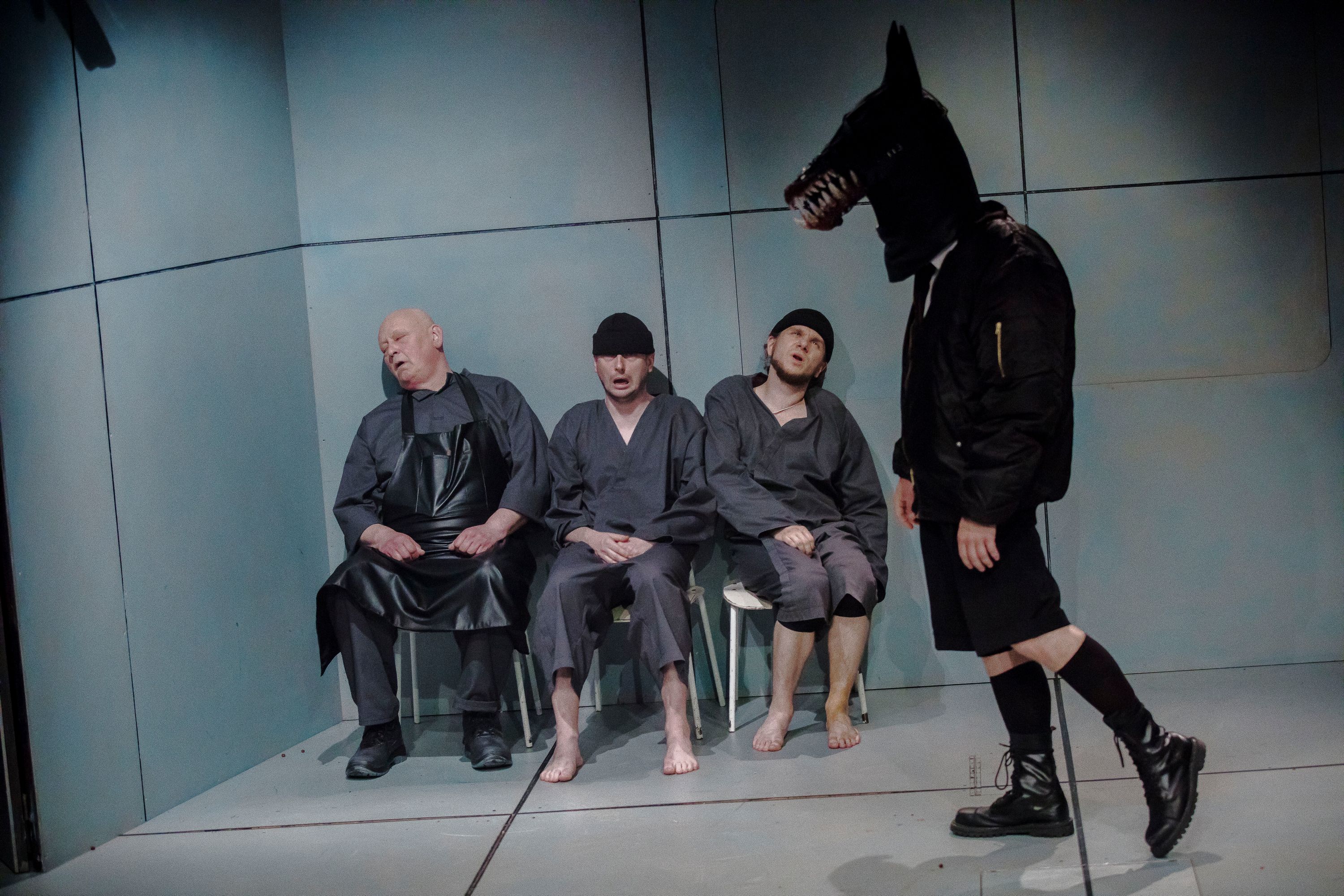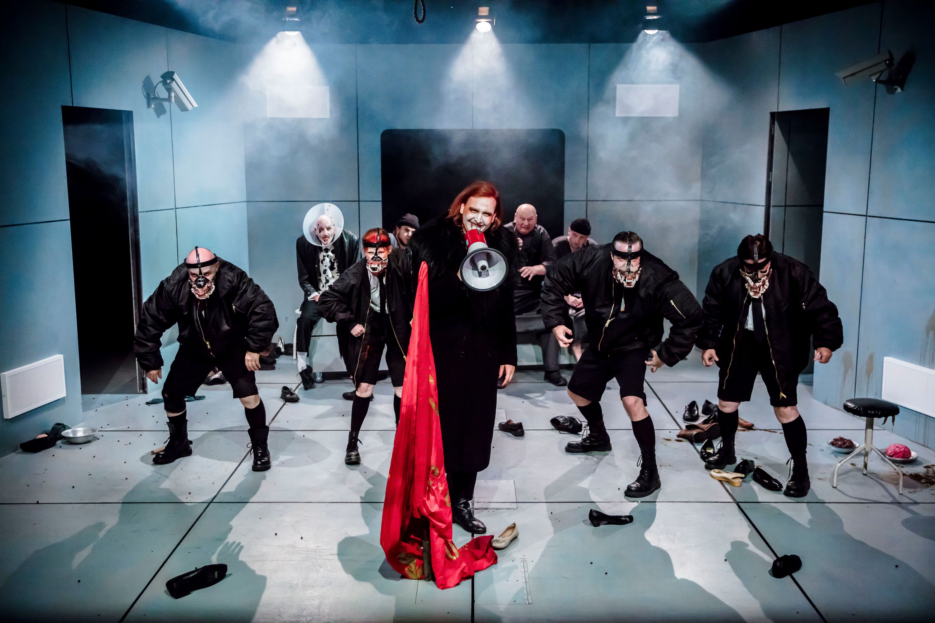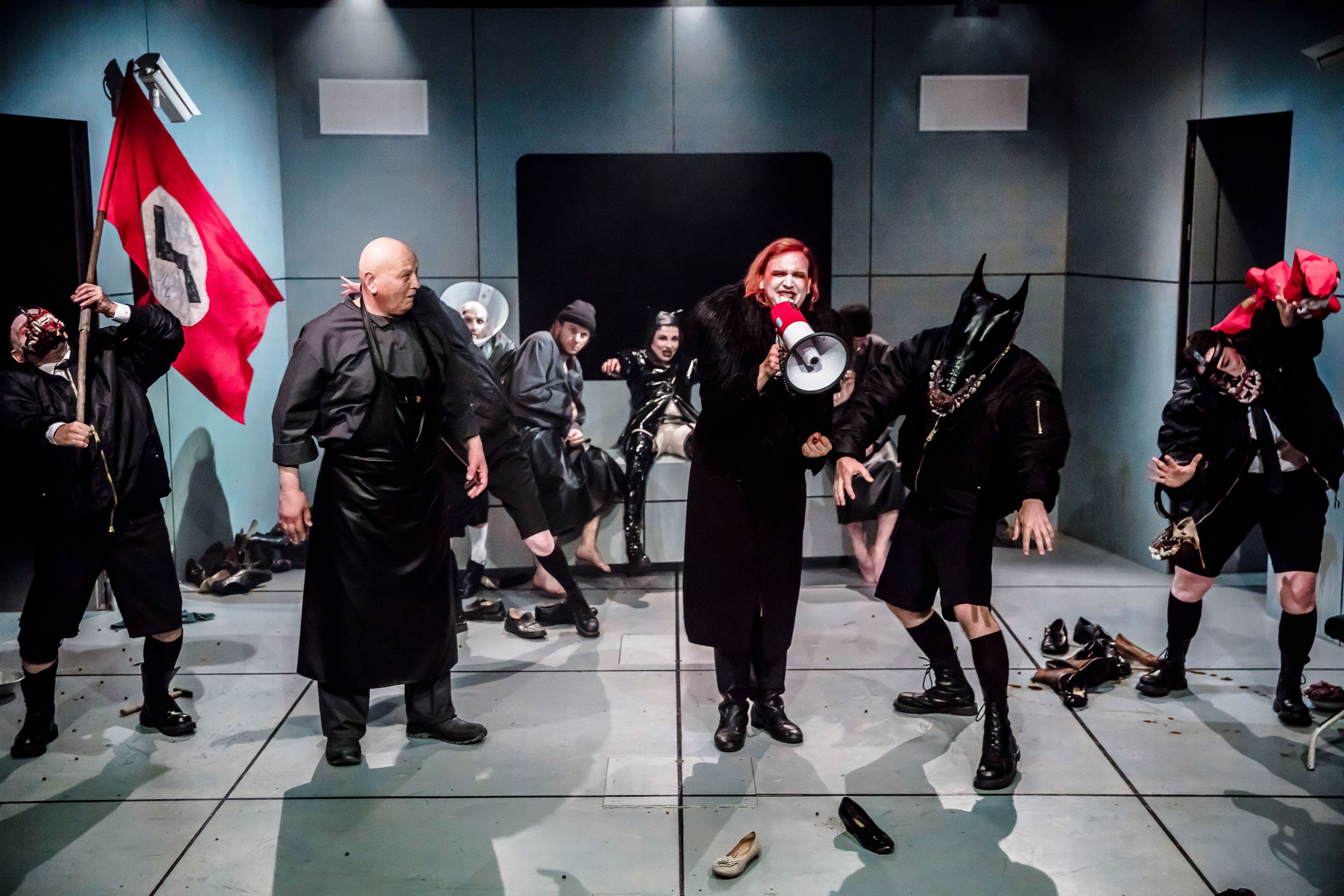 To istna menażeria i przerażająca scena doskonale, w groteskowy sposób pokazująca, z czym mamy do czynienia obecnie, gdy nacjonalistyczne bojówki mają się doskonale i przy aprobacie władzy przez kraj maszerują z faszystowskim wrzaskiem i nienawistnymi hasłami na transparentach. W spektaklu BTL dziarscy chłopcy nie są może tak dosłowni, ale za to bardzo czytelni: poprzez charakterystyczny strój, sztandary, zachowanie (świetne kostiumy i scenografia Mariki Wojciechowskiej). Oraz – tu licentia poetica twórców spektaklu – maski-szczęki na twarzach upodabniające ich do psiej lub wilczej watahy, ujadającej, wymarzonej do szczucia, bicia i nienawiści na zamówienie. Dziarscy chłopcy w swoich kagańcach i podrygiwaniu niczym psy szykujące się do skoku są i śmieszni, i straszni, z naciskiem niestety na straszni.