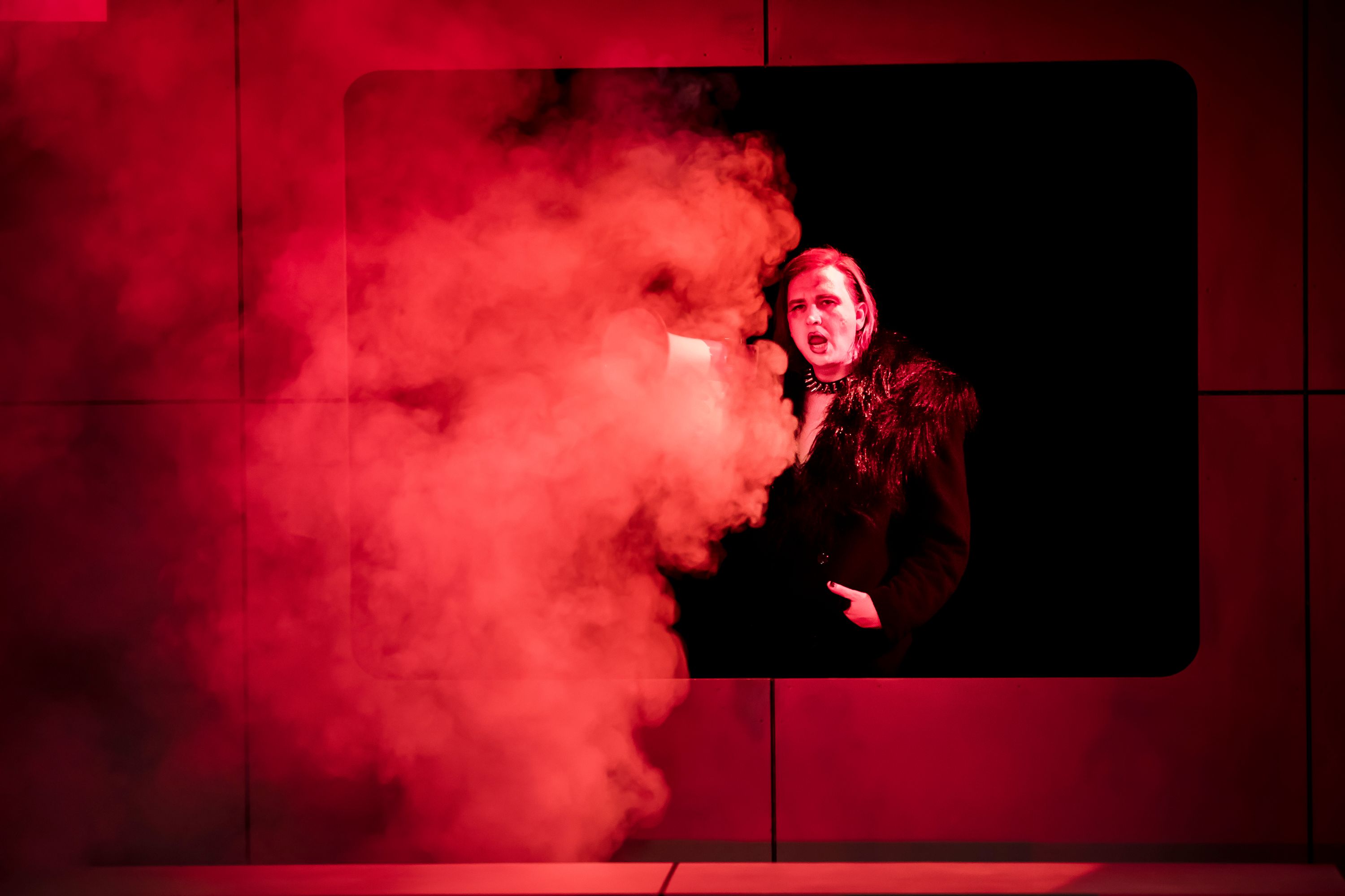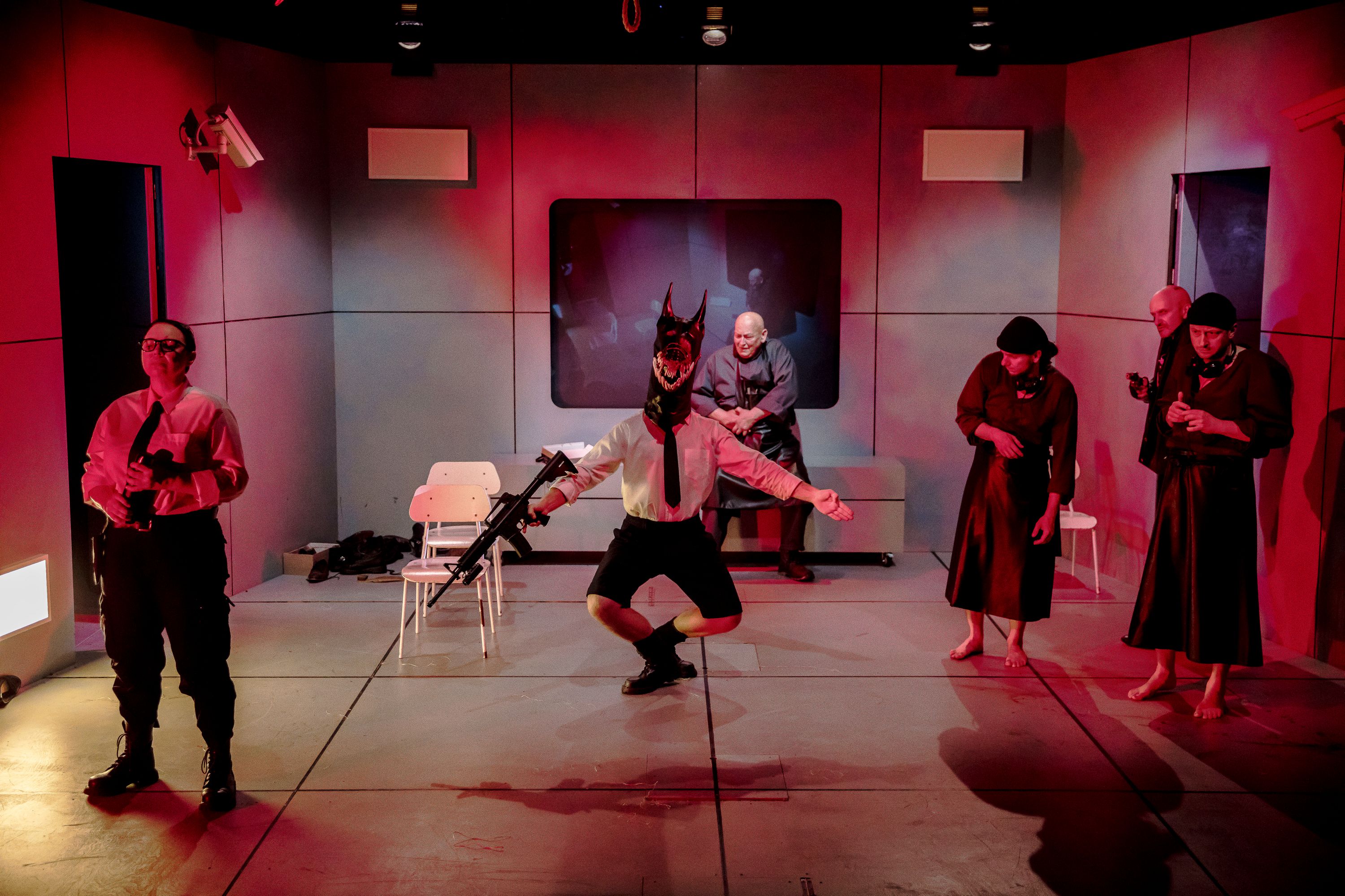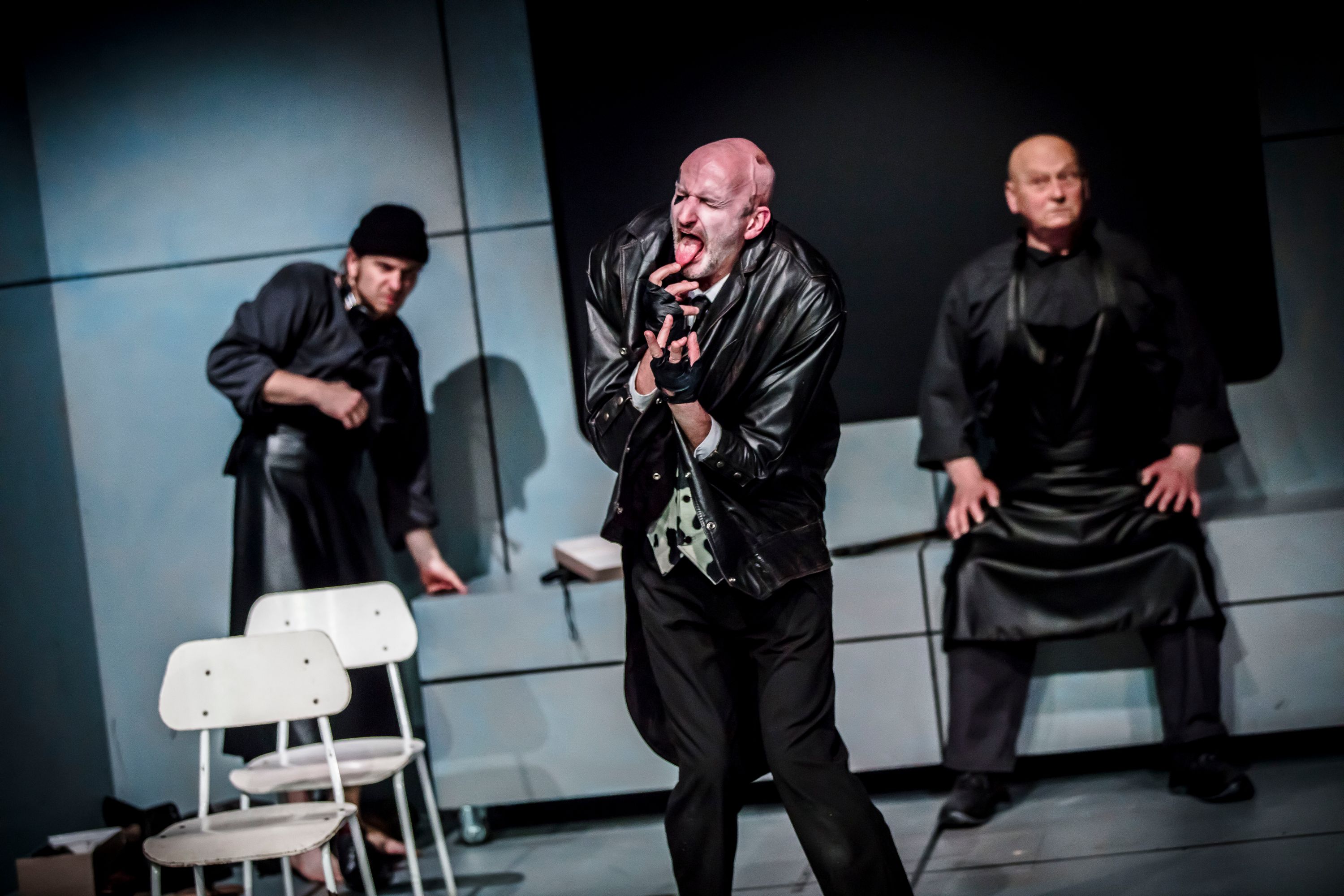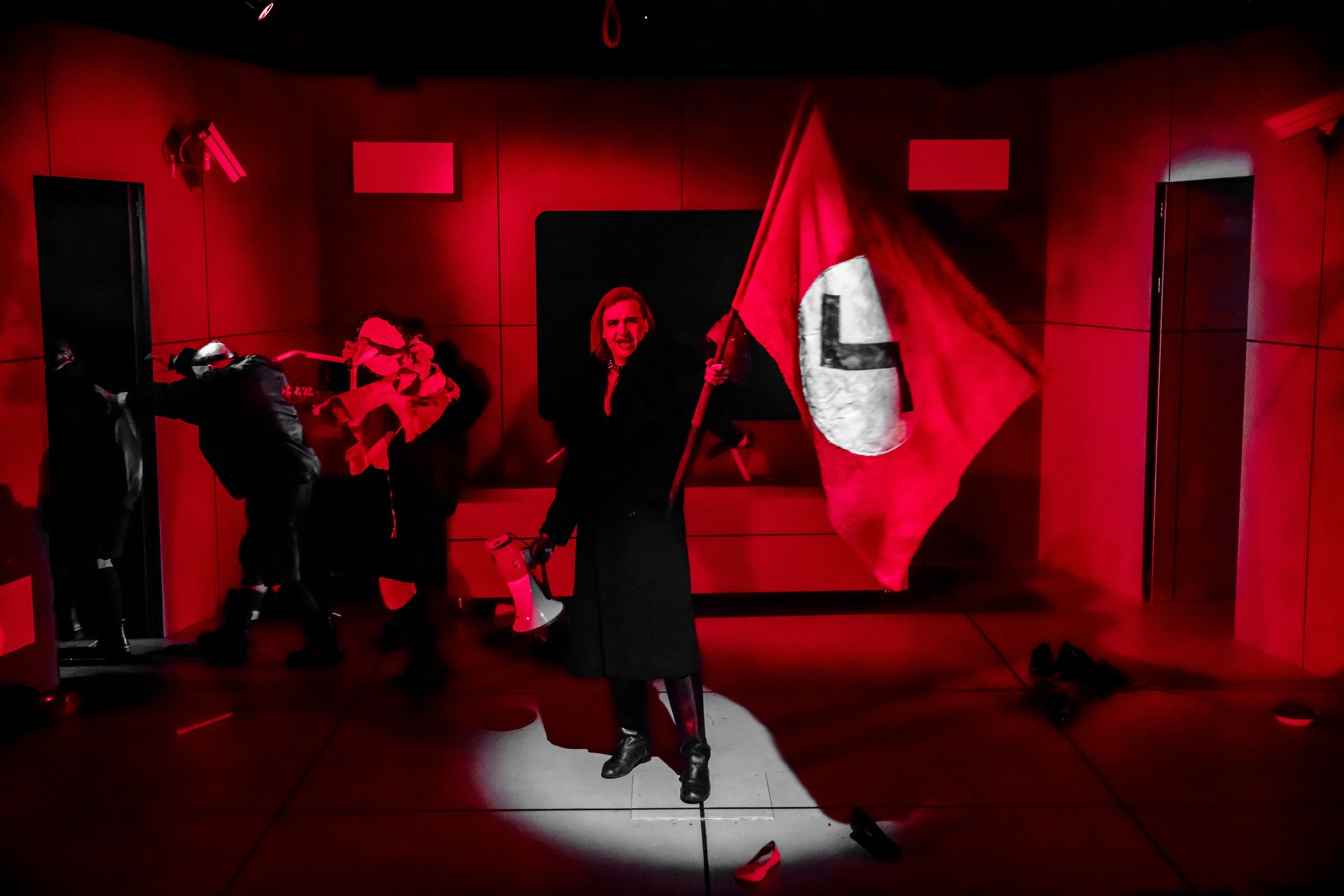 To istna menażeria i przerażająca scena doskonale, w groteskowy sposób pokazująca, z czym mamy do czynienia obecnie, gdy nacjonalistyczne bojówki mają się doskonale i przy aprobacie władzy przez kraj maszerują z faszystowskim wrzaskiem i nienawistnymi hasłami na transparentach. W spektaklu BTL dziarscy chłopcy nie są może tak dosłowni, ale za to bardzo czytelni: poprzez charakterystyczny strój, sztandary, zachowanie (świetne kostiumy i scenografia Mariki Wojciechowskiej). Oraz – tu licentia poetica twórców spektaklu – maski-szczęki na twarzach upodabniające ich do psiej lub wilczej watahy, ujadającej, wymarzonej do szczucia, bicia i nienawiści na zamówienie. Dziarscy chłopcy w swoich kagańcach i podrygiwaniu niczym psy szykujące się do skoku są i śmieszni, i straszni, z naciskiem niestety na straszni.