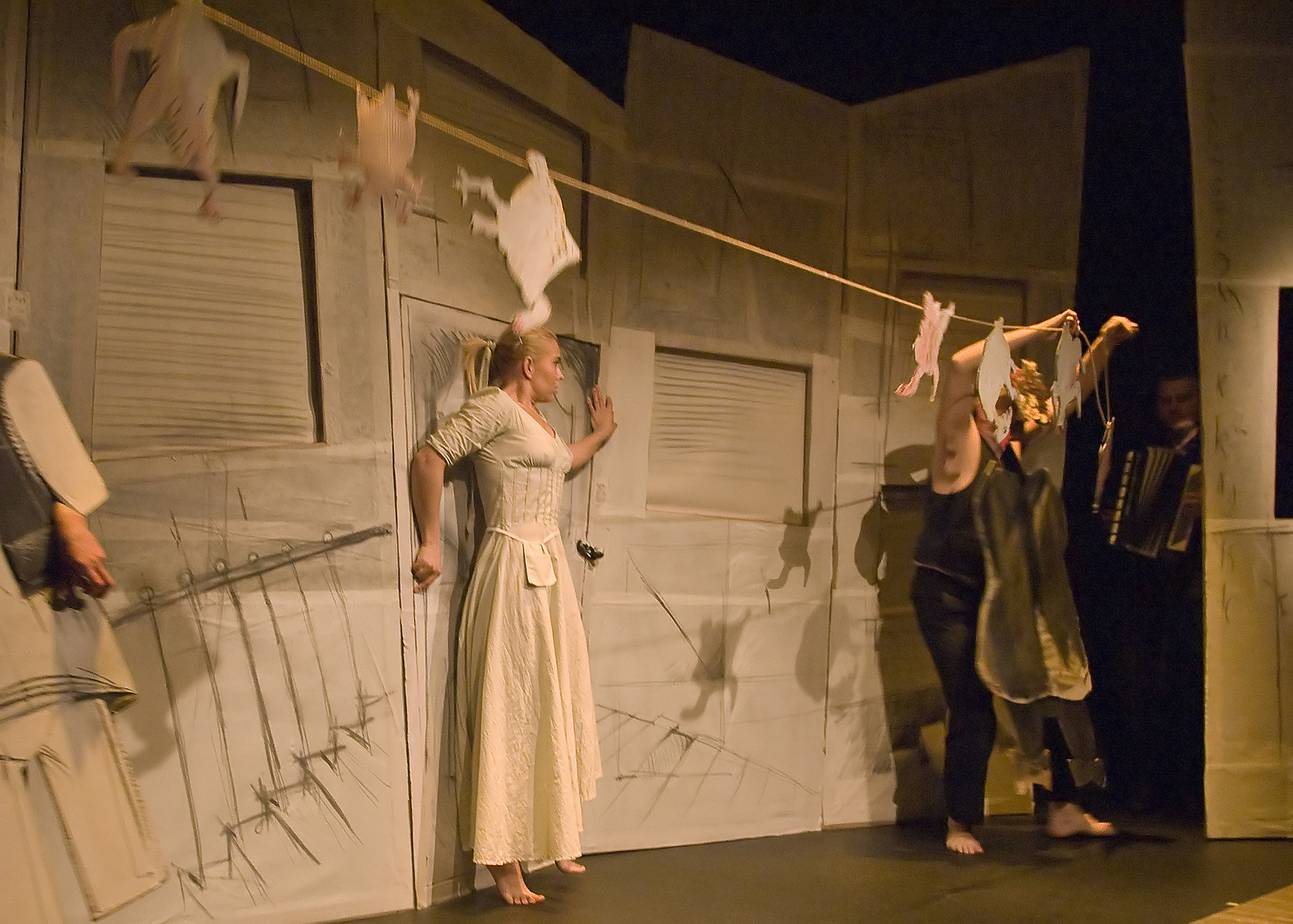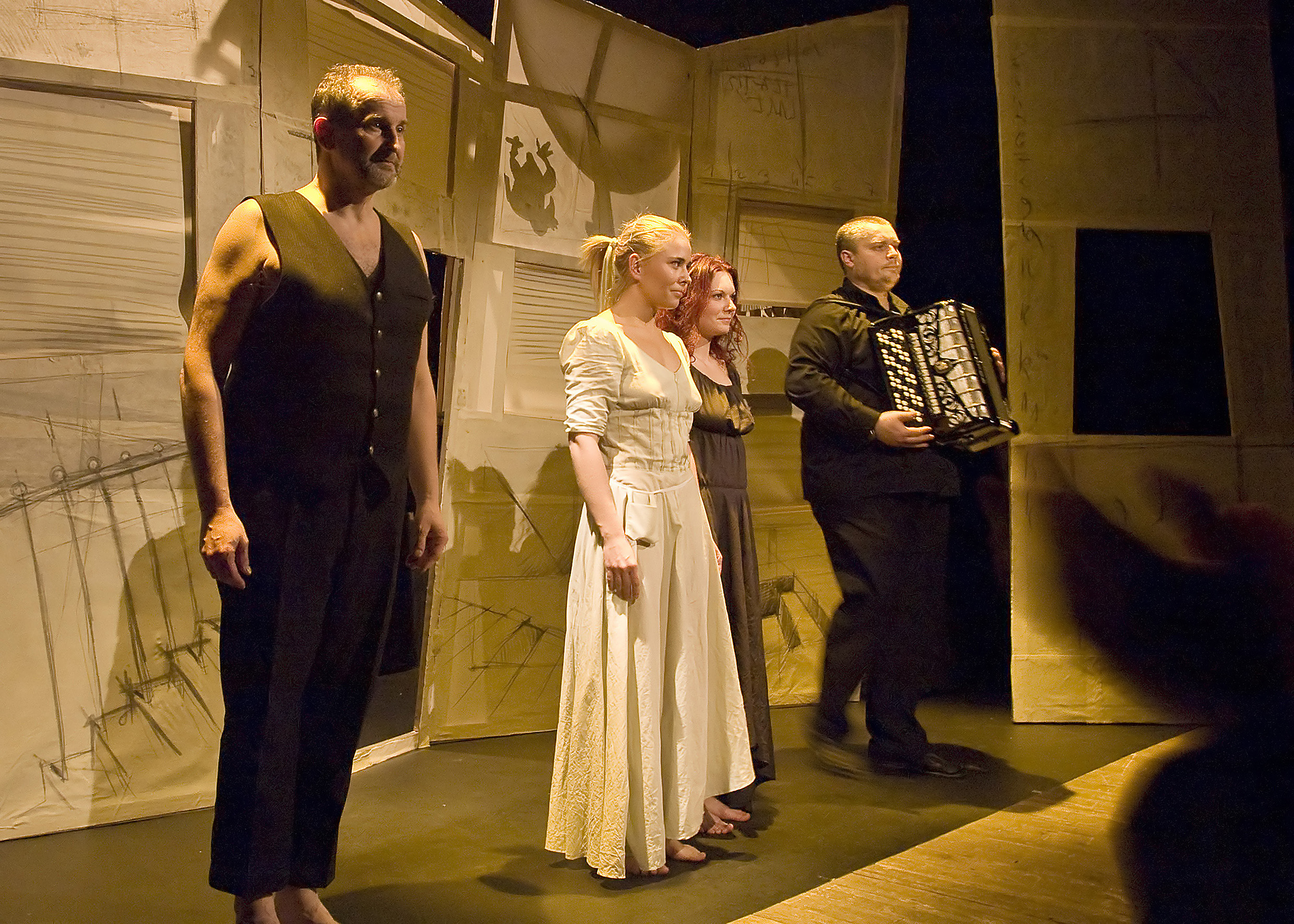 Cały zespół aktorski - Agnieszka Sobolewska, Magdalena Czajkowska oraz Wiesław Czołpiński - świetnie poradził sobie z tą konwencją. Grają oni razem blisko piętnaście postaci, jednak zamiany ról są wręcz nieodczuwalne dla widza. Pełna epizodów historia, dramatyzm rodzący się w spotkaniu ciała aktora z papierową formą, bijące ze sceny emocje - wszystko to oparte zostało na spokojnej, stonowanej grze aktorskiej. Ta misternie utkana struktura emocjonalna rozpadłaby się jednak bez muzyki Krzysztofa Dziermy, wykonywanej na akordeonie przez Roberta Jurćo. Podobnie jak w Murdasie, jest on nie tylko akompaniatorem, uczestniczy również w akcji, a płaczliwy jęk jego akordeonu guzikowego czy przeraźliwe tremola, grane w górnym rejestrze, poszerzają siłę i skalę oddziaływania scenicznego świata.