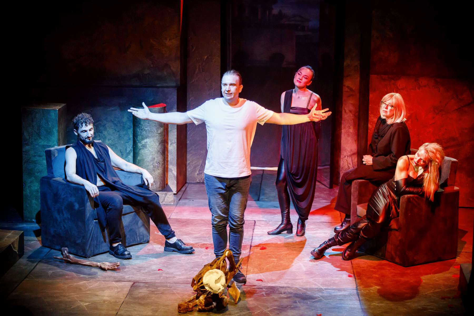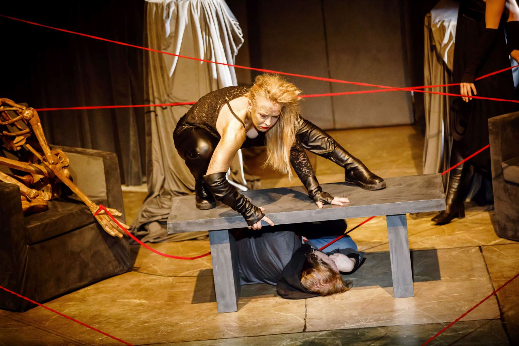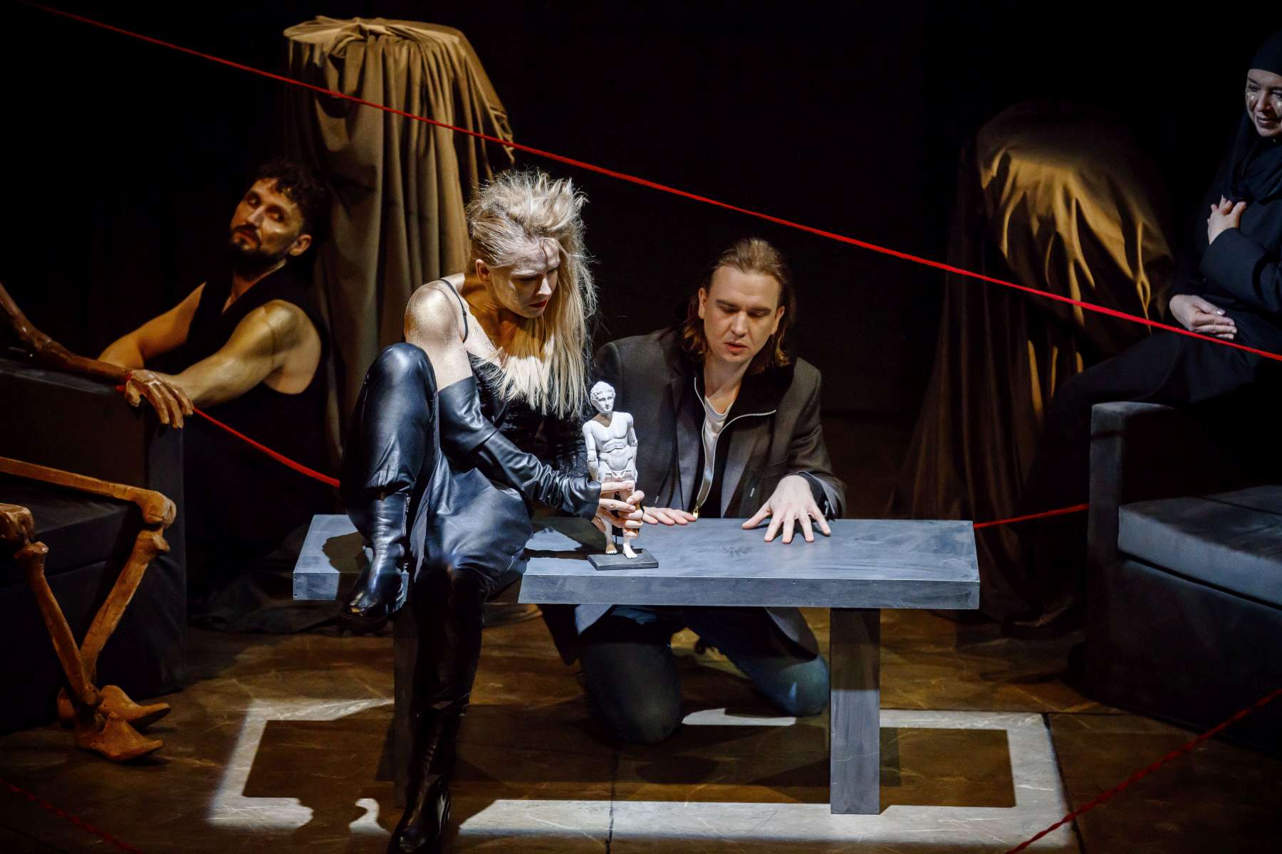 W spektaklu takich podwójnych, ciekawie zagranych i pokazanych konceptów jest więcej. Są dwie siostry, niczym dwie twarze jednej kobiety: mroczna uwodzicielska Fedra, która namiętnie kusi (Agnieszka Sobolewska) i niewinna delikatna Ariadna (Agata Stasiulewicz). Jest dwóch nieobecnych ojców – i Tezeusza, i Michała. Są dwie matki (w obu rolach Ewa Żebrowska): mityczna Ajtra, puszczająca młodziutkiego Tezeusza wolno w świat, i matka Michała, szalejąca z niepokoju, gdy nie może się skontaktować z synem. A w finale z nim wreszcie spokojnie rozmawiająca. To scena, w której po intensywnych obrazach historia wreszcie spowalnia. Scena dość istotna – Michał dzieli się wreszcie z nią tym, co w sobie długo krył. I w której zwraca się też do wszystkich zagubionych młodych ludzi, jeszcze skulonych w twardej skorupie.