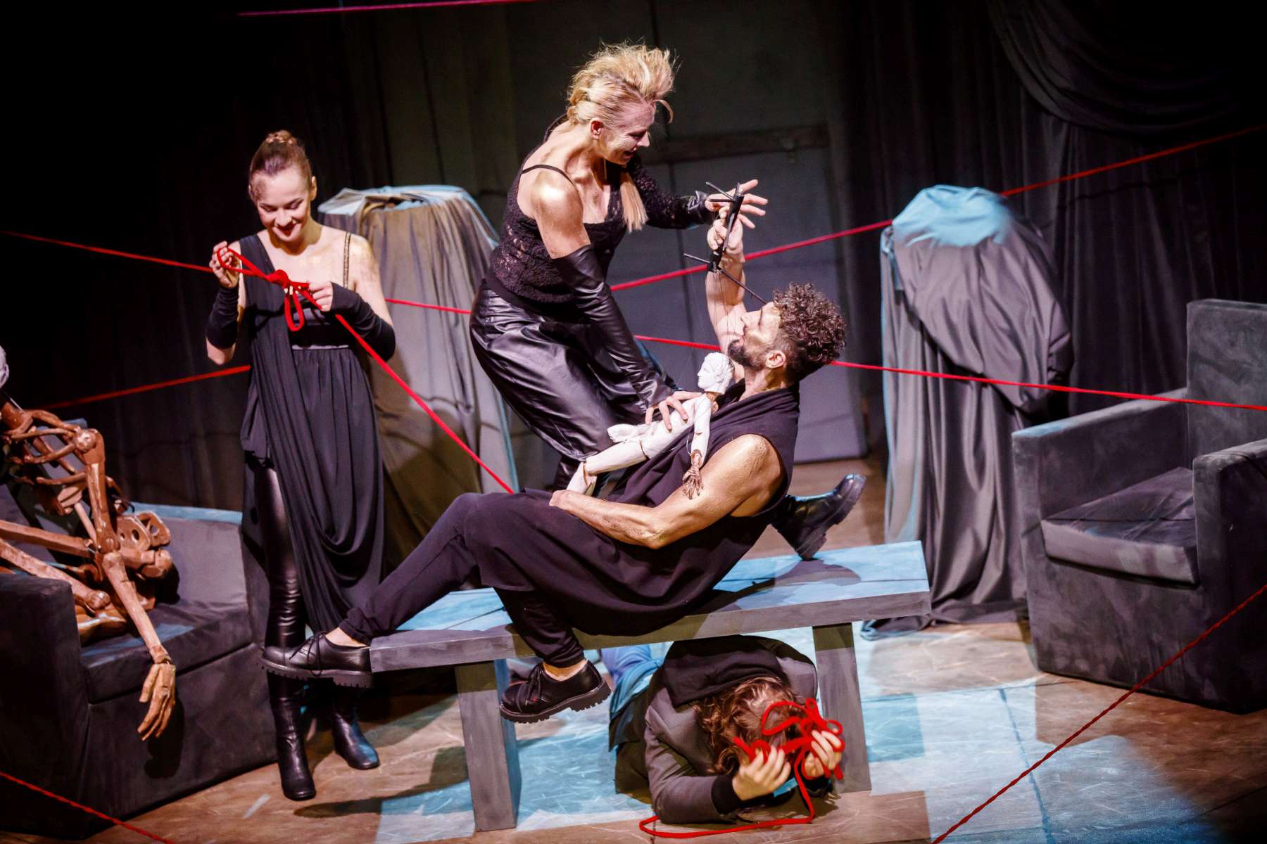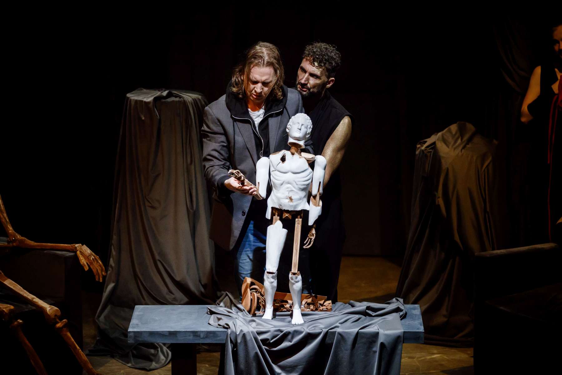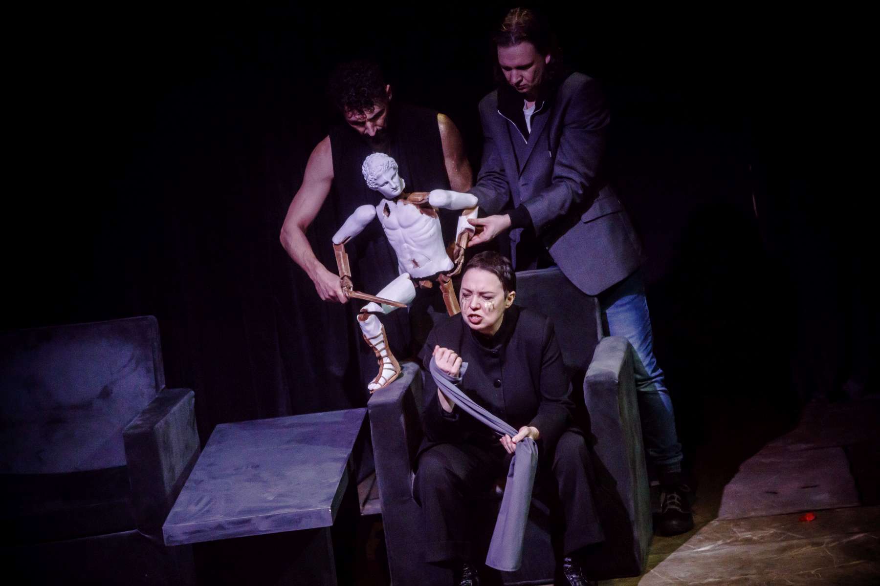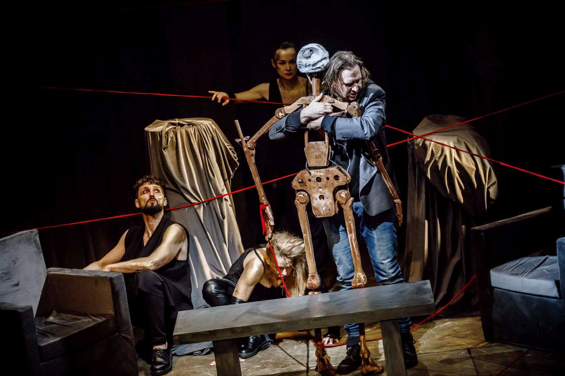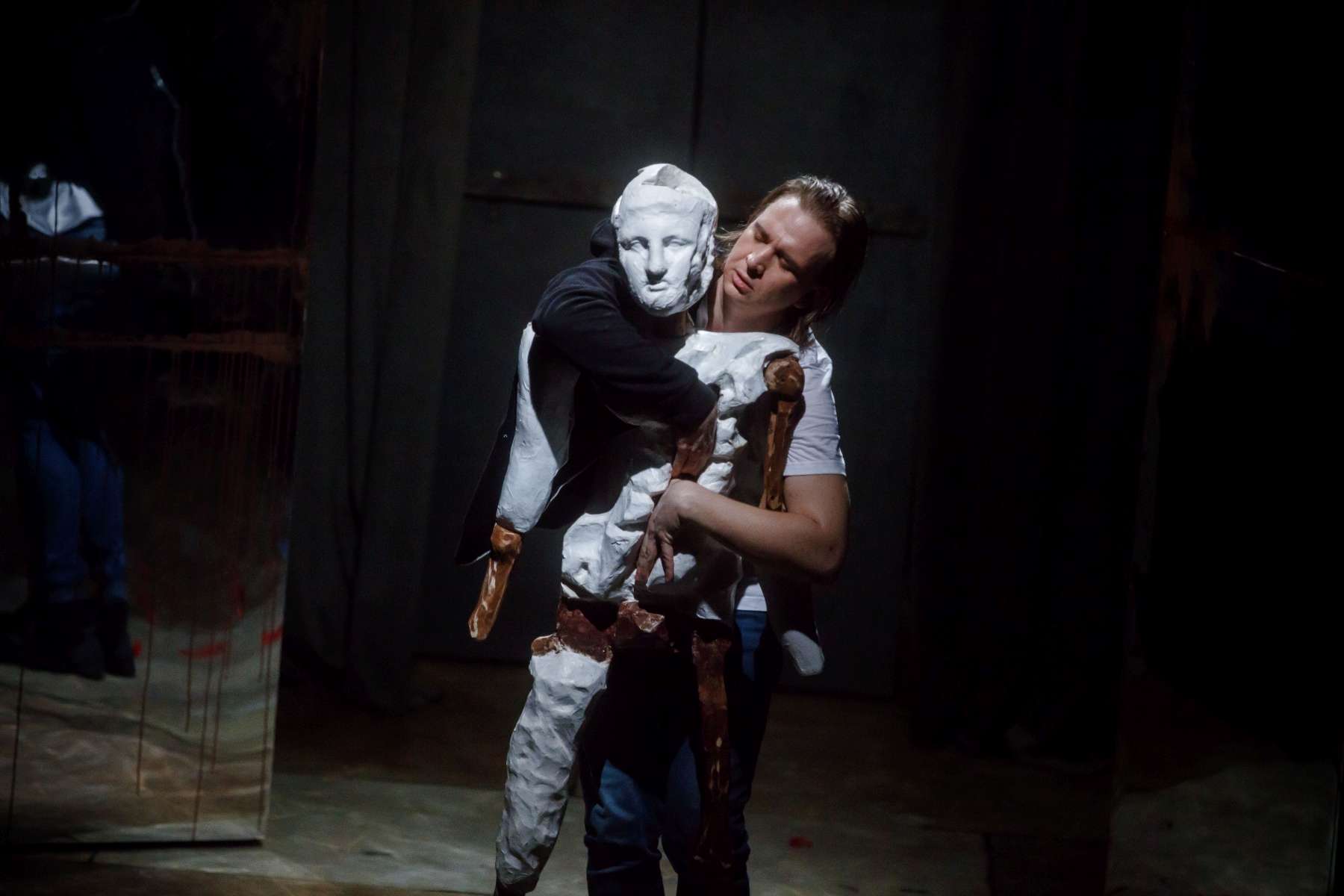 Michał kruszeje, rozpada się na kawałki, umysł swoje, ciało swoje, to, co ukrywane, tłumione, jeszcze gdzie indziej. Jak to wszystko znów skleić w jedną całość? Jak pokazać powrót emocji do ciała, moment, w którym umysł znów nawiązuje z nim kontakt? Nie jest to proste. Ciężar animacyjny spoczywa tu na Błażeju Piotrowskim i Jacku Dojlidce, bo to oni muszą pokazać przemianę głównego bohatera i rozdział umysłu i ciała. Robią to ciekawie – m.in. animując razem jedną lalkę, walcząc z nią pojedynczo, a czasem też animując siebie nawzajem. Jak w scenie, w której skrywane emocje, sugestywnie interpretowane przez Jacka Doljlidkę, atakują i do Michała wracają. Lub w scenie, w której obaj w ironiczny sposób przywołują wspomnienie nieobecnego ojca, wyrzucając swoją złość i żal.