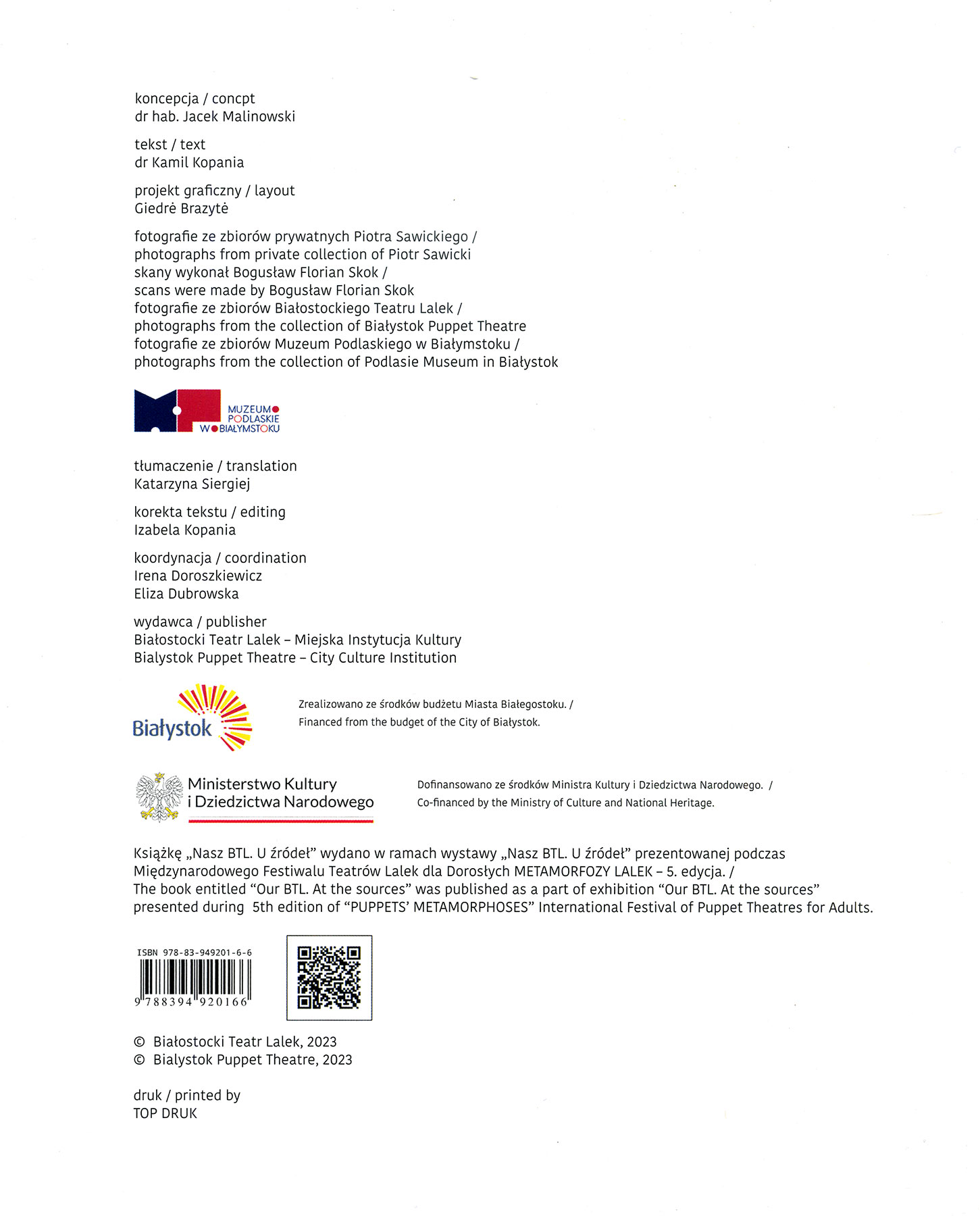 oddajemy w Wasze ręce kolejny tom wydawnictwa „Nasz BTL”. Jest z pewnością wyjątkowy, bo zrealizowany specjalnie na 70. urodziny wyjątkowego Teatru, tworzonego przez lata przez wyjątkowych ludzi oddanych sztuce i kulturze. Dziś wracamy do źródeł, do początku. W to piękne święto naszej BTL-owej społeczności przybliżamy postać niezwykłą - Piotra Sawickiego - ojca założyciela Teatru Lalek w Białymstoku. To zachęta do poznania wszechstronnego artysty, społecznika i patrioty, którego charyzmatyczna postawa i determinacja doprowadziły do powstania instytucji niezwykłej. W przeciągu siedemdziesięciu lat, z działań amatorskich, teatru marionetek, a potem z Teatru „Świerszcz”, wyrósł Białostocki Teatr Lalek, instytucja wyróżniająca miasto, region oraz kraj. W to piękne święto, w 70. urodziny Białostockiego Teatru Lalek, życzę wszystkim artystom, ludziom kultury, niegdysiejszym i obecnym pracownikom BTL-u, a także naszym widzom i mecenasom, nieustannej miłości do sztuki i teatru, człowieka w jego humanistycznej odsłonie, jego twórczości w blaskach i cieniach. Niech teatr łączy! Niech będzie spotkaniem człowieka z człowiekiem, po obu stronach rampy! Niech będzie cudownym miejscem ożywiania martwej materii!